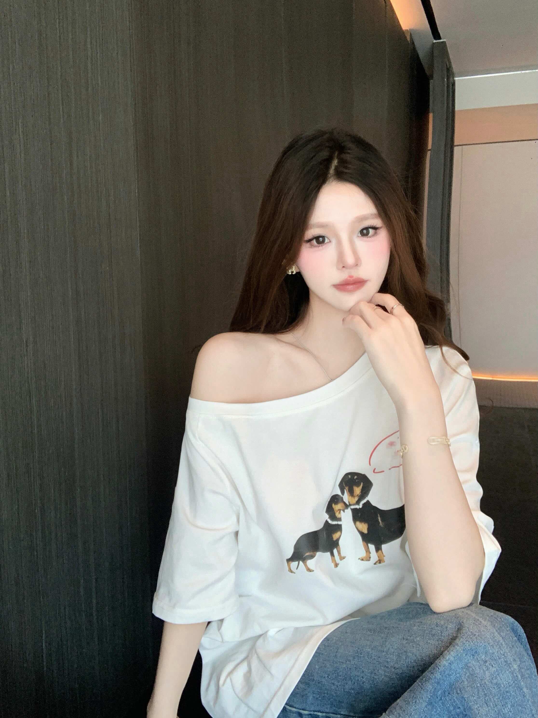MY6553# 狗狗印花斜肩短袖T恤女中长款宽松慵懒风休闲上衣女裝貨源服裝批發