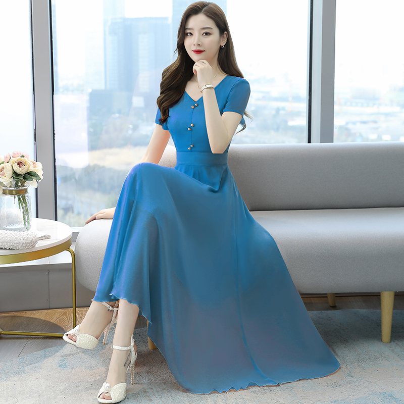MY6925# 夏季新款连衣裙修身气质V领大摆雪纺沙滩连衣长裙女裝貨源服裝批發