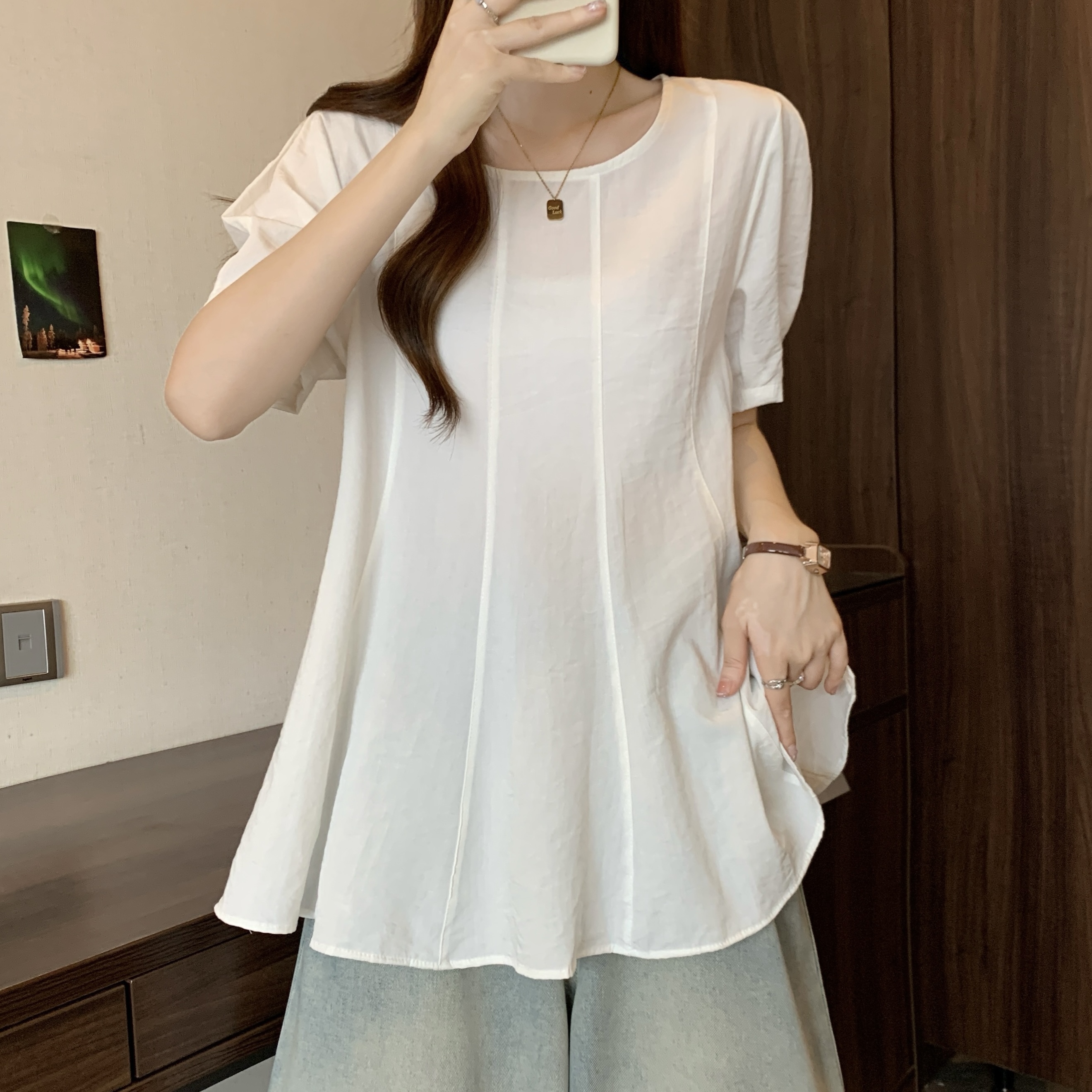 MY7005# 大码气质减龄正肩圆领纯色娃娃衫女夏季胖MM巨显瘦短袖衬衫上衣女裝貨源服裝批發