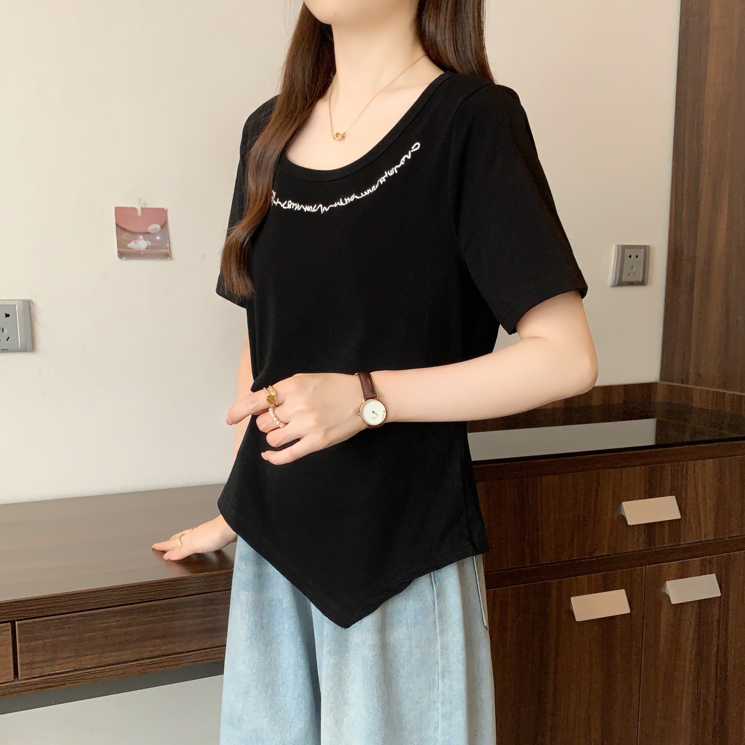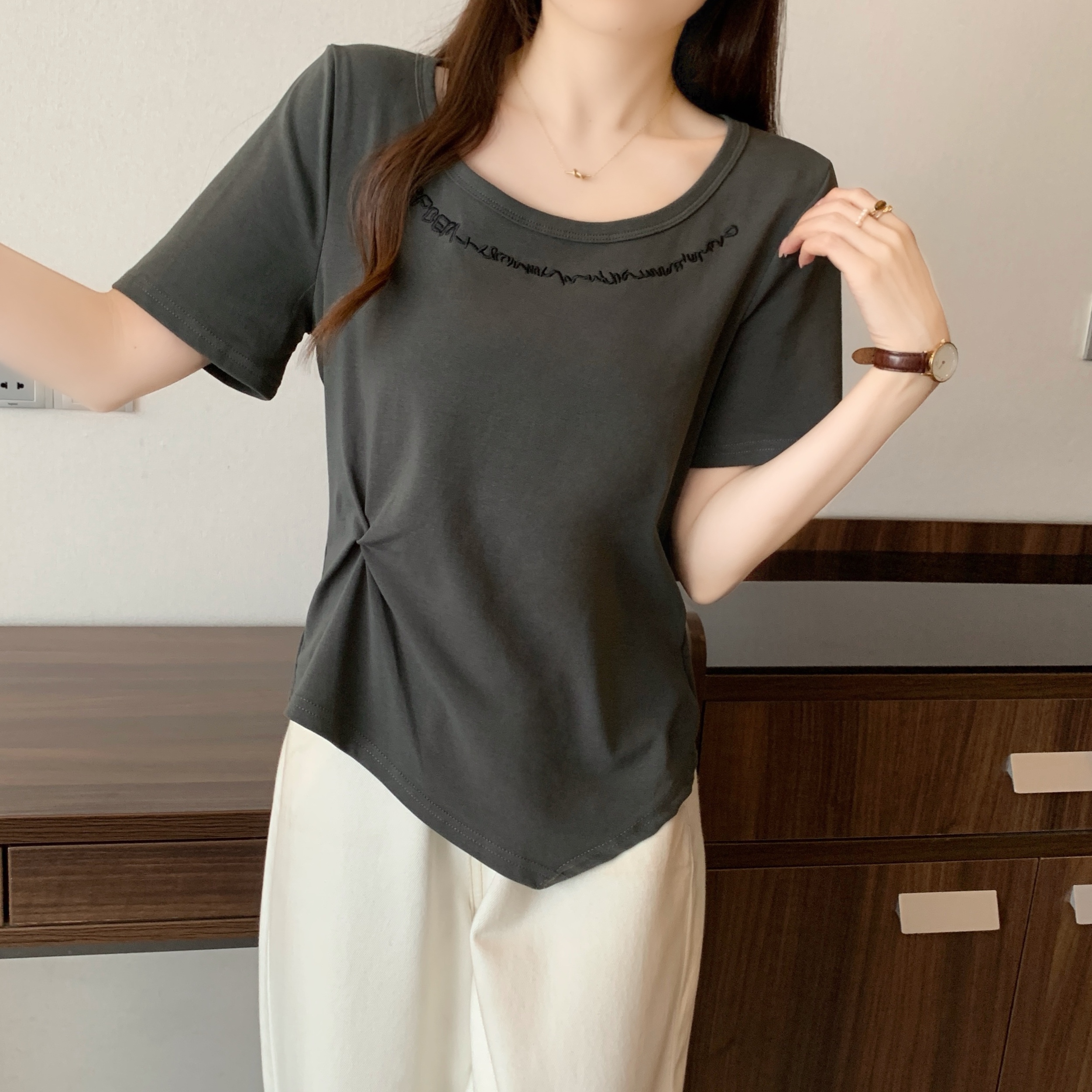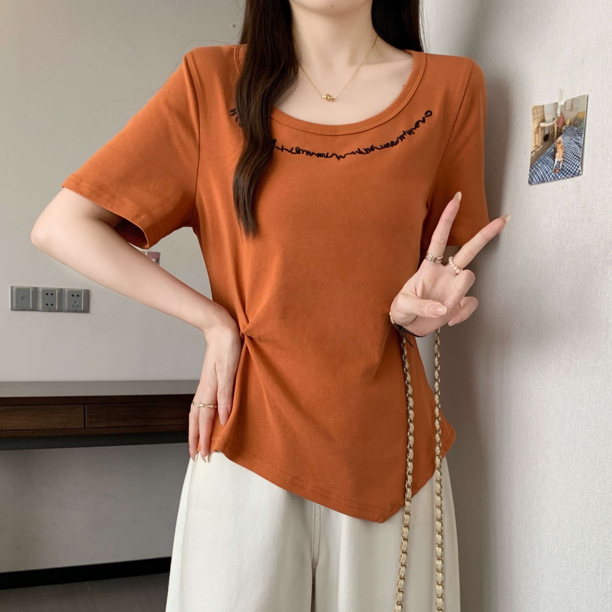 MY165# 夏季新款韩系百搭圆领短袖T恤女设计感短款纯棉打底衫女裝貨源服...