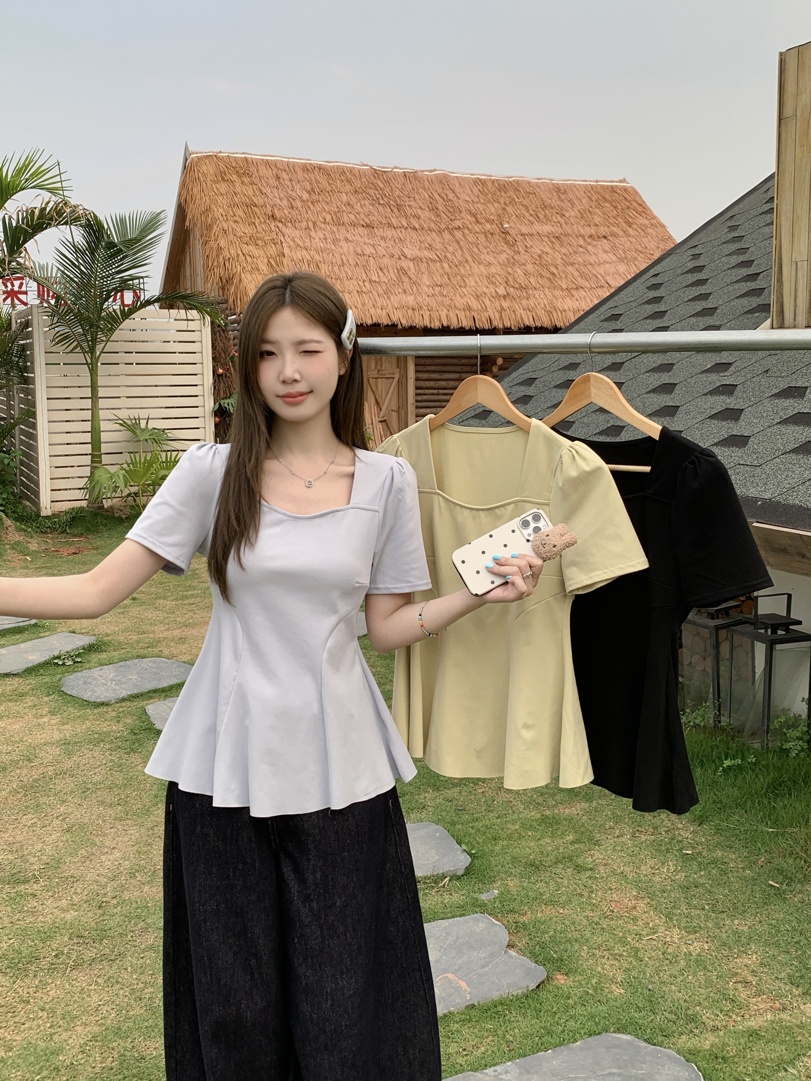 MY7038# 夏装新款胖mm大码收腰百褶下摆短袖T恤纯欲方领正肩上衣女裝貨源服裝批發