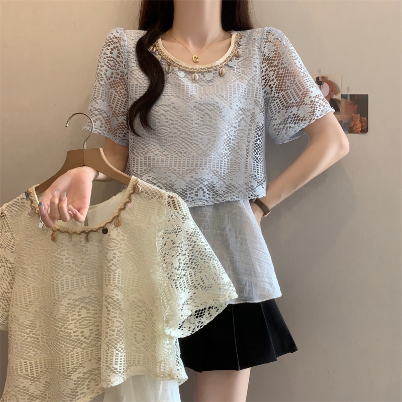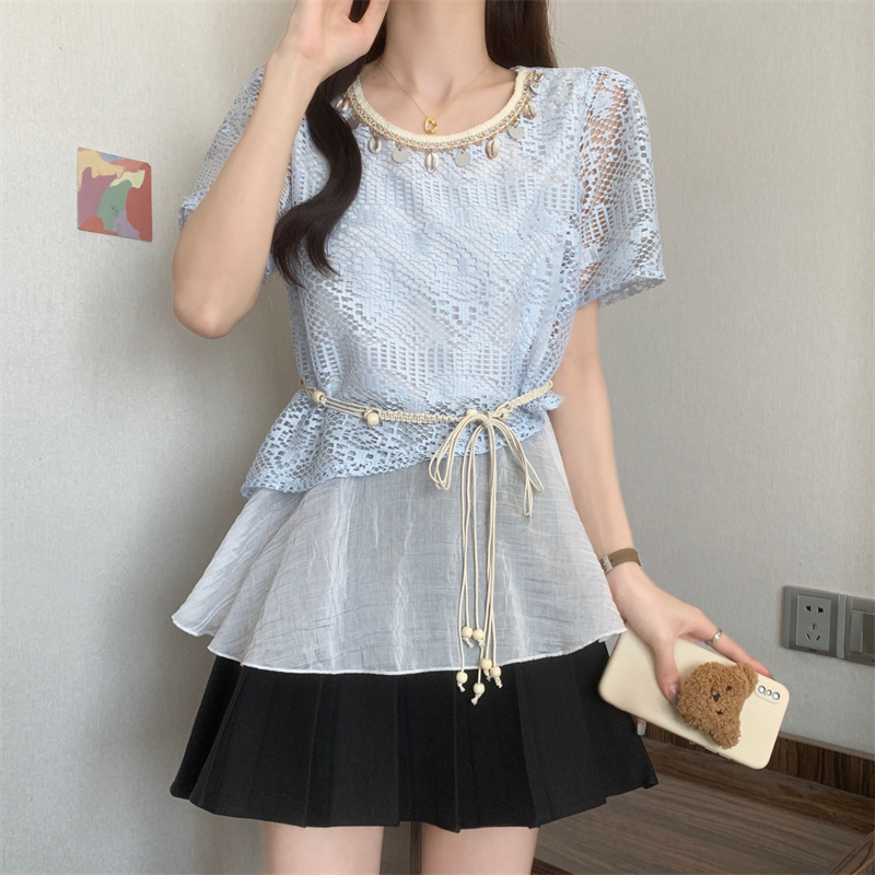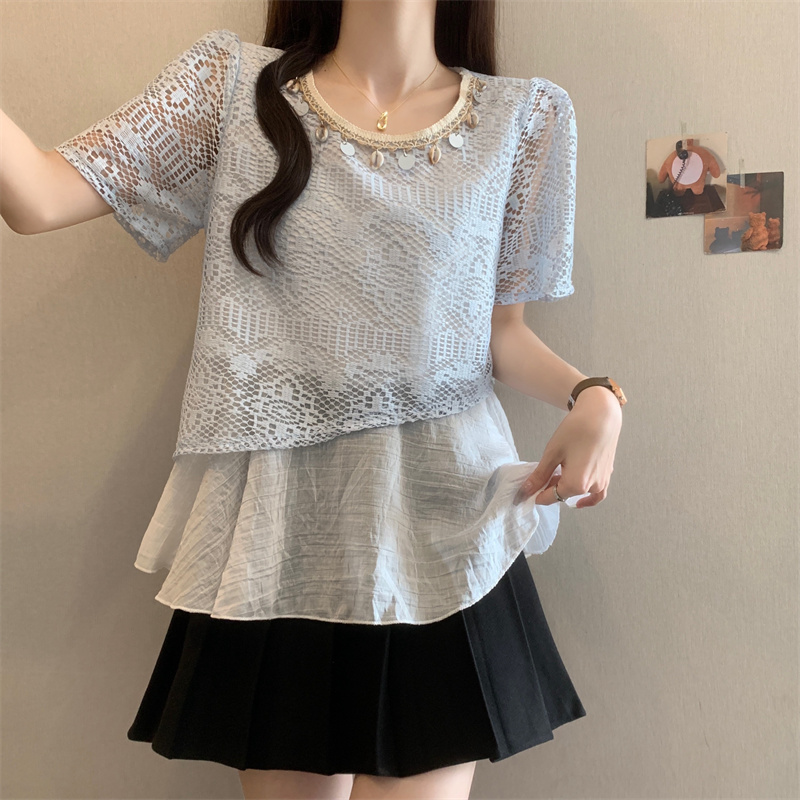 MY7162# 镂空假两件短袖衬衫大码女装微胖mm遮肚叠穿小衫上衣女裝貨源服裝批發