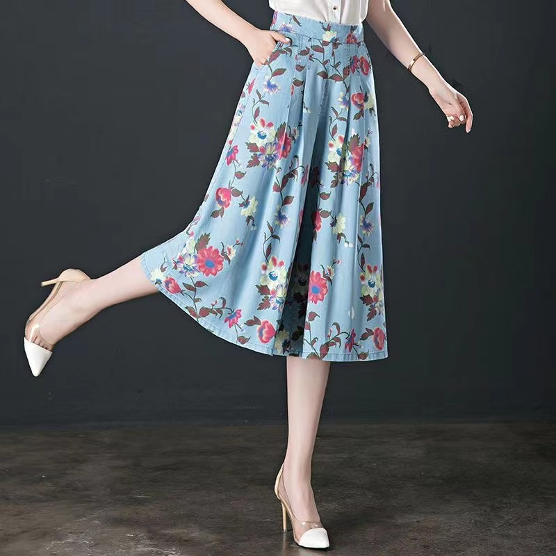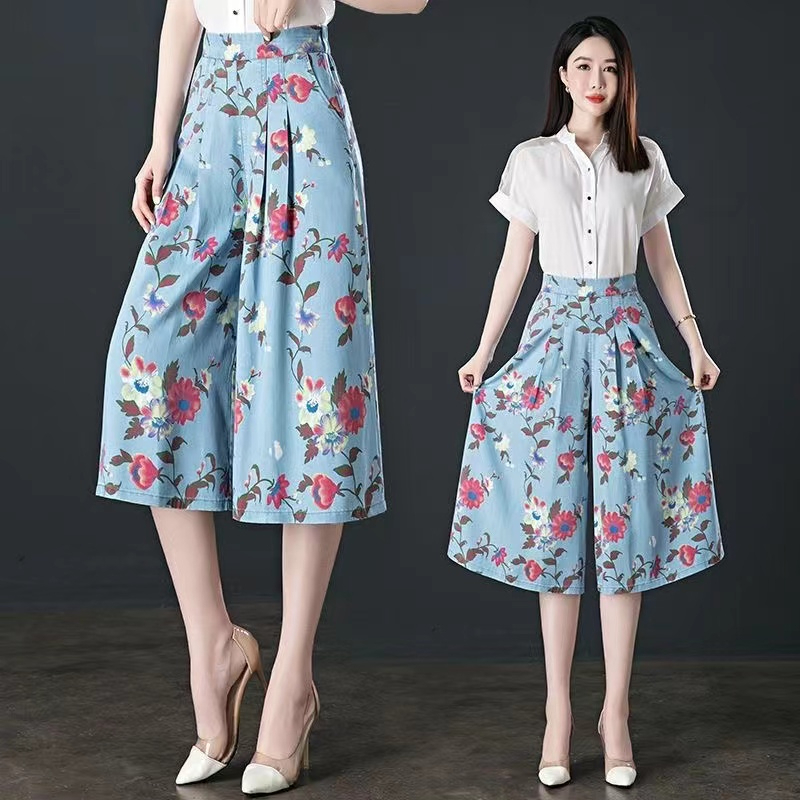 MY7191# 天丝牛仔蓝色七分裤女夏季薄款新款高腰宽松显瘦八分阔腿裤裙女裝貨源服裝批發