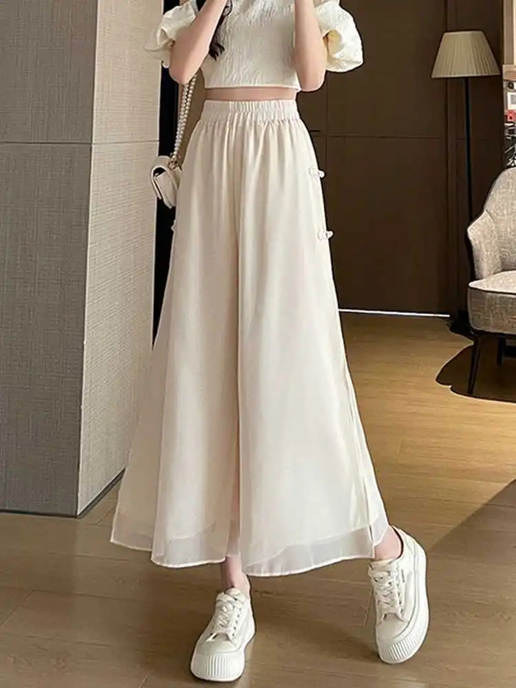MY7193# 国风新中式胖妹妹阔腿裤女春夏雪纺九分开叉裤子裤裙垂感裙裤新款女裝貨源服裝批發