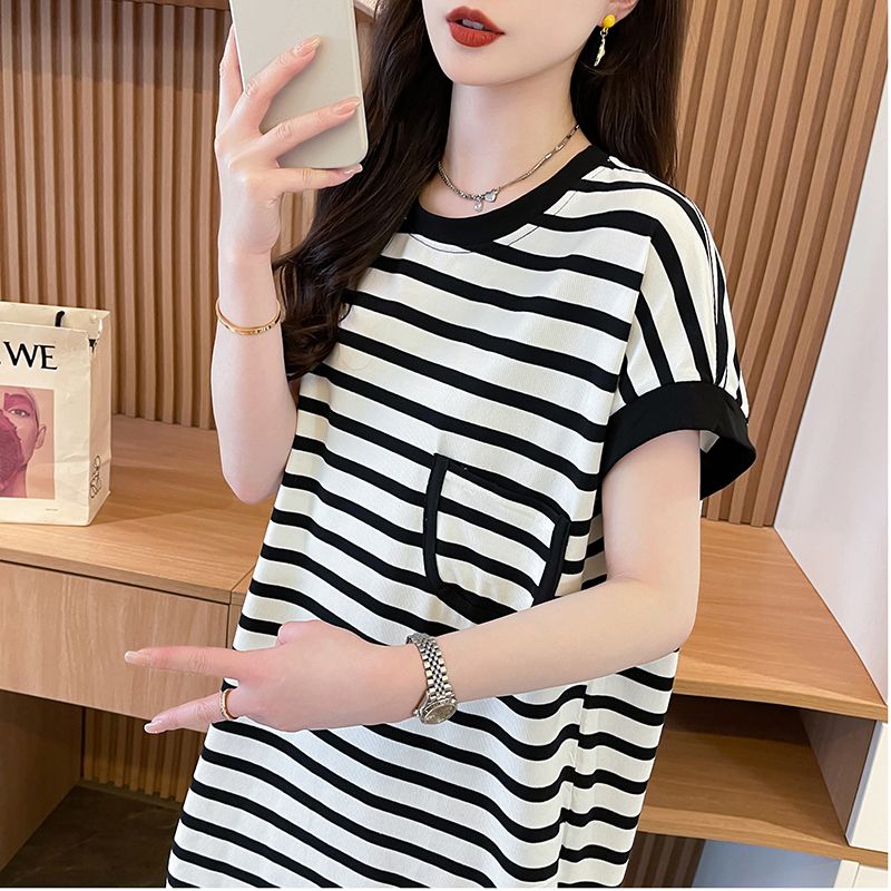 MY7283# 实拍抖音质量//后包领/宽松长款口袋设计感条纹连衣裙