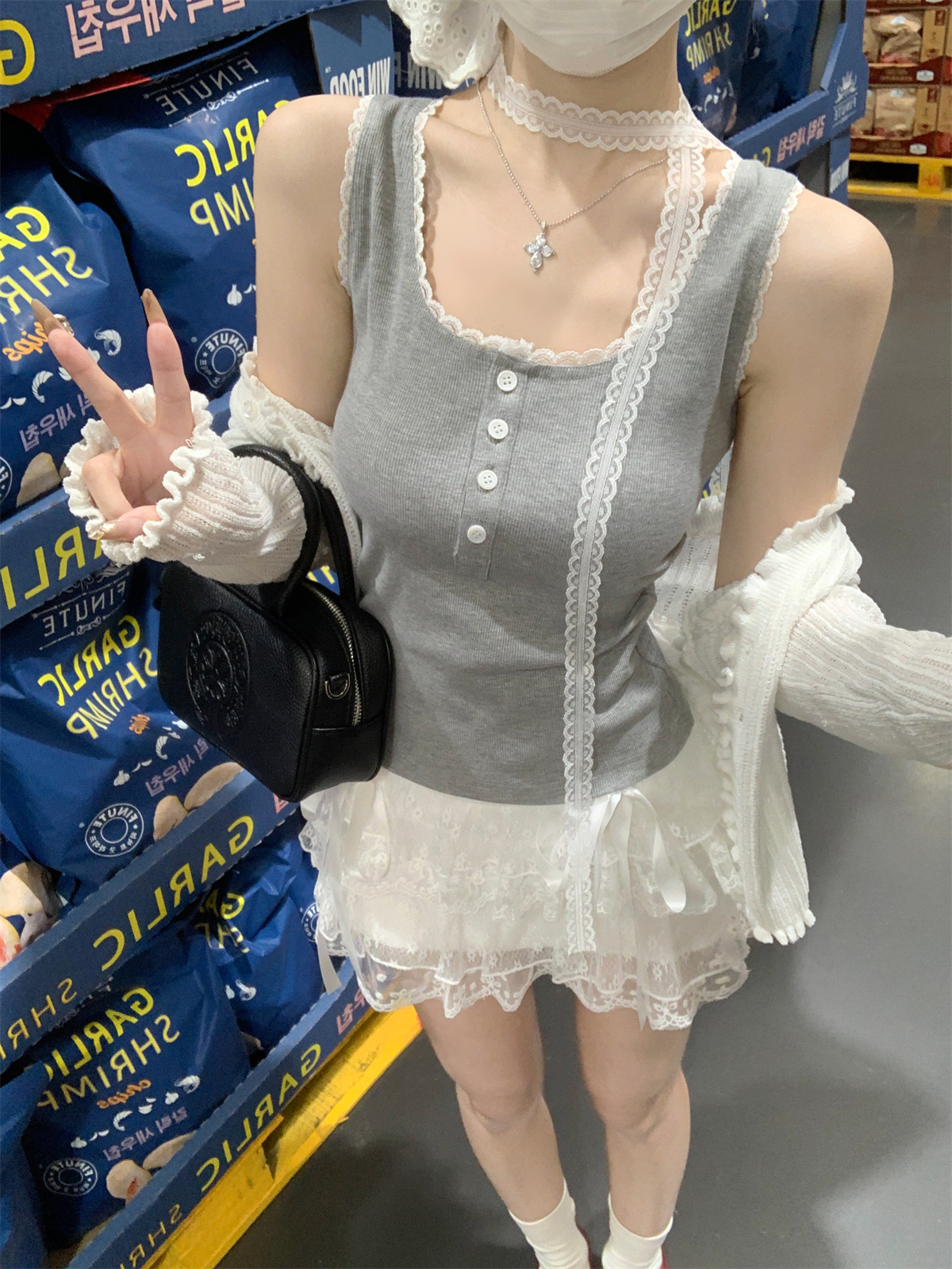 MY8232# 韩版方领纯欲蕾丝边纽扣设计内搭工字型背心T恤上衣女裝貨源服裝批發