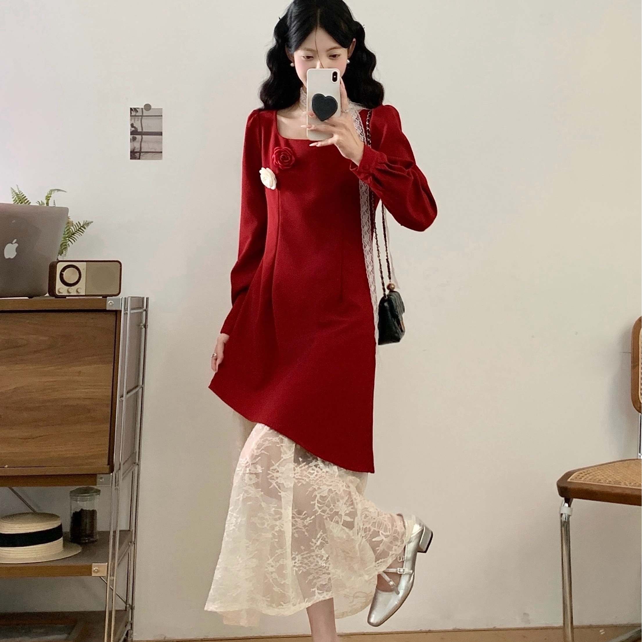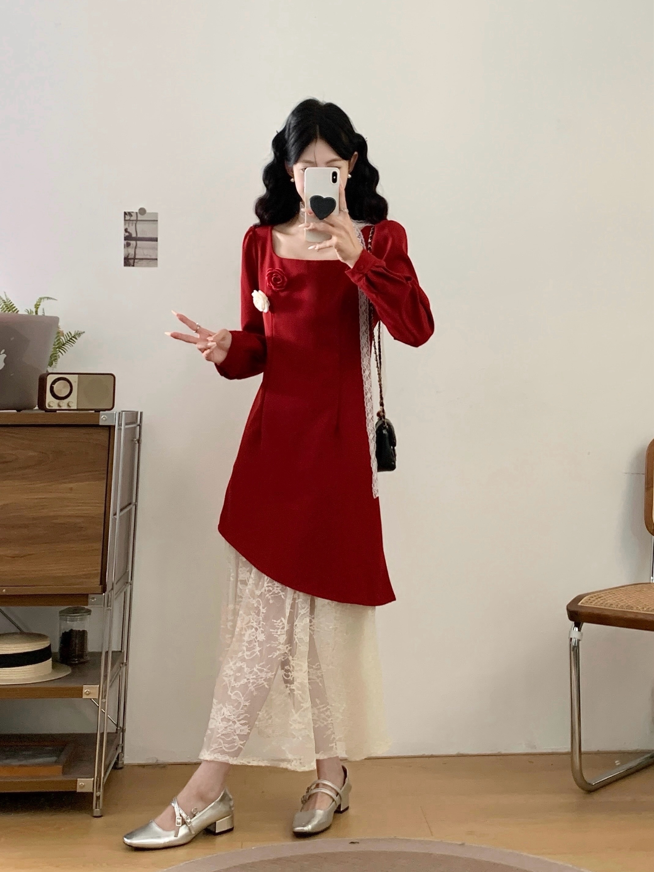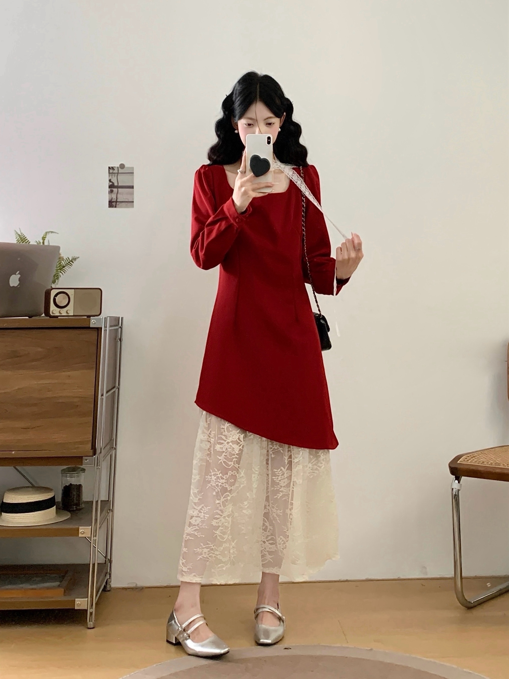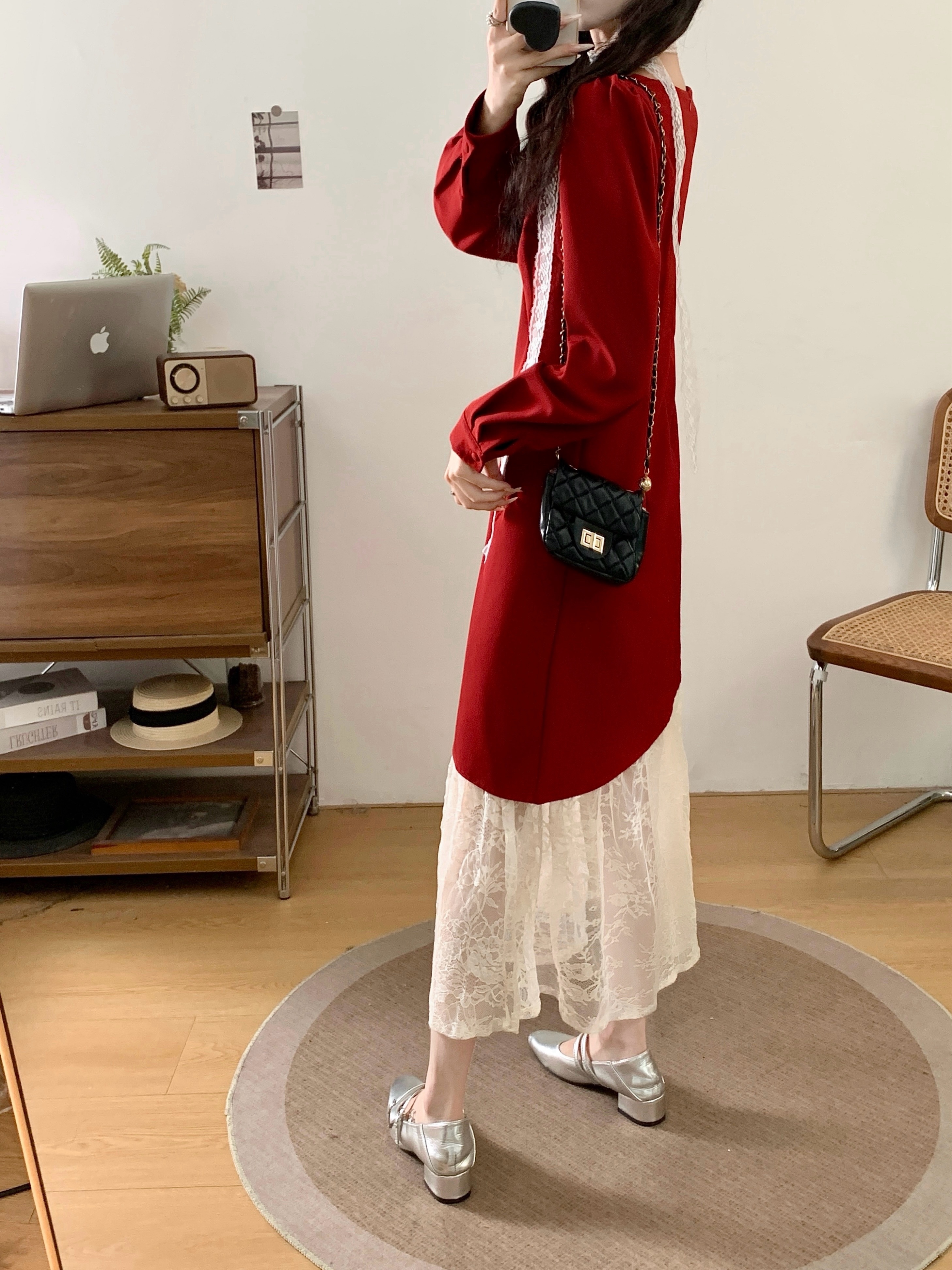 MY13598# 方领撞色蕾丝长裙新款假两件连衣裙子女裝貨源服裝批發