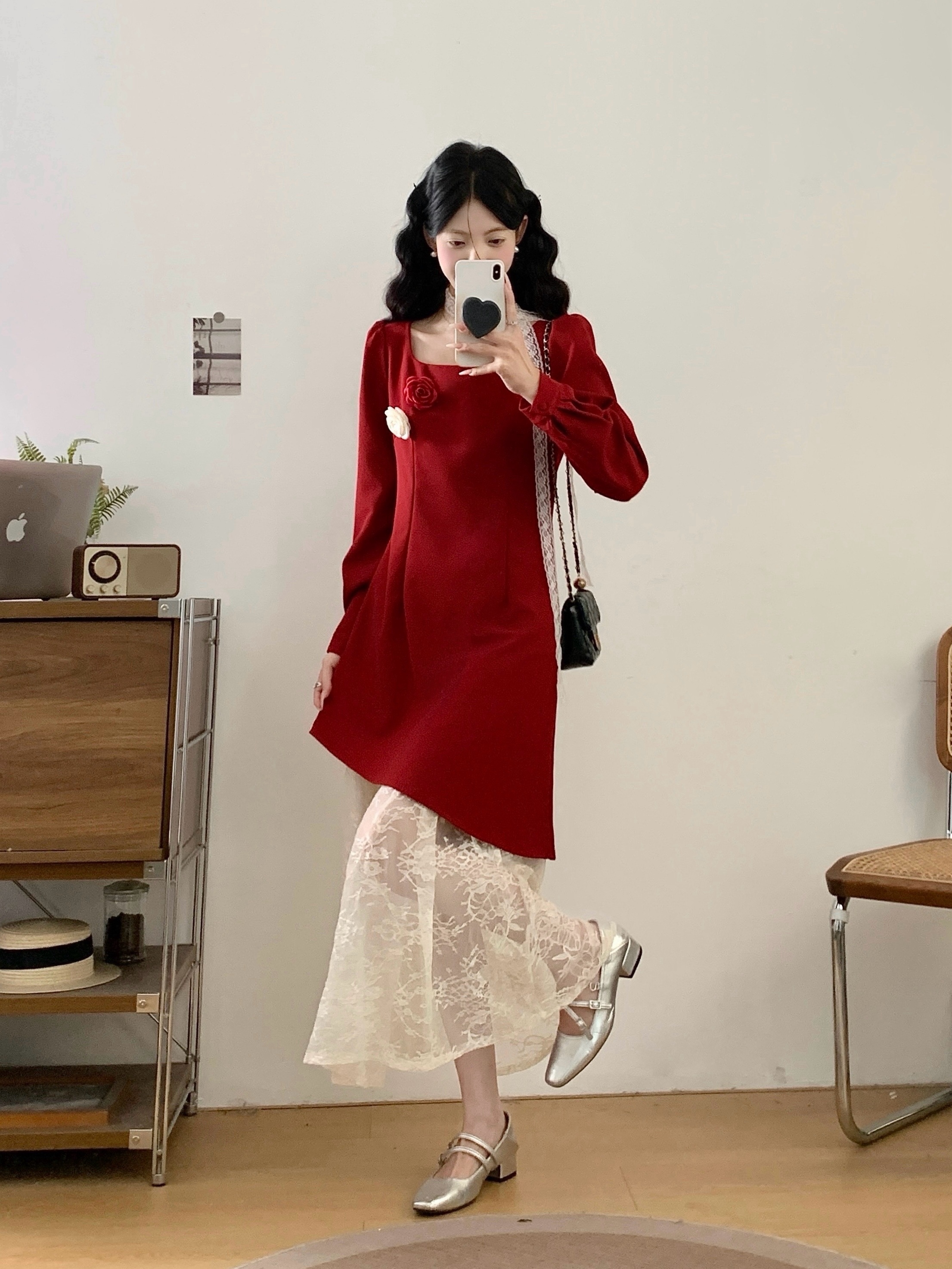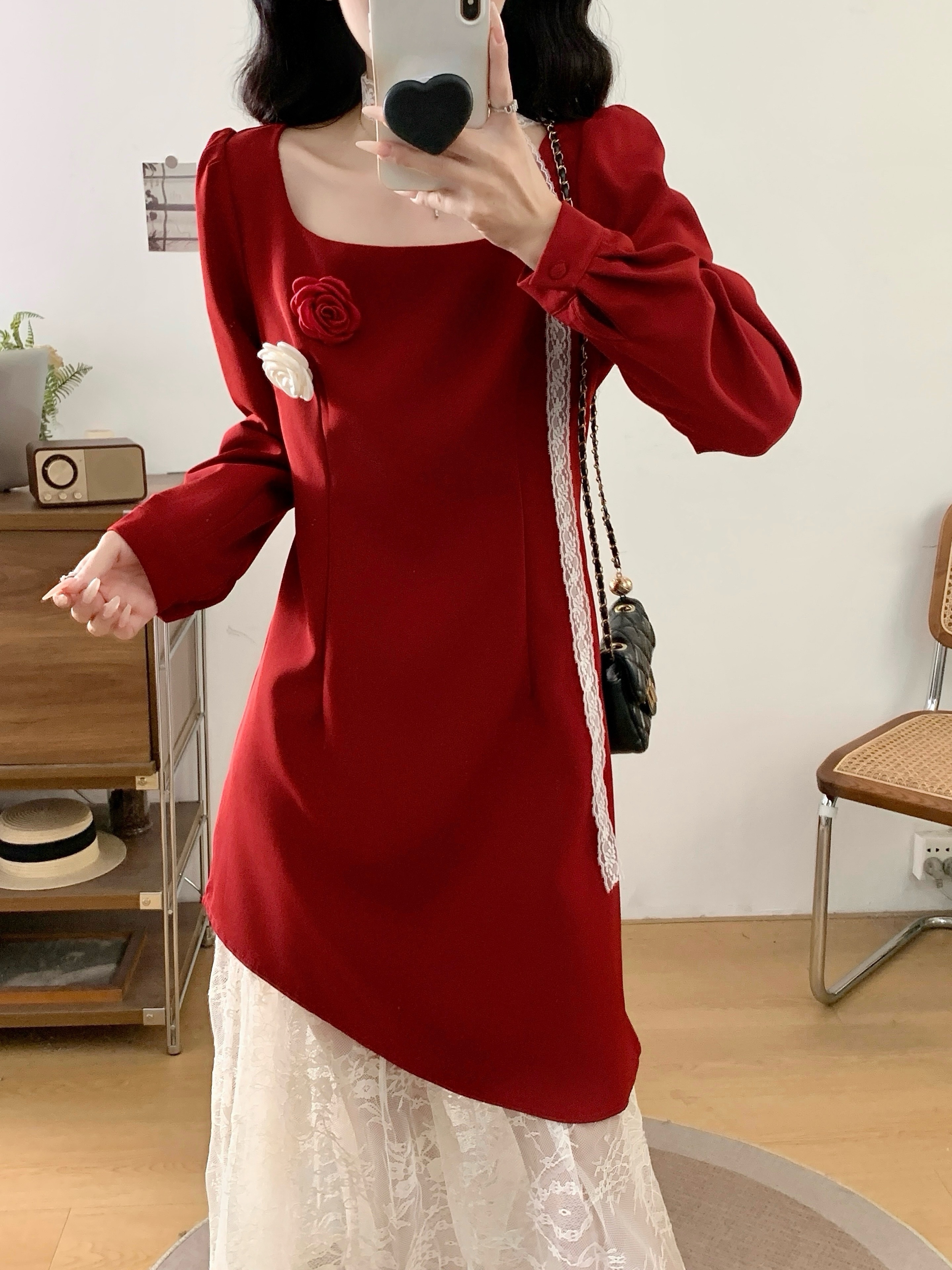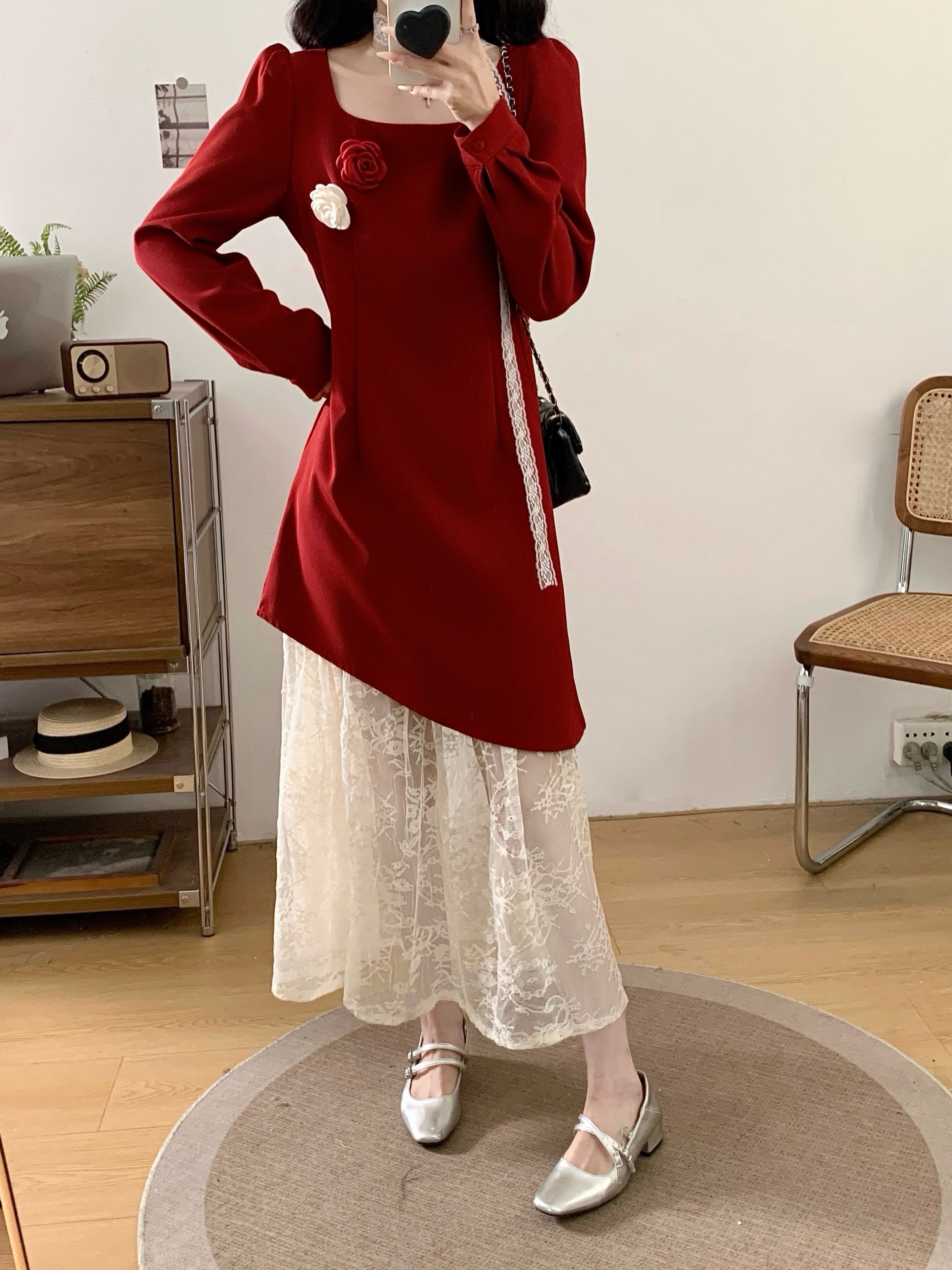 MY13598# 方领撞色蕾丝长裙新款假两件连衣裙子女裝貨源服裝批發