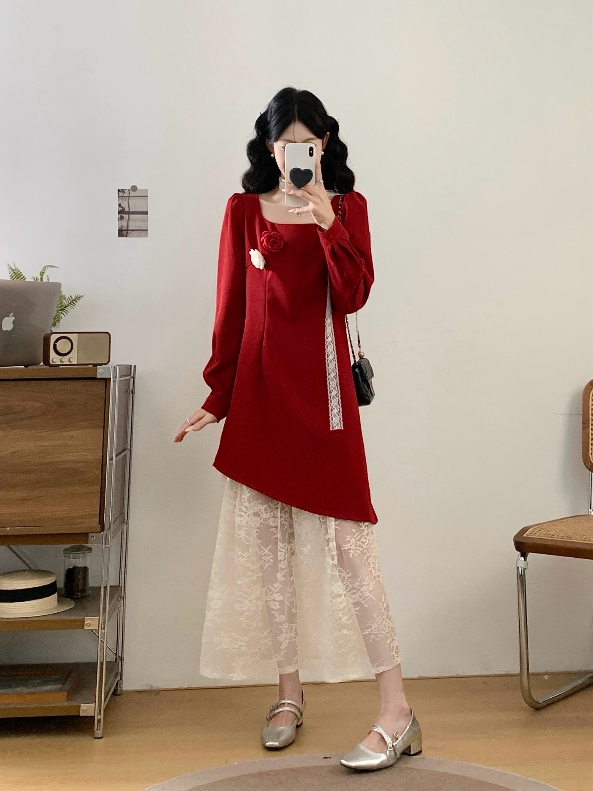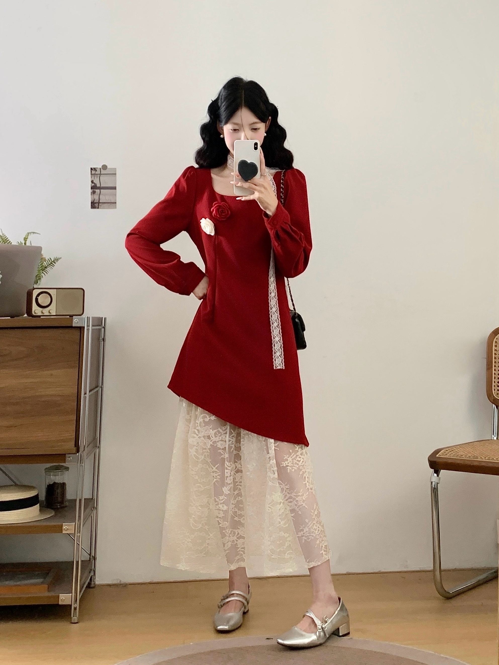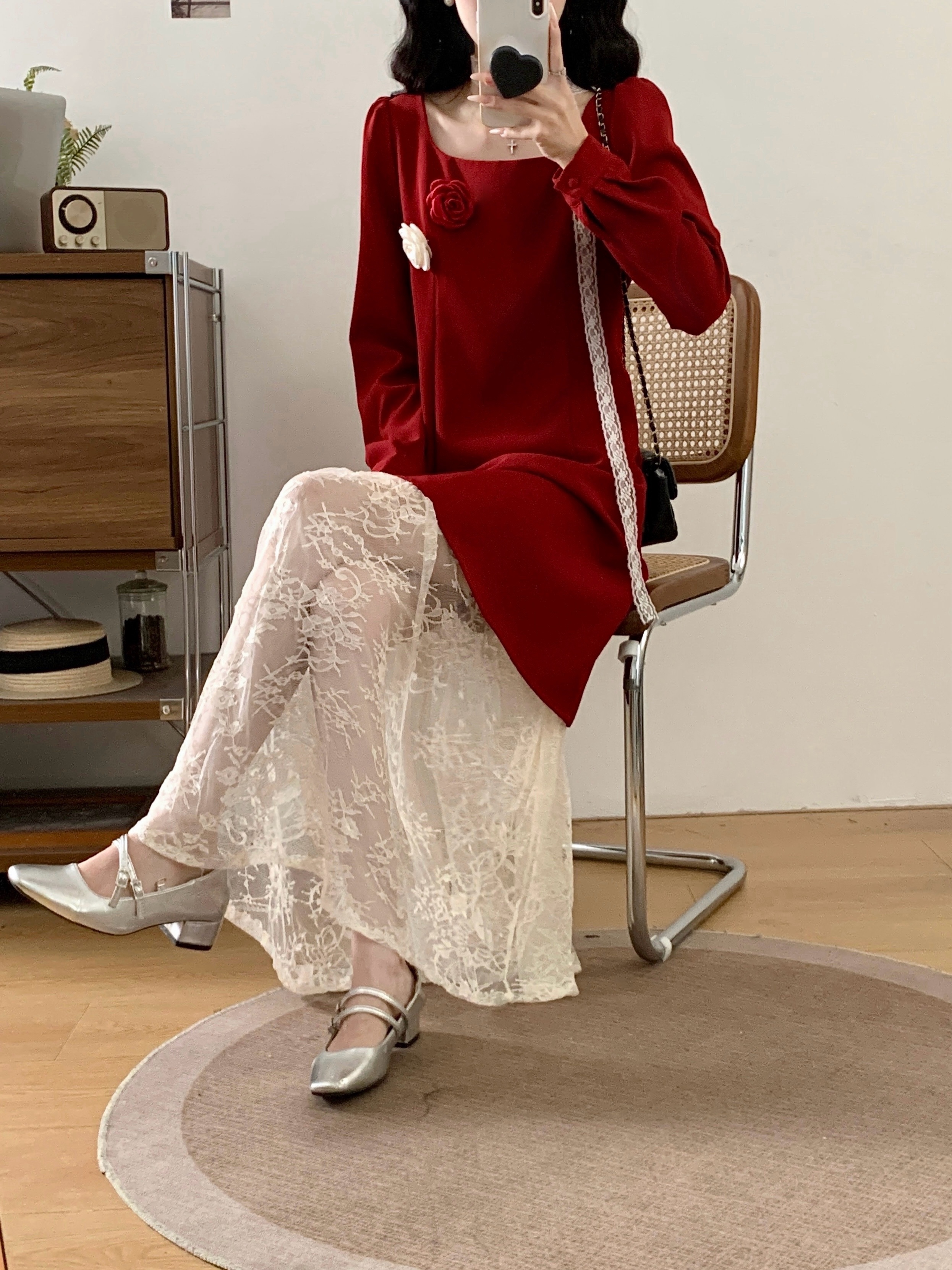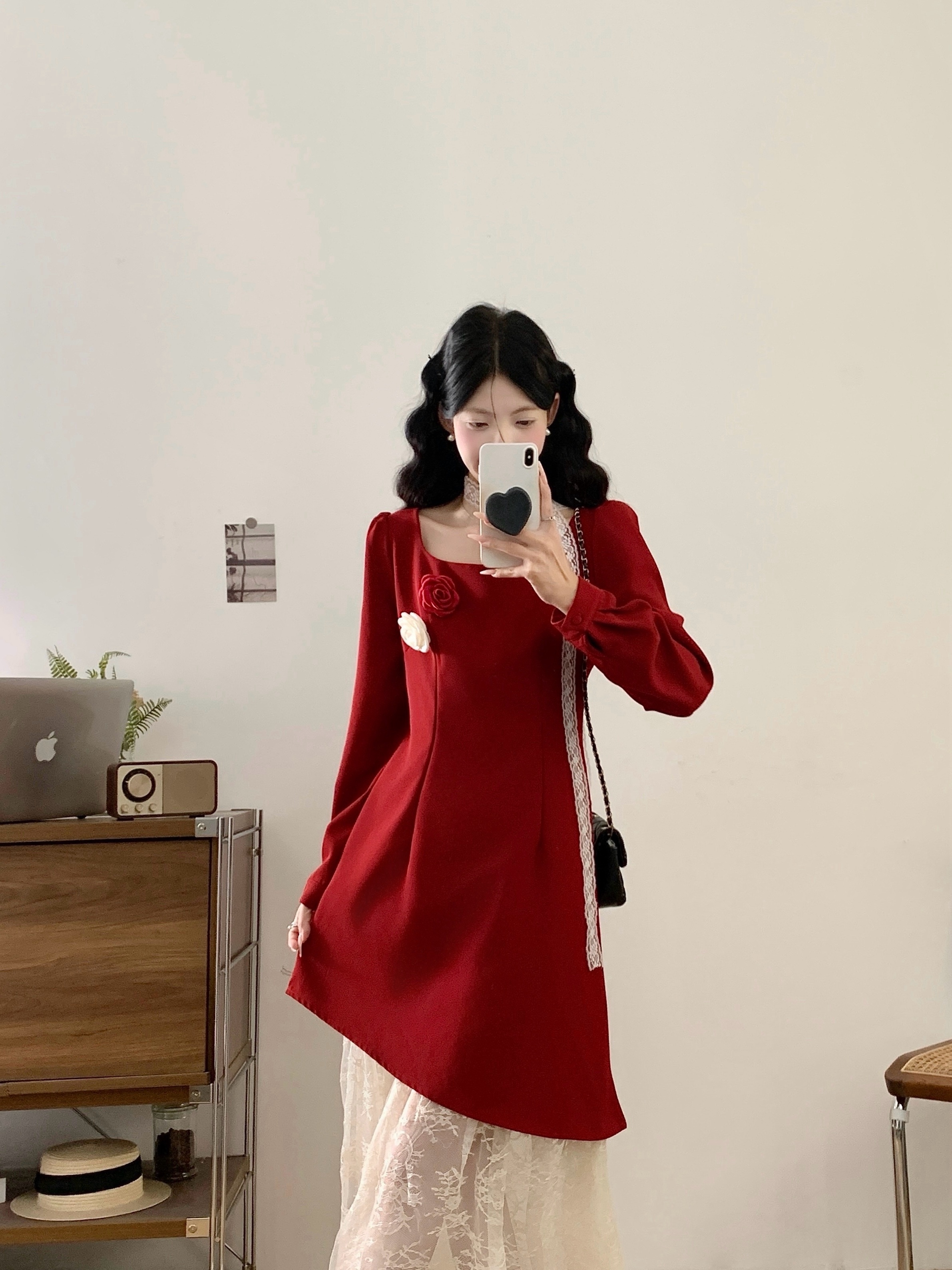 MY13598# 方领撞色蕾丝长裙新款假两件连衣裙子女裝貨源服裝批發