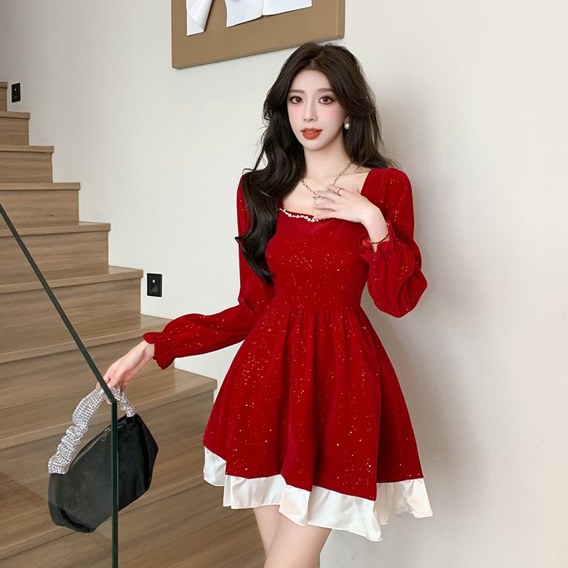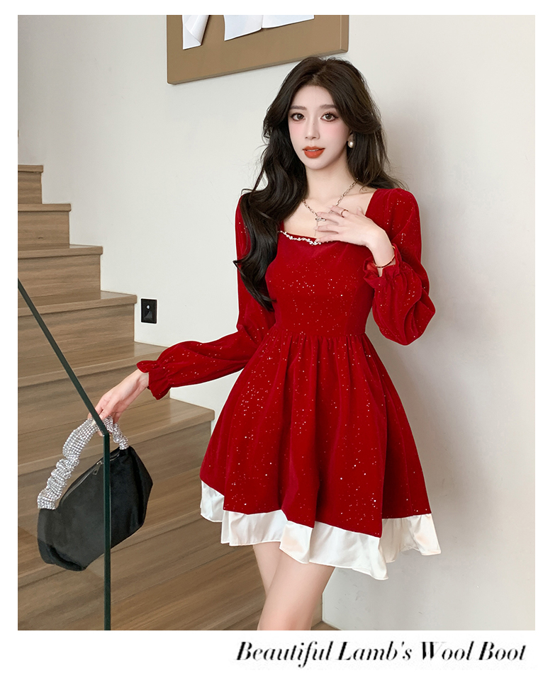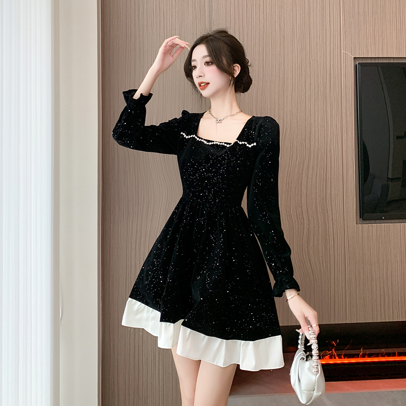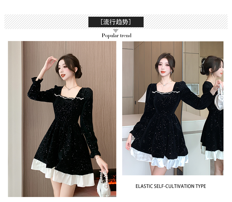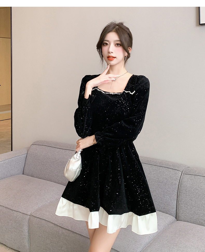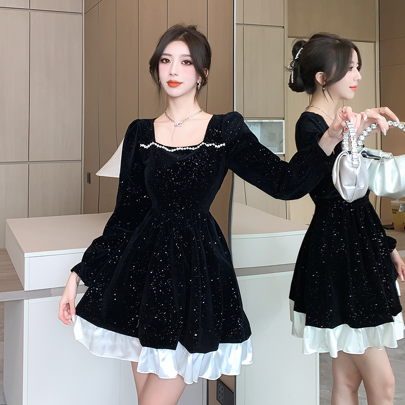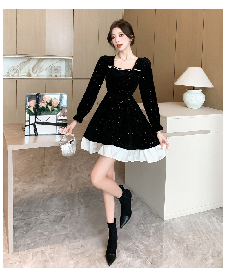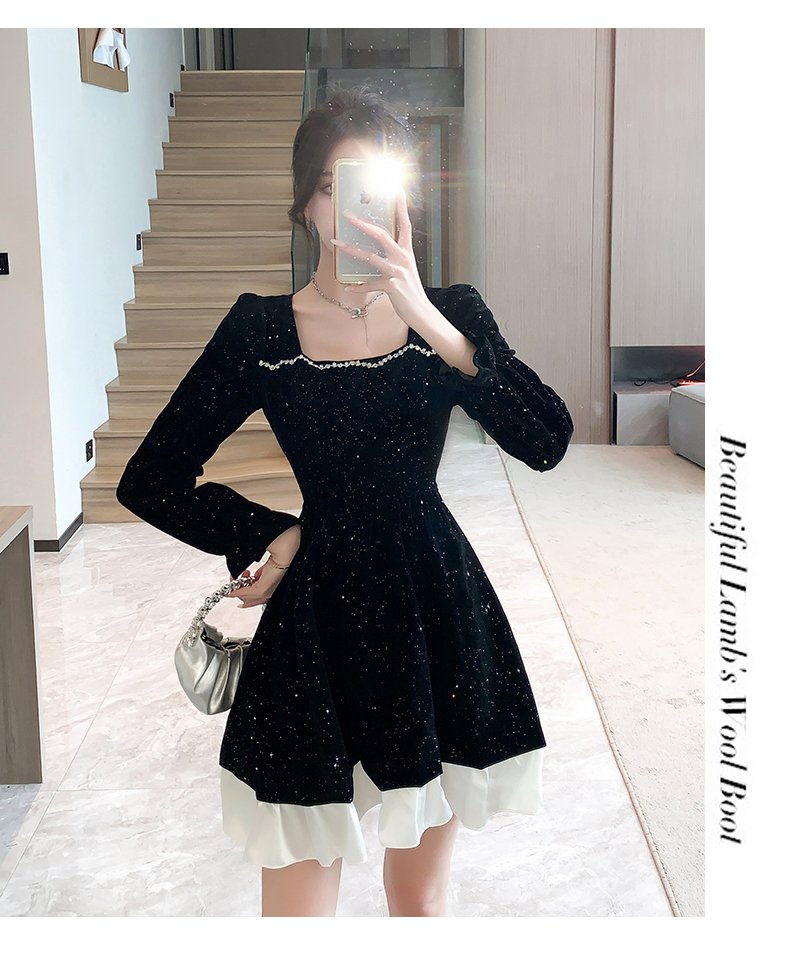 MY13618# 松本布灵方领丝绒纯欲连衣裙秋冬新款显瘦收腰气质短裙女裝貨源服裝批發