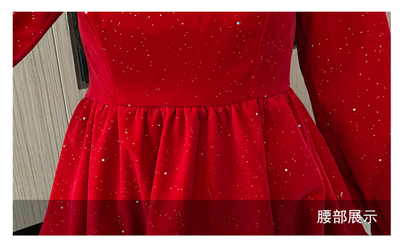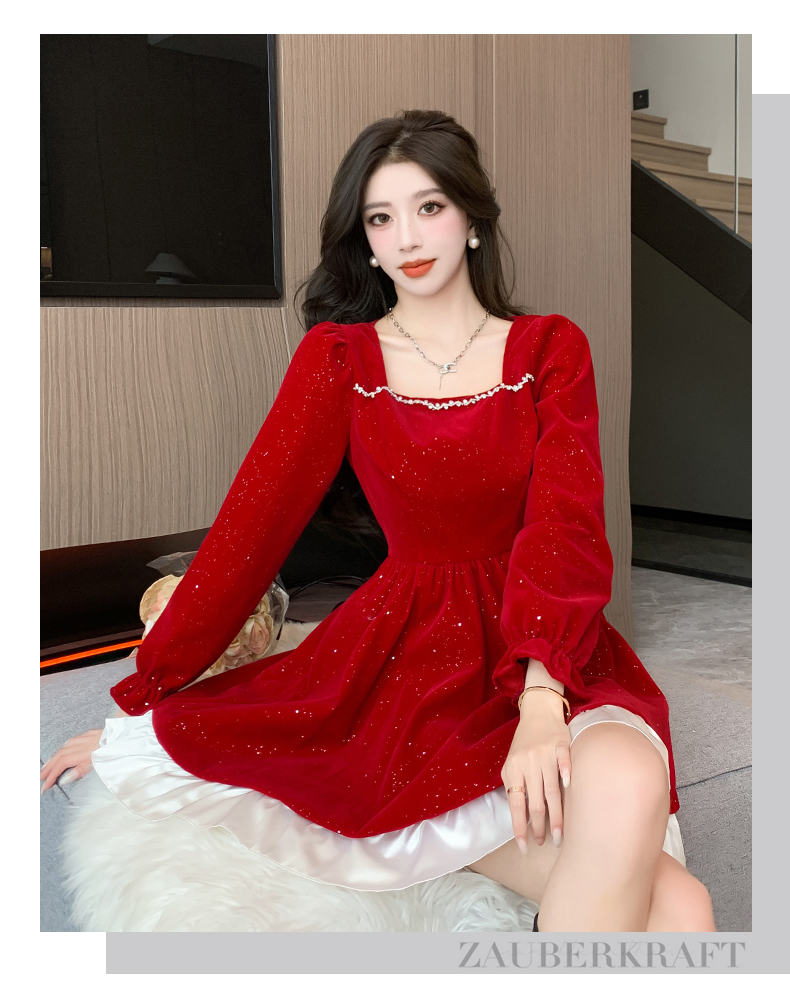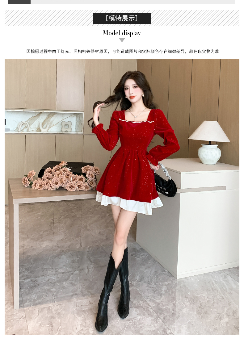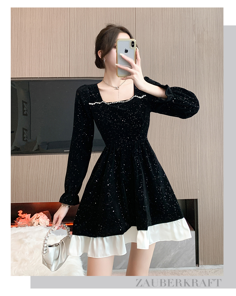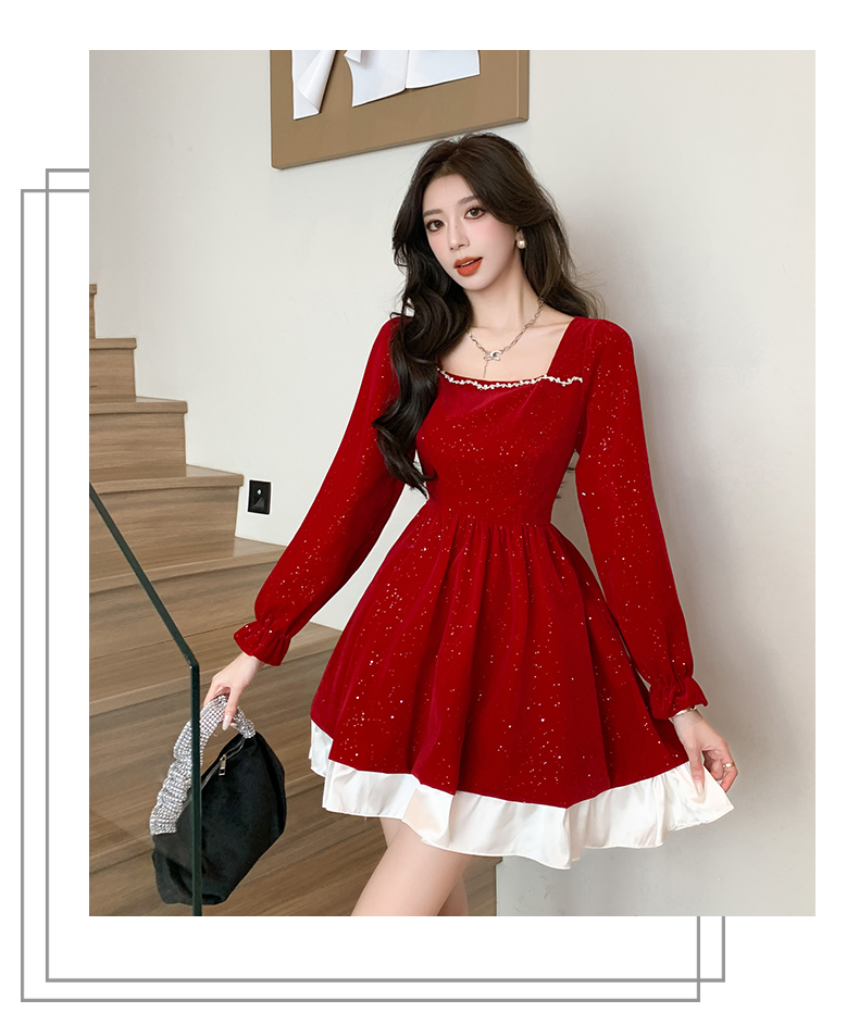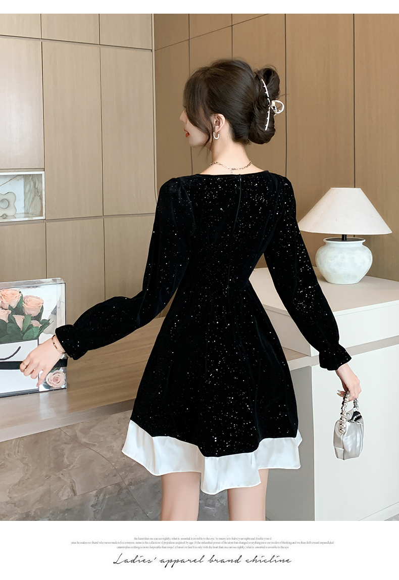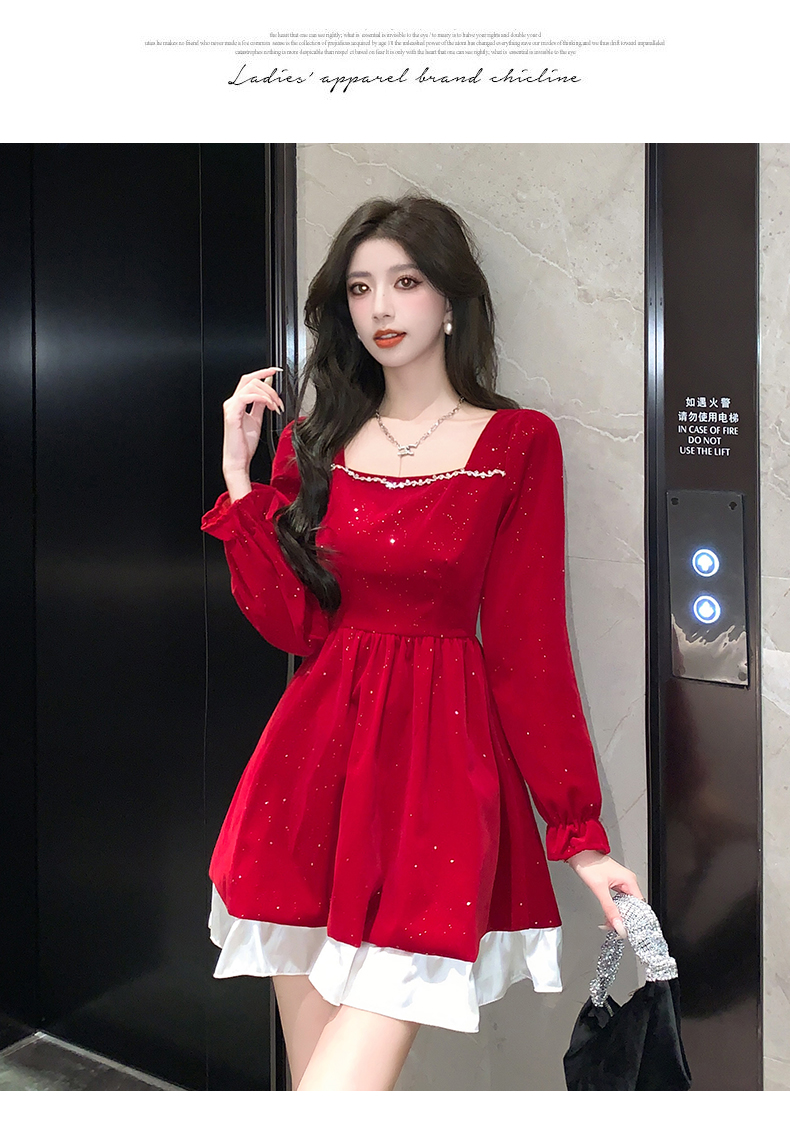 MY13618# 松本布灵方领丝绒纯欲连衣裙秋冬新款显瘦收腰气质短裙女裝貨源服裝批發