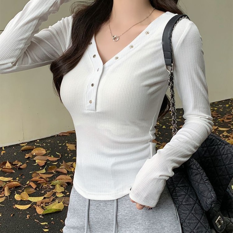 MY13639# 人棉莫代尔小众辣妹白色V领长袖t恤收腰显瘦上衣内搭女裝貨源服裝批發