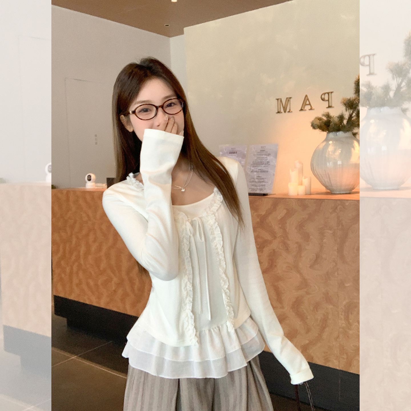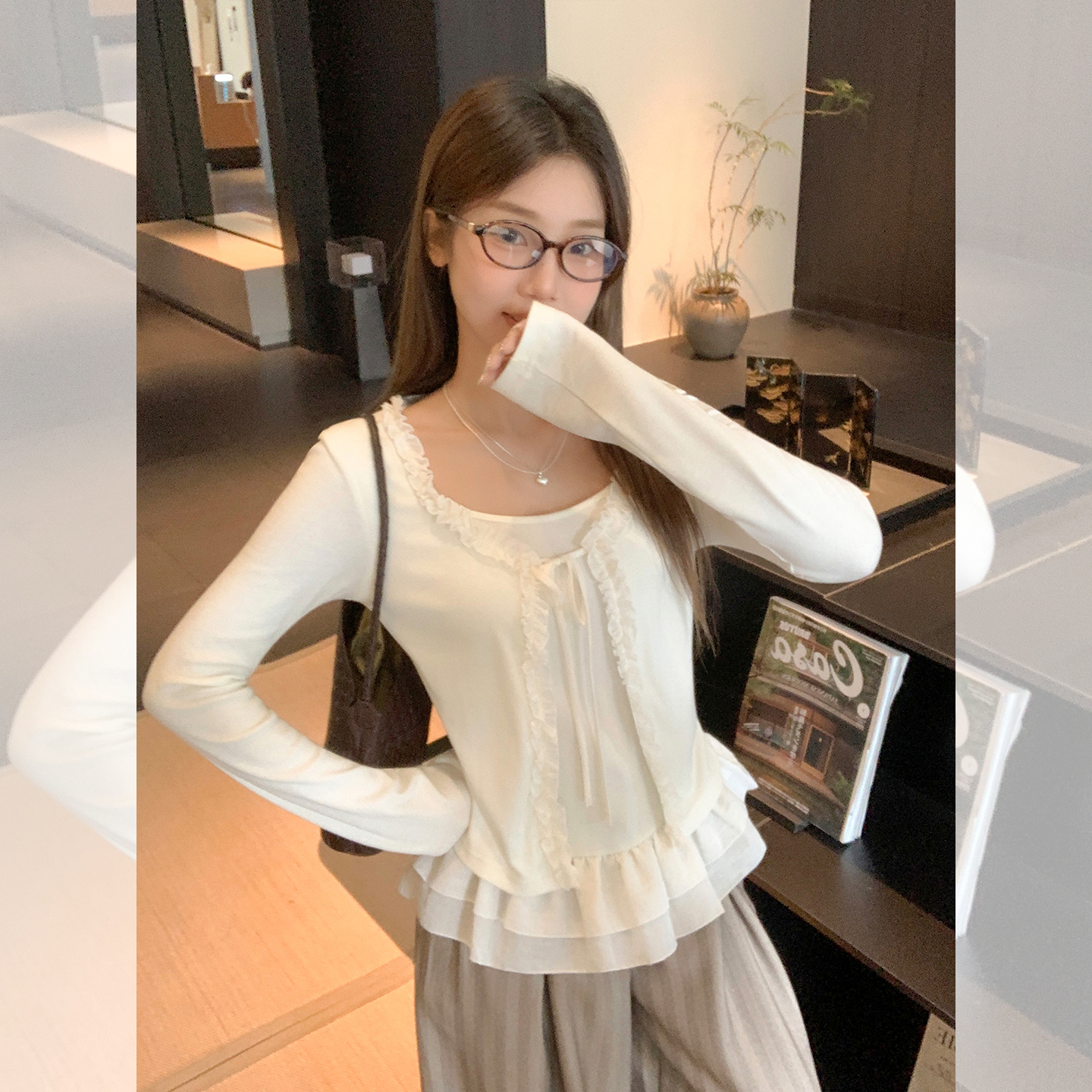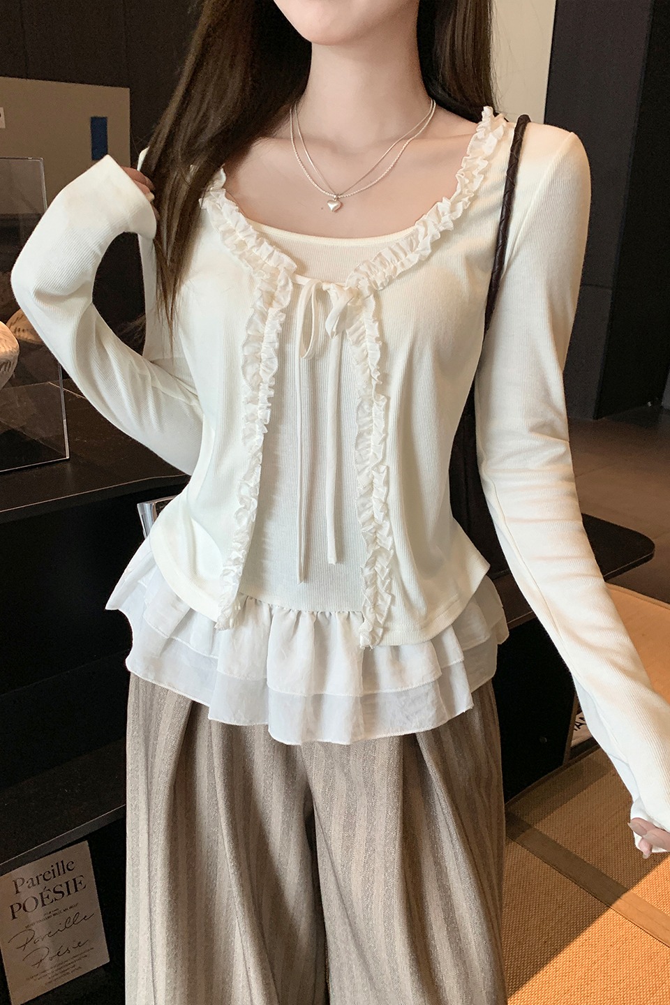 MY13653# 甜辣纯欲假两件拼接设计感长袖T恤新款花边系带上衣女裝貨源服裝批發