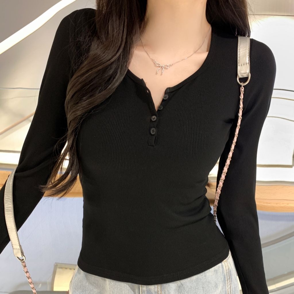 MY13656# 新款长袖T恤女修身显瘦纽扣打底衫上衣女裝貨源服裝批發