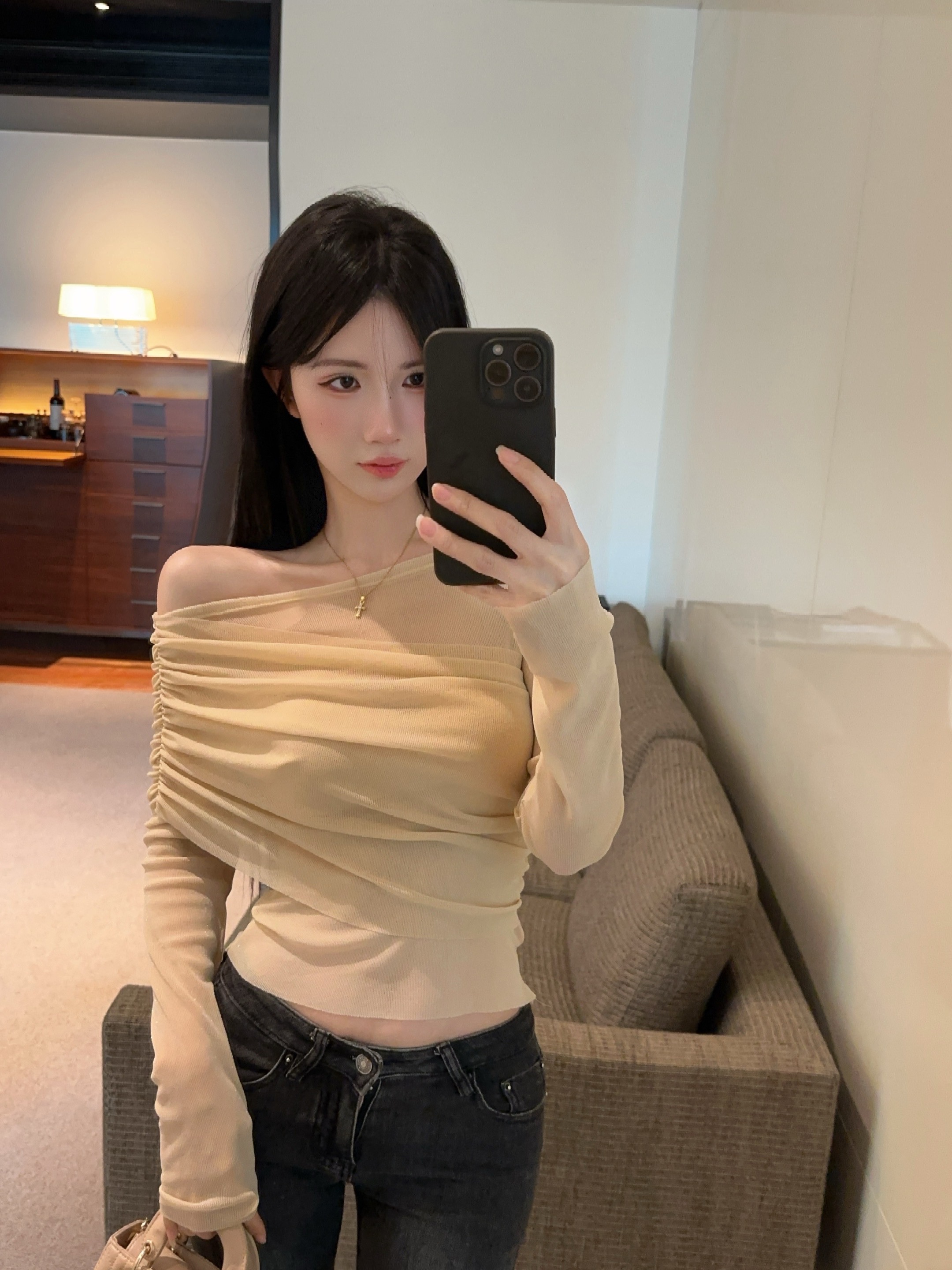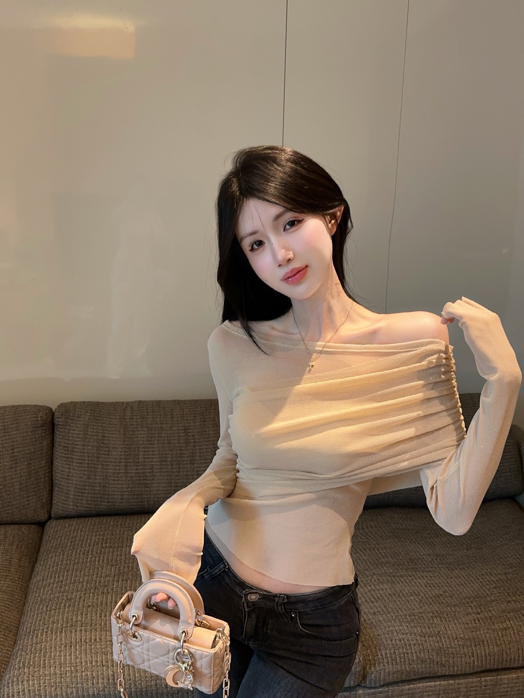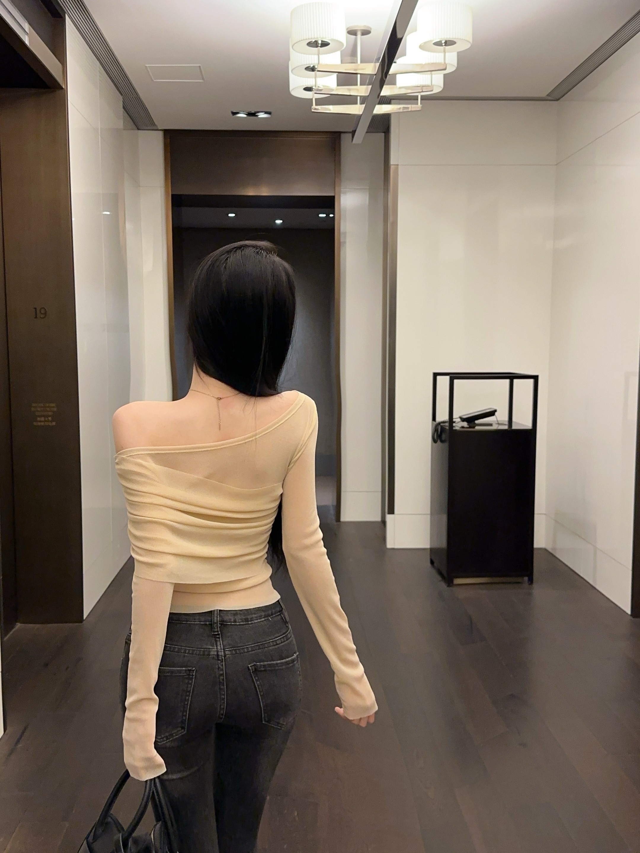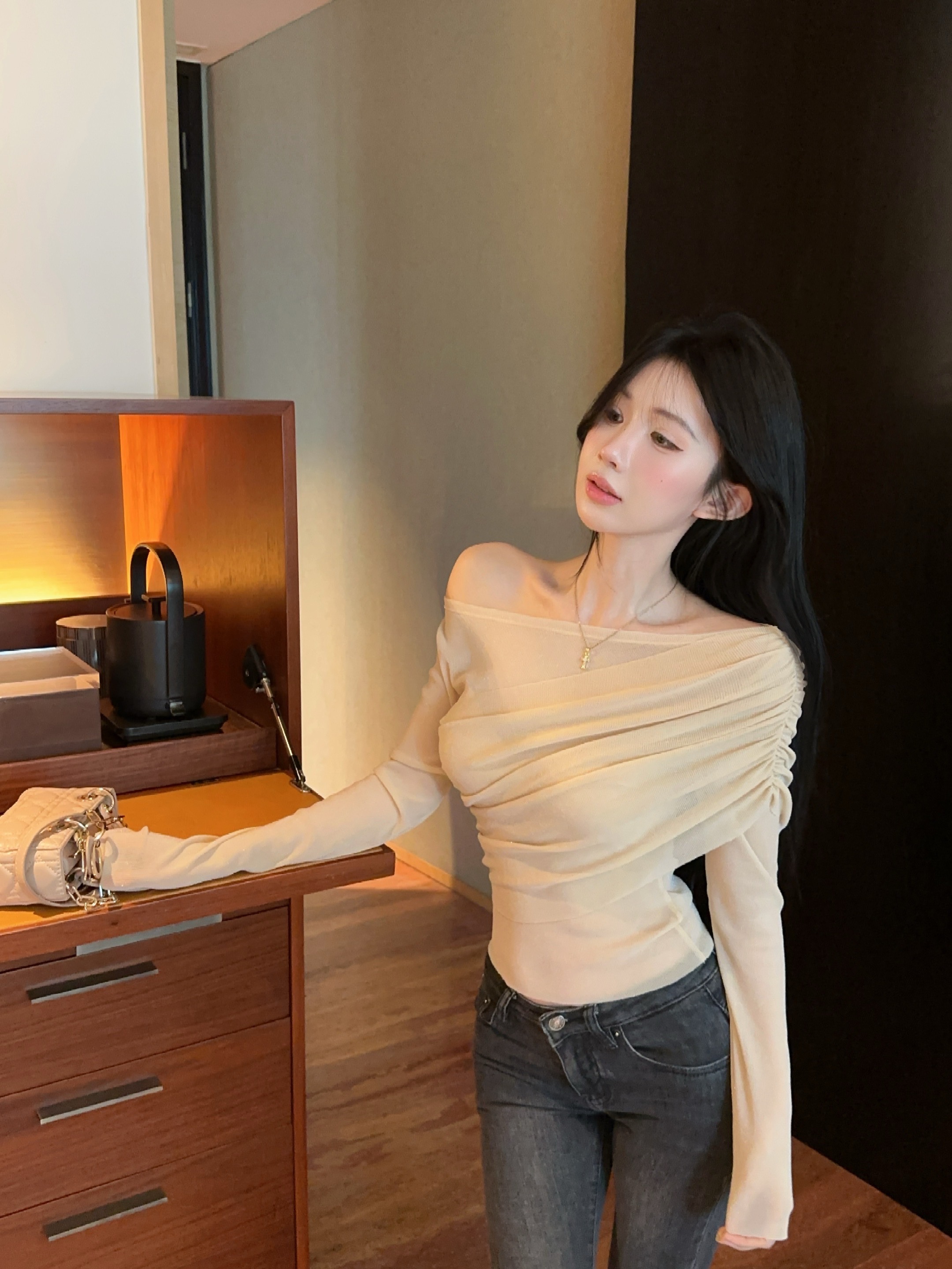MY13657# 法式一字肩修身收腰显瘦长袖上衣女裝貨源服裝批發