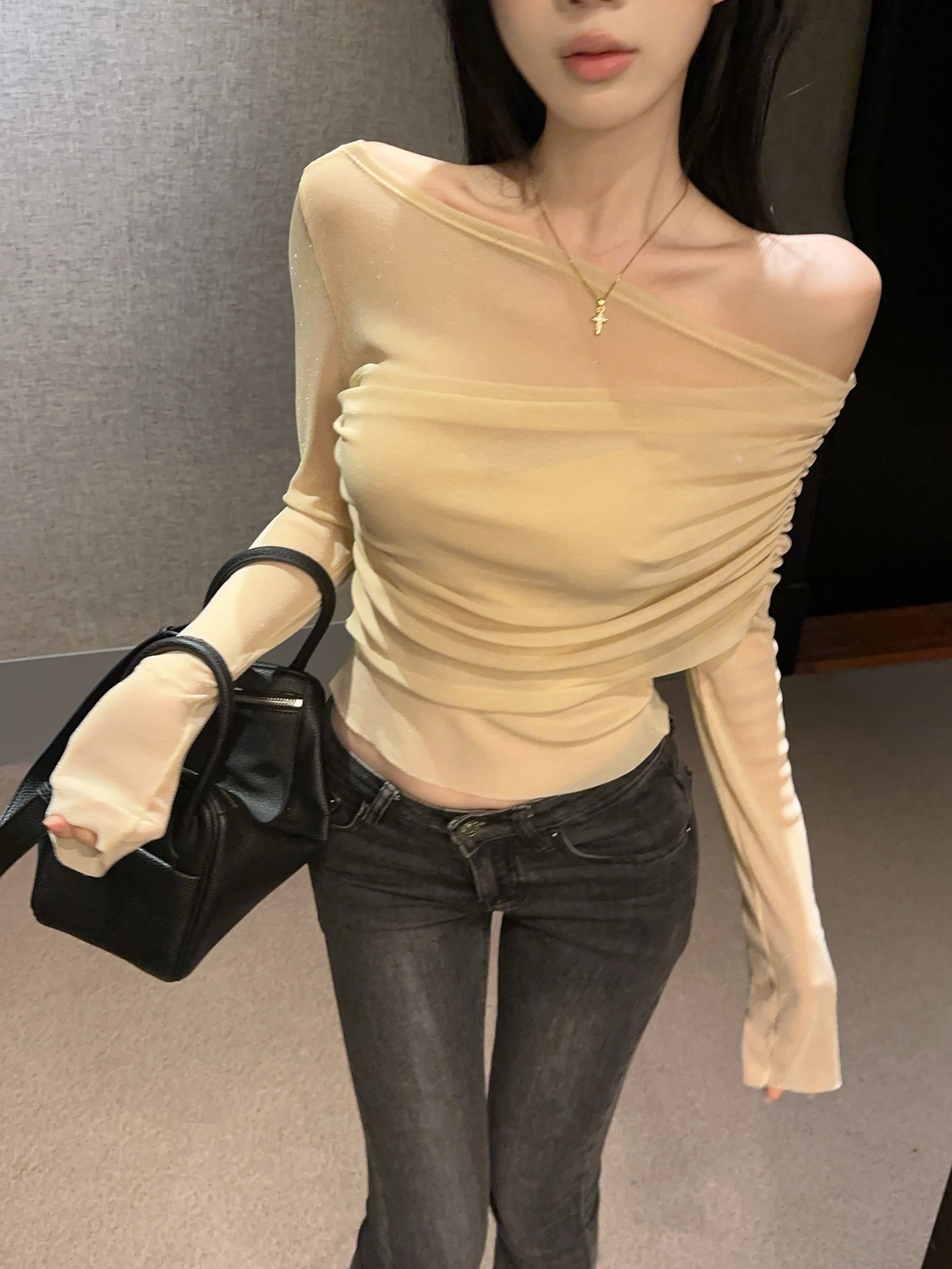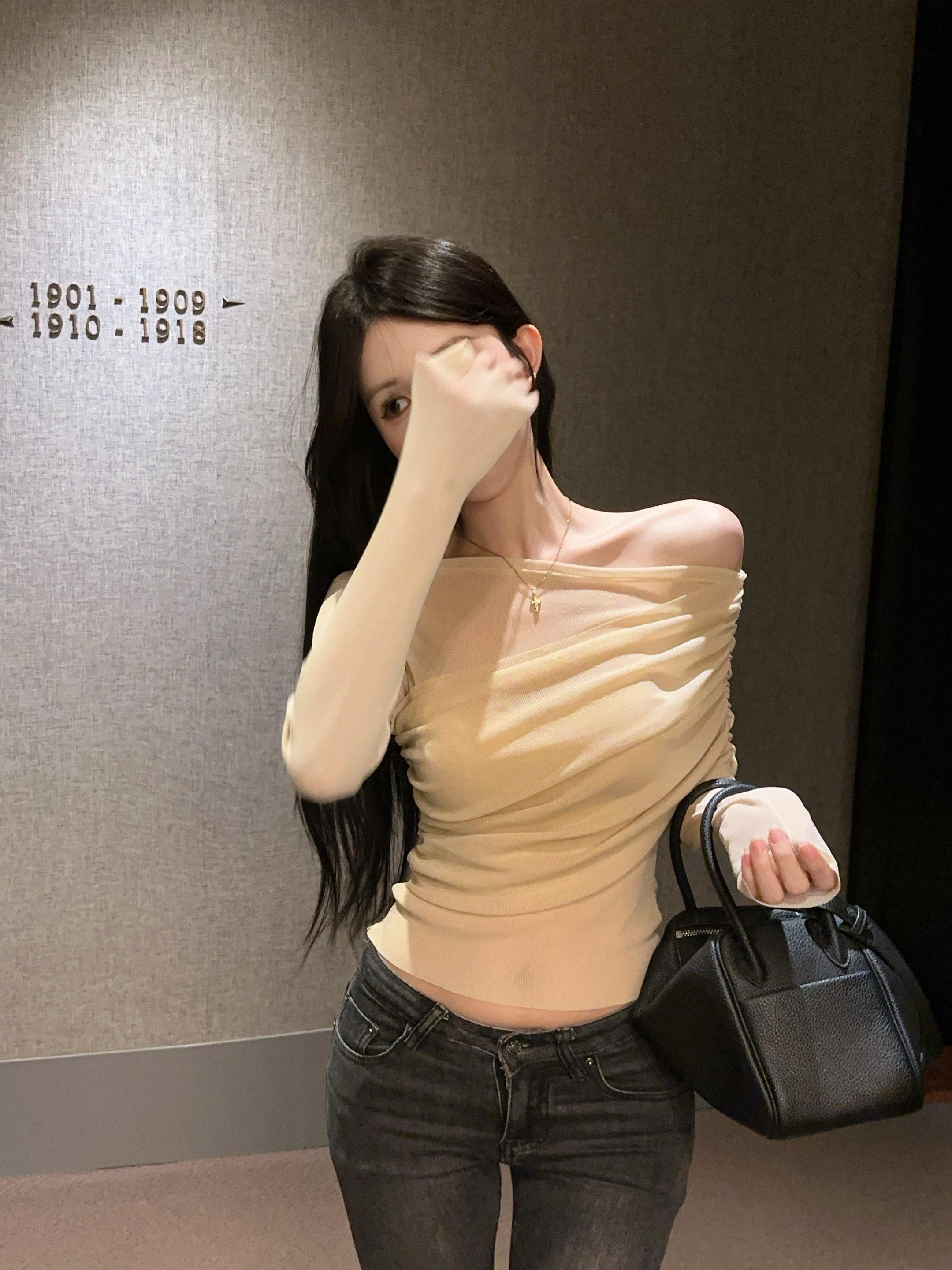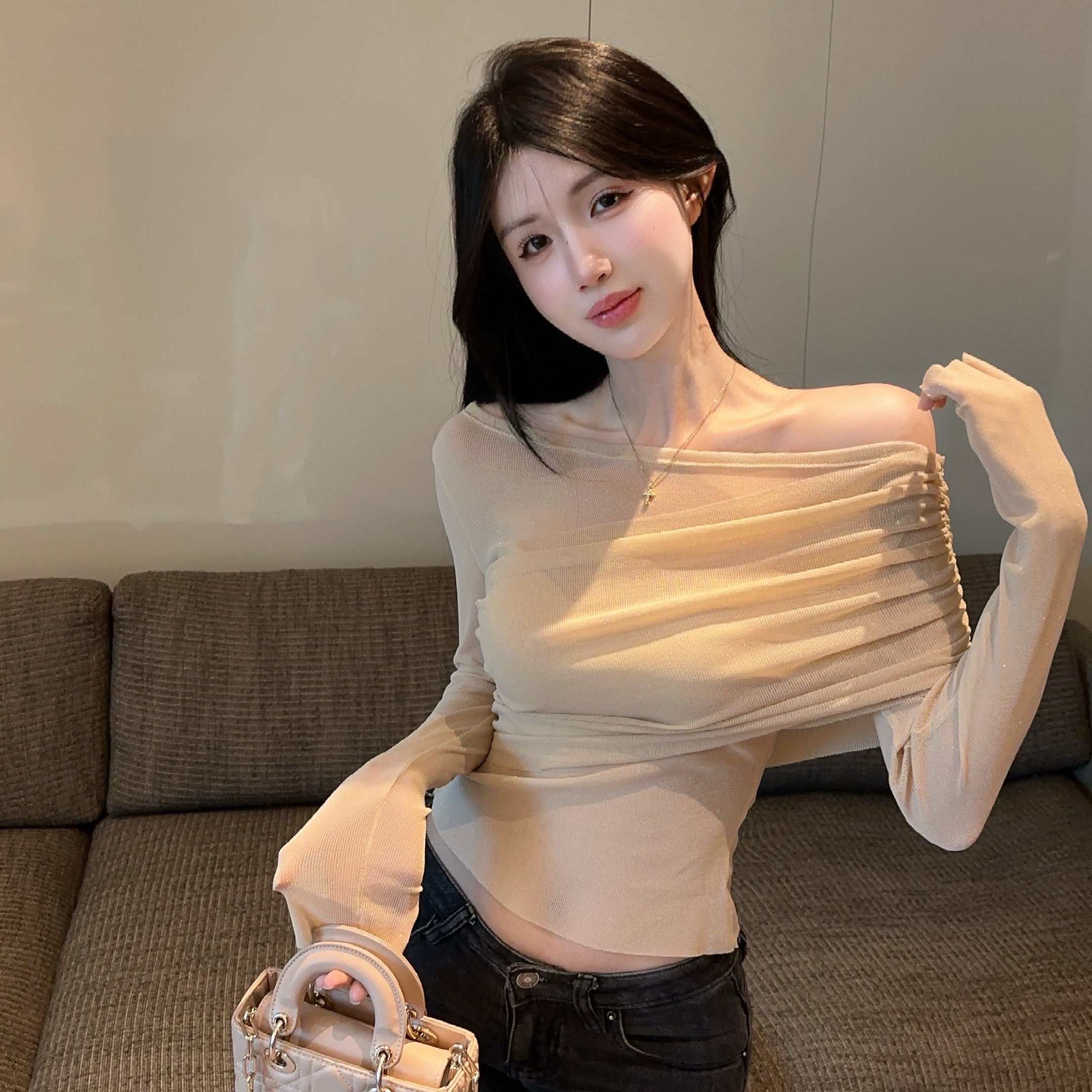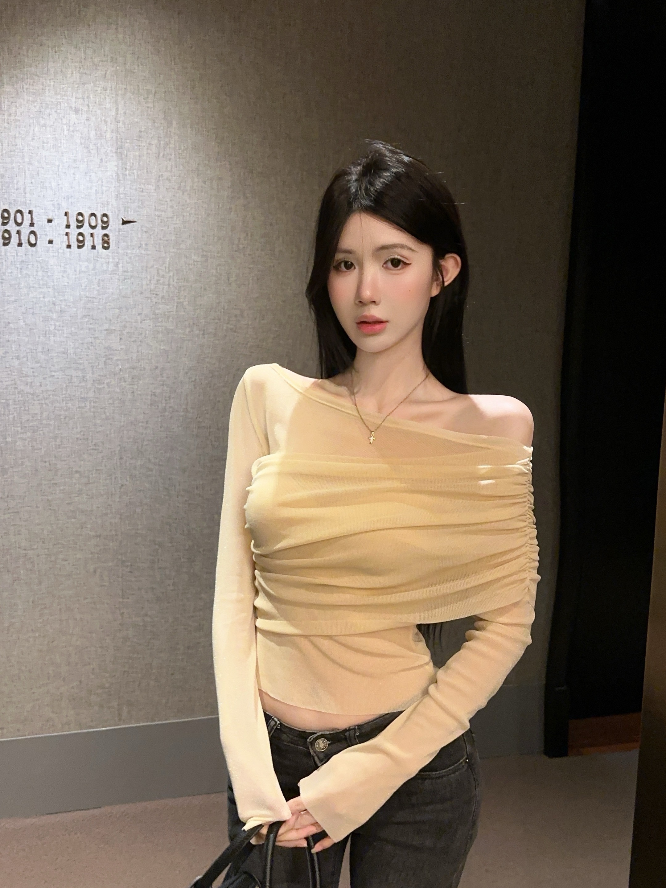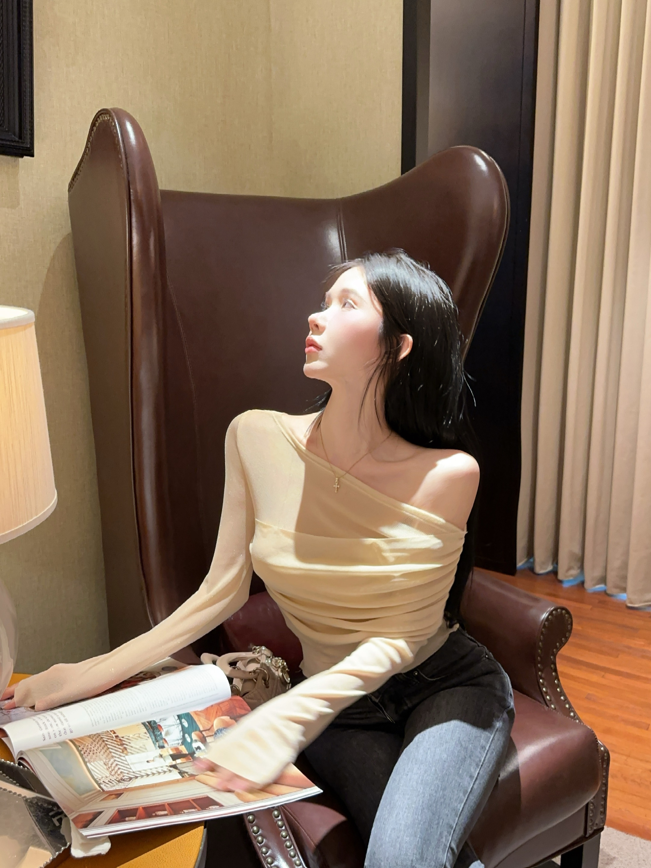 MY13657# 法式一字肩修身收腰显瘦长袖上衣女裝貨源服裝批發