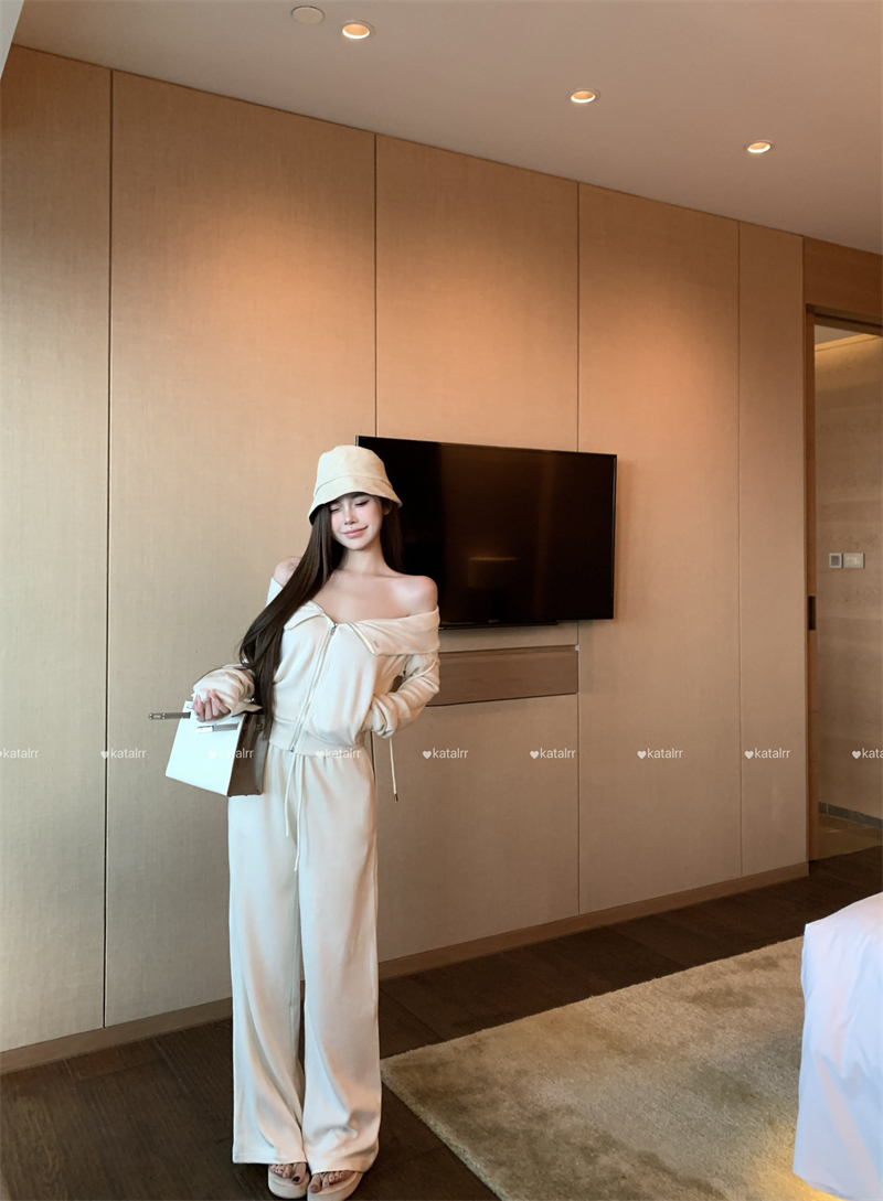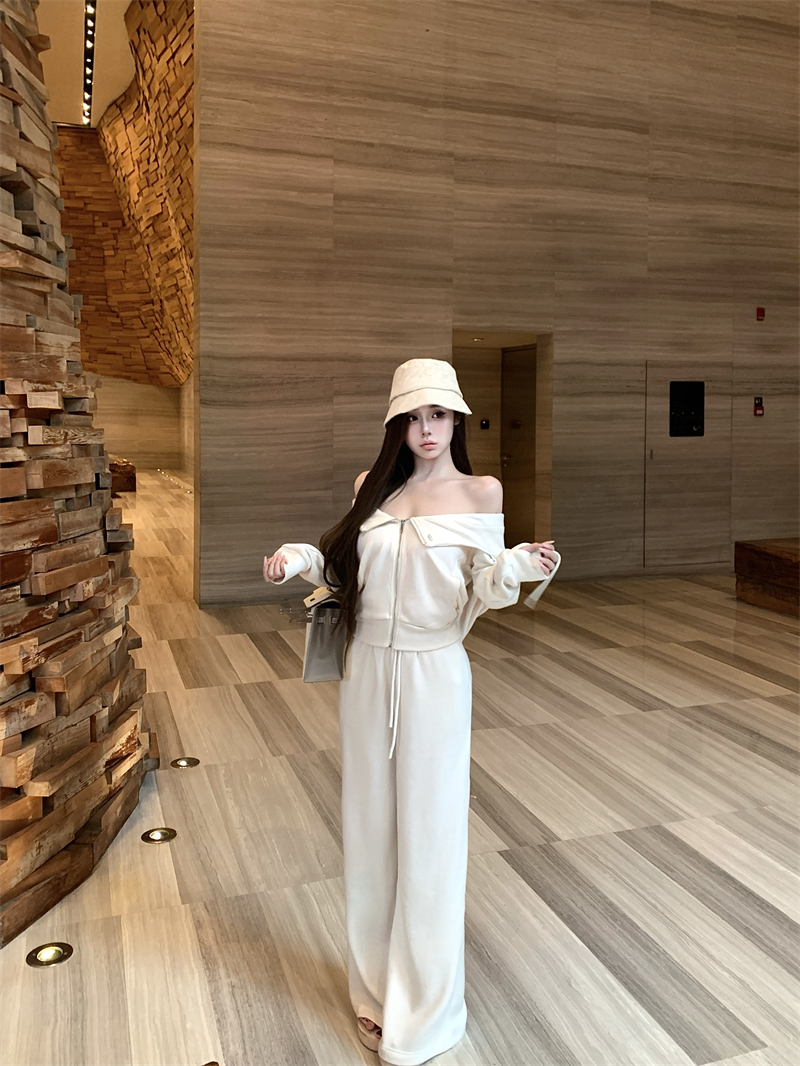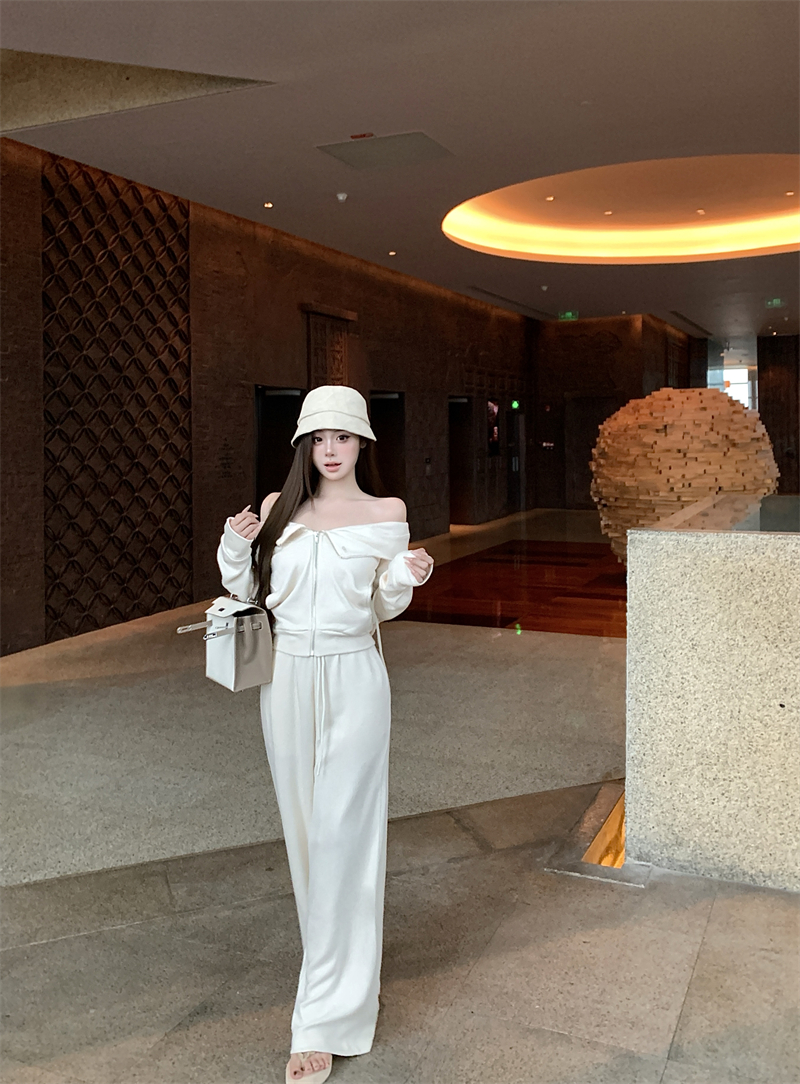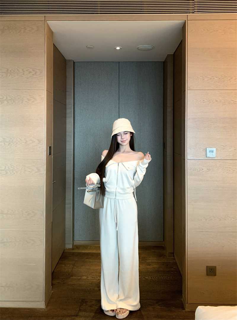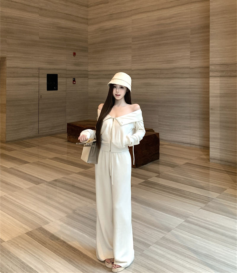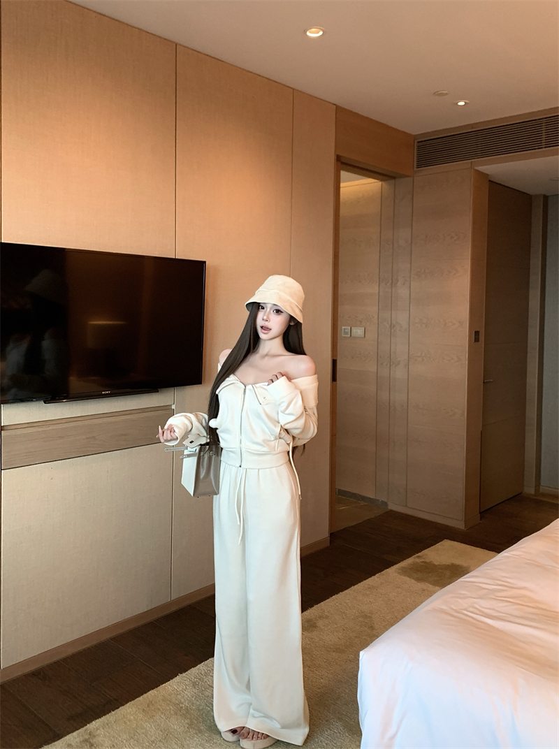 MY13682# 连帽一字肩卫衣长袖短款外套直筒休闲裤套装女裝貨源服裝批發