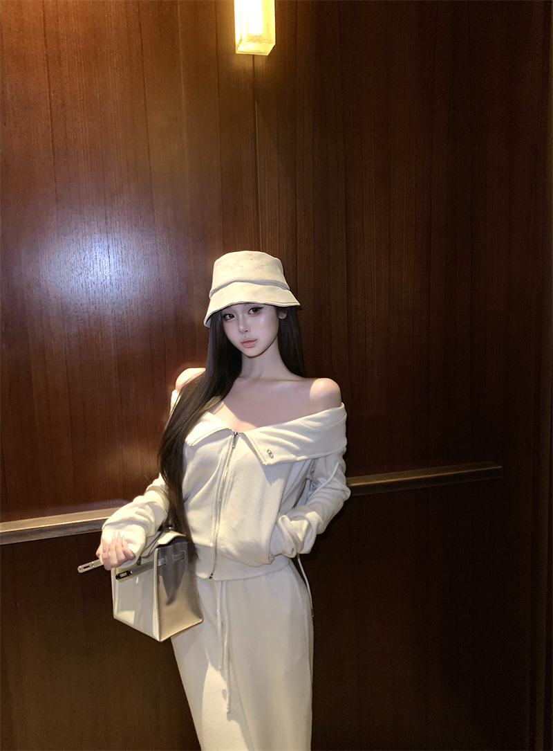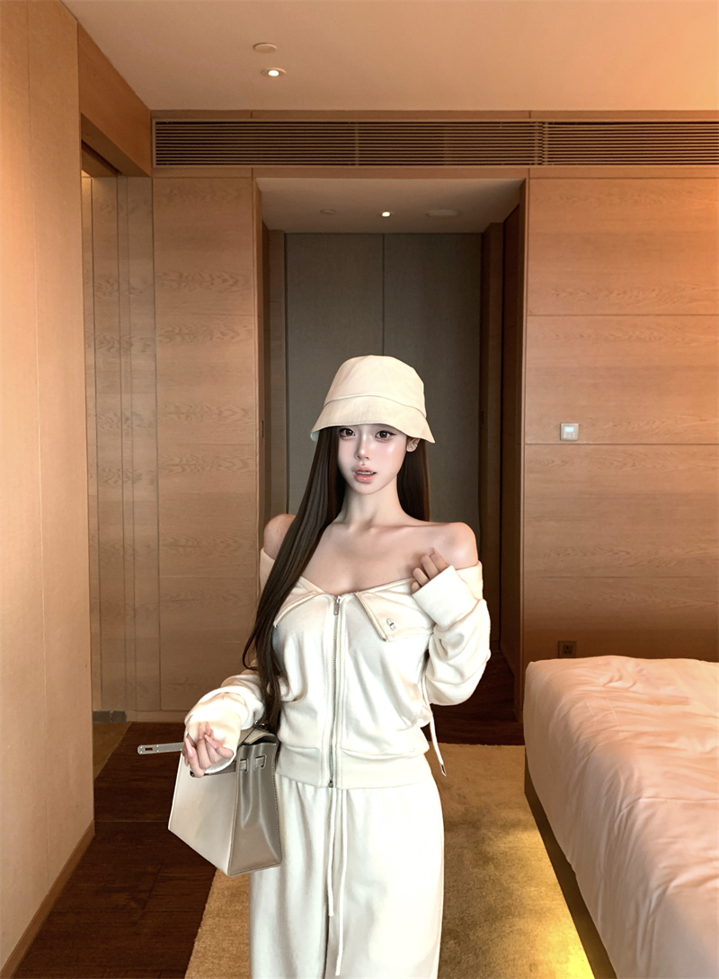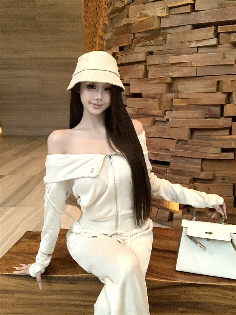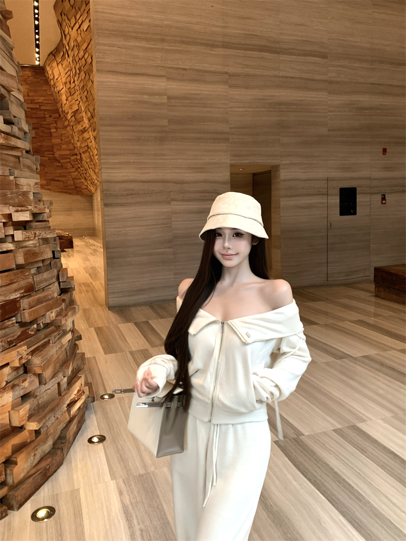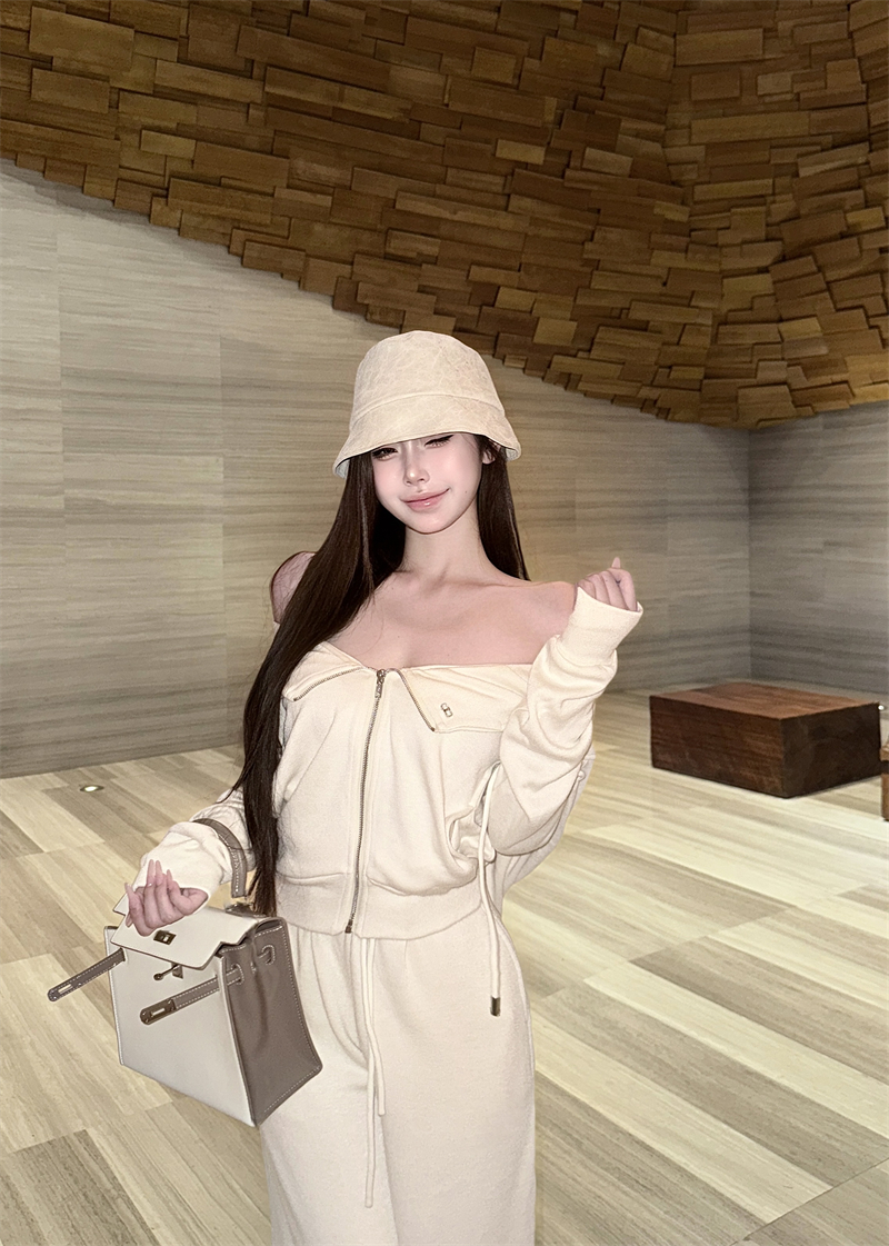 MY13682# 连帽一字肩卫衣长袖短款外套直筒休闲裤套装女裝貨源服裝批發
