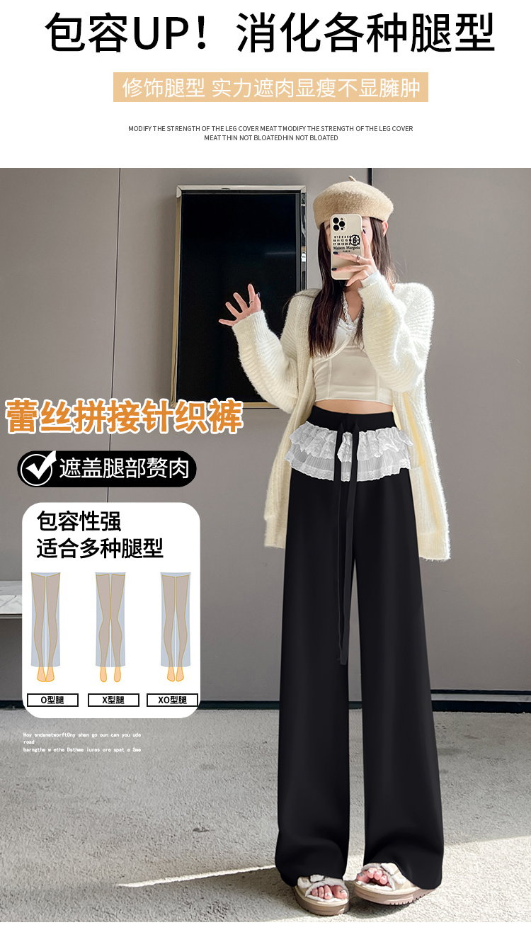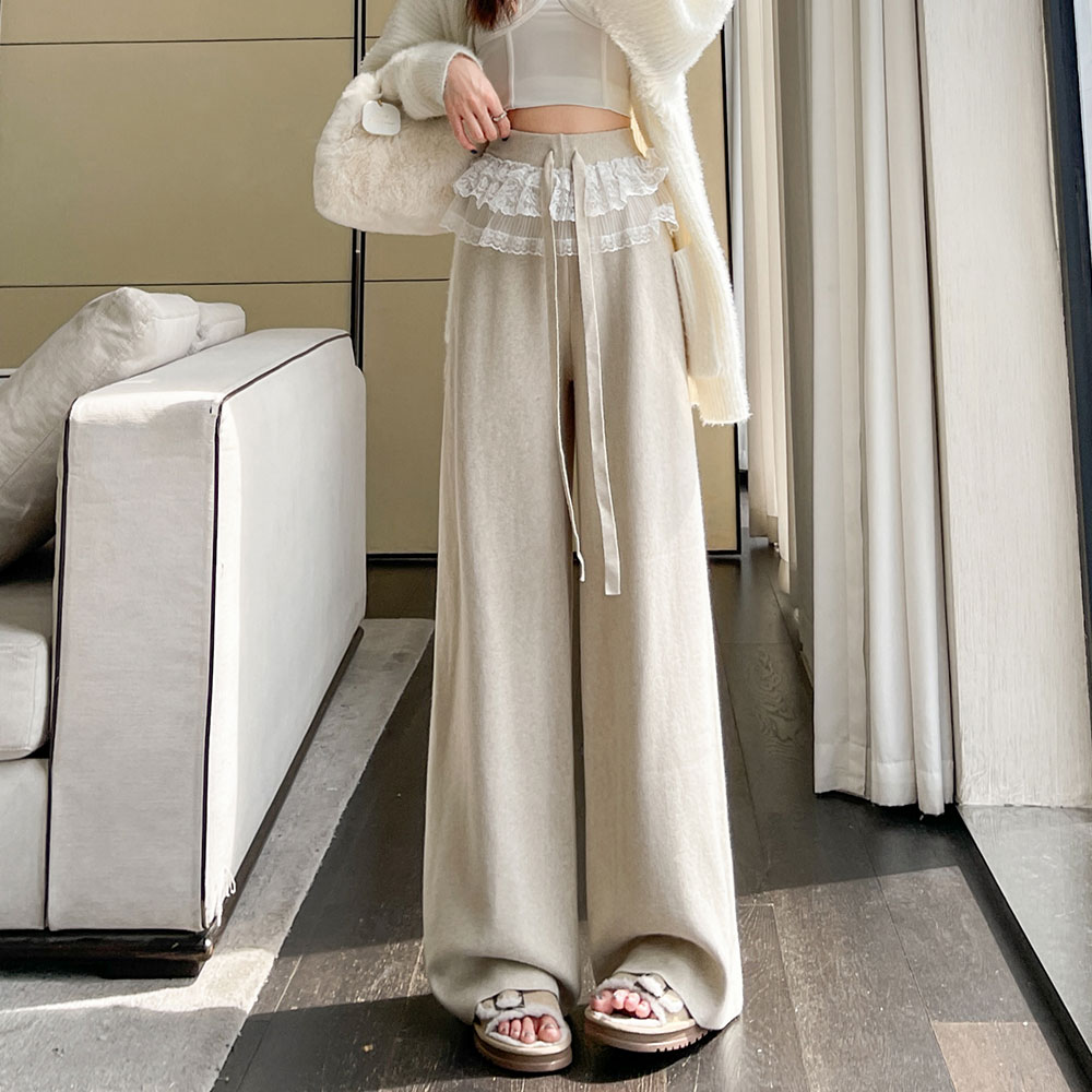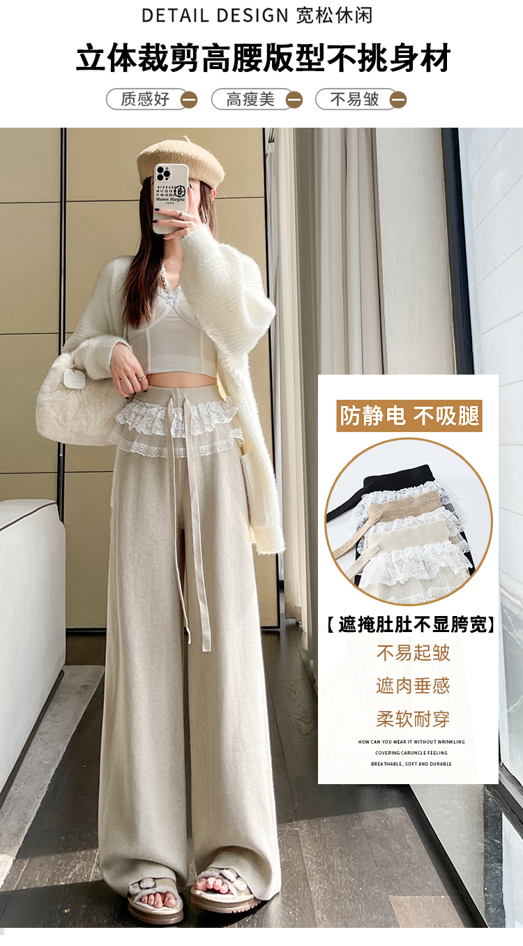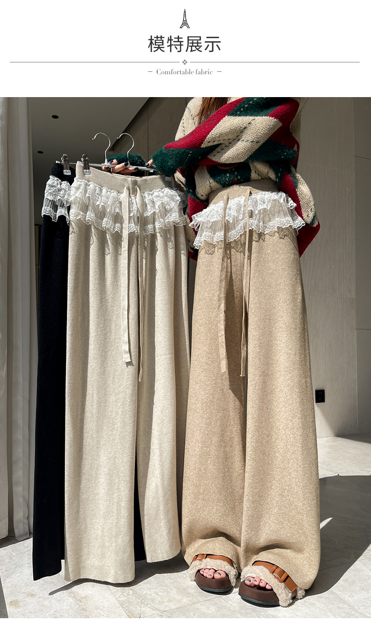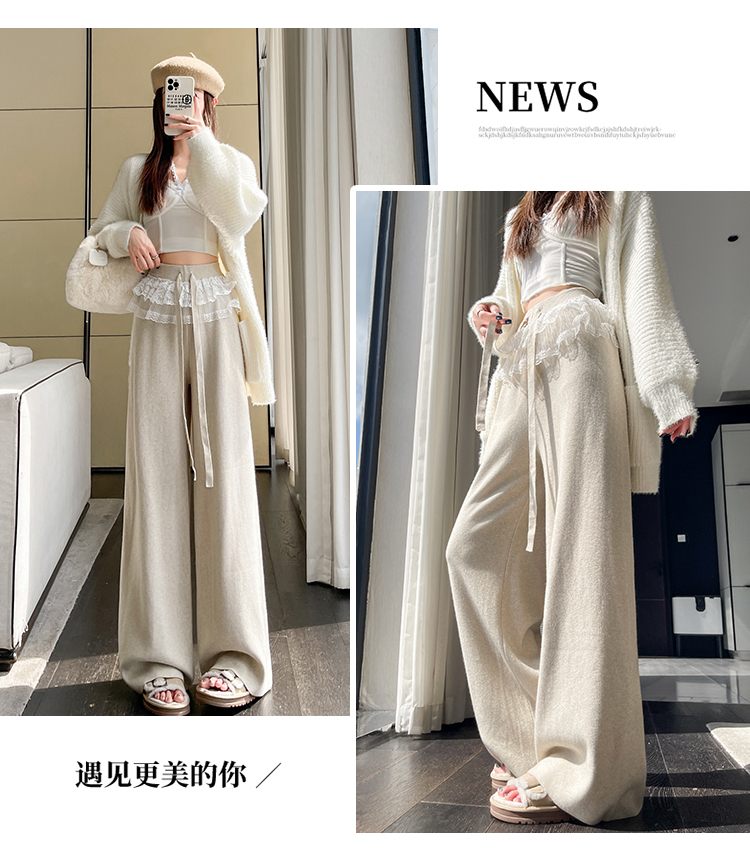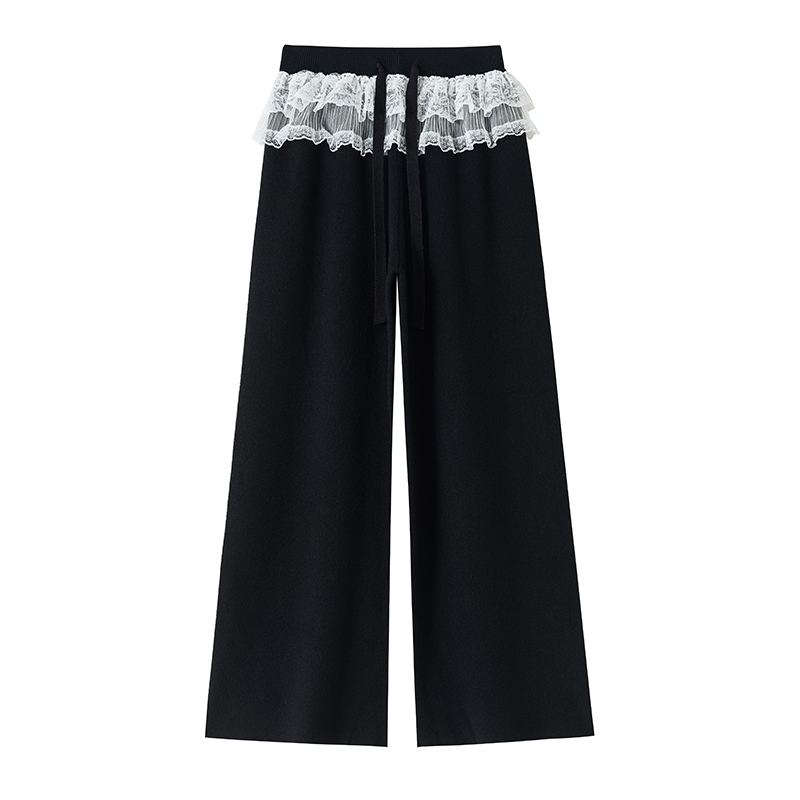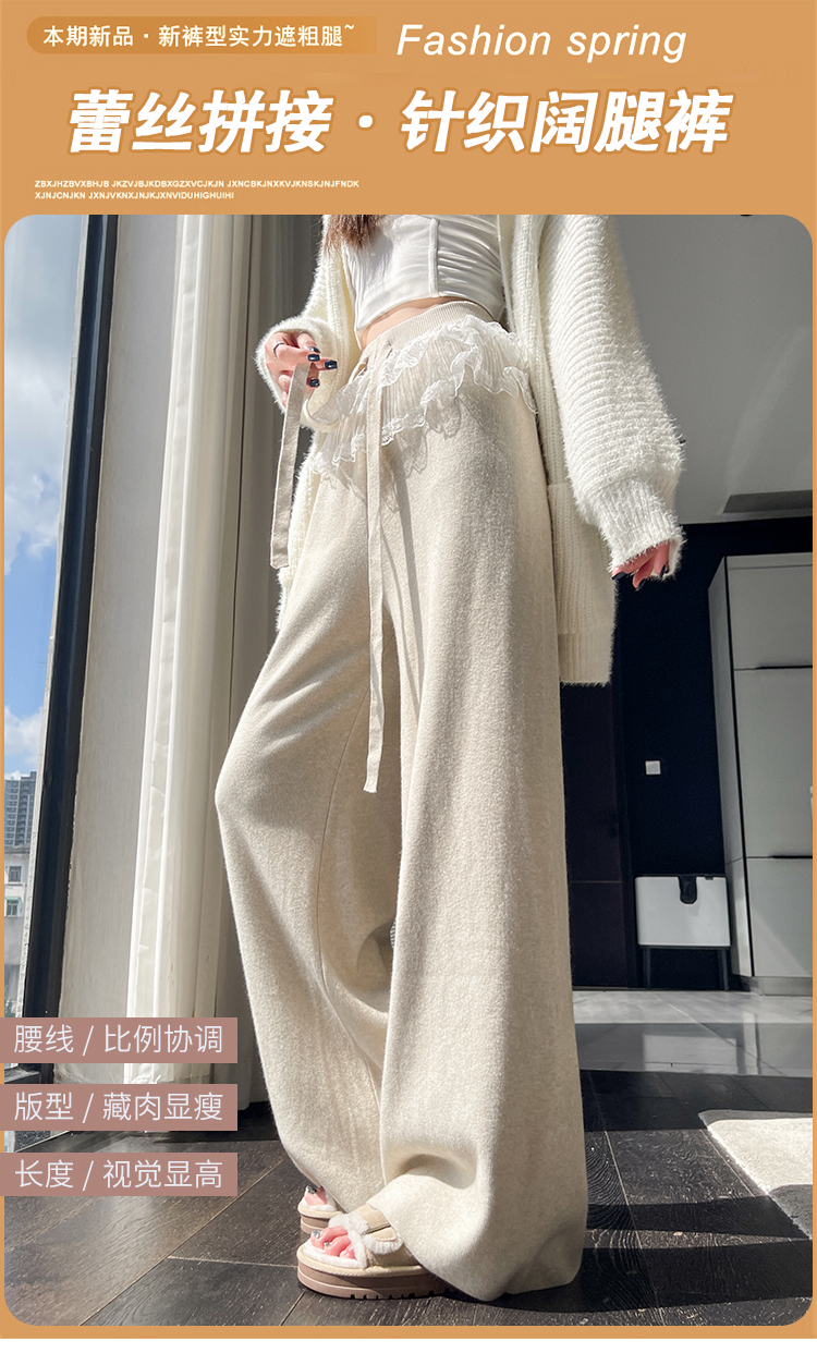 MY13720# 蕾丝拼接针织阔腿裤新款高腰显瘦慵懒垂感休闲裤子女裝貨源服裝批發