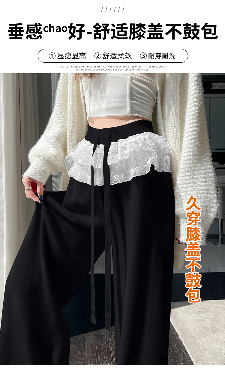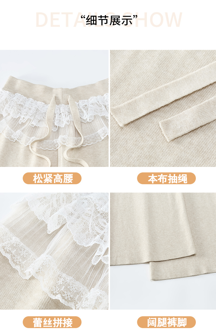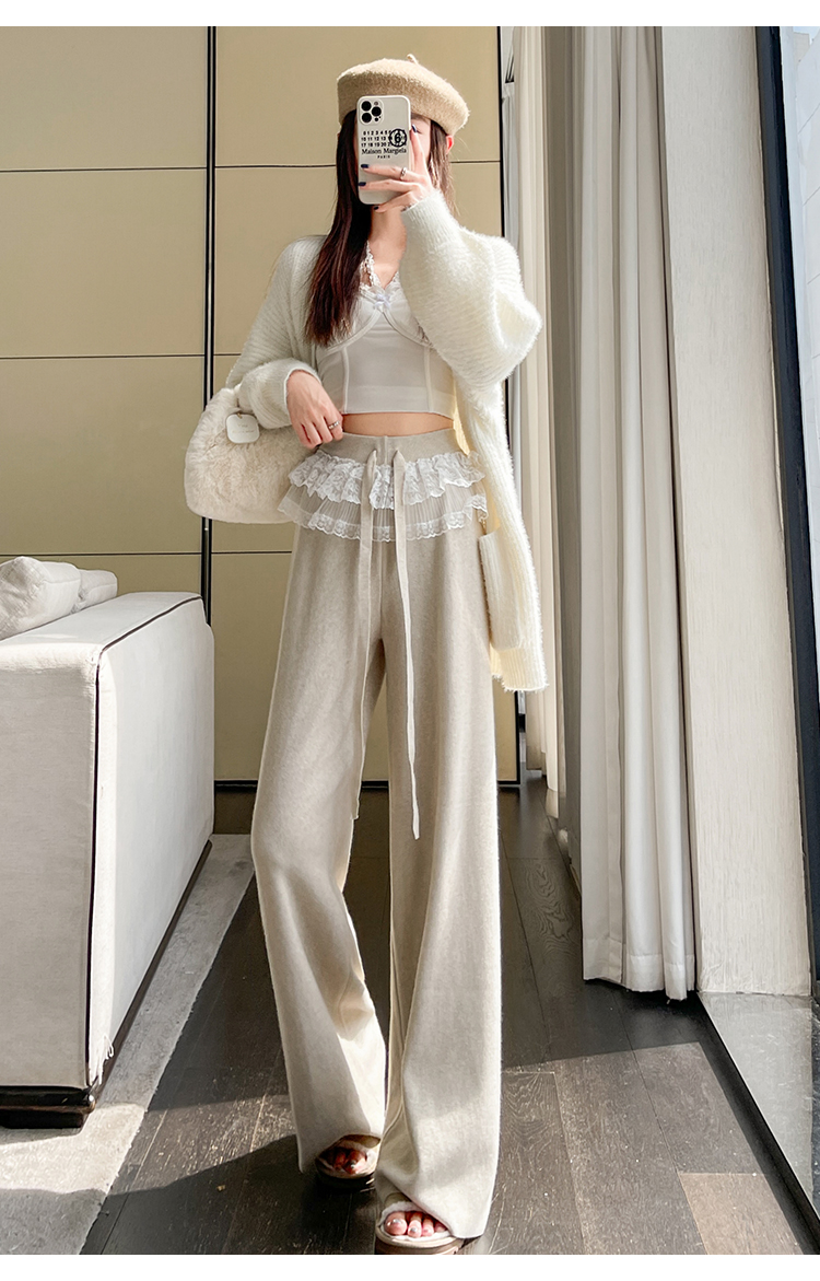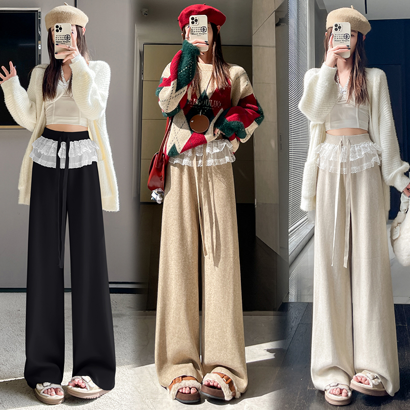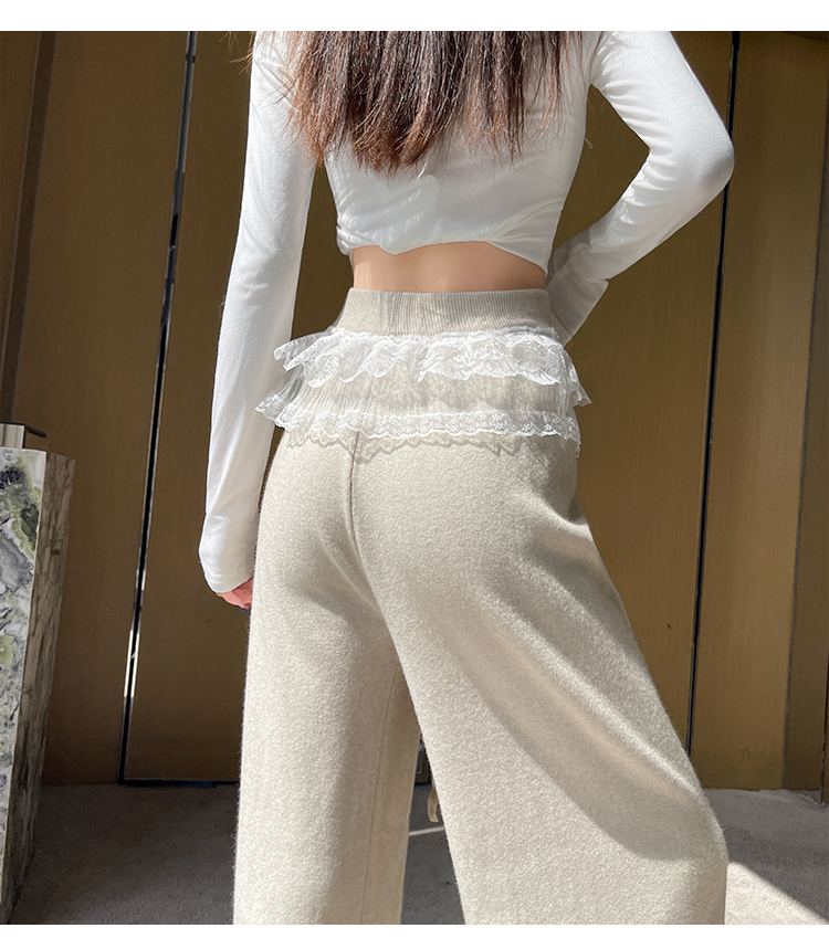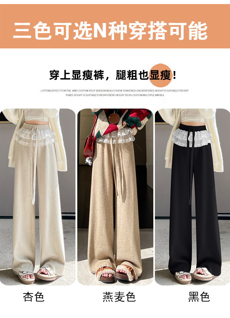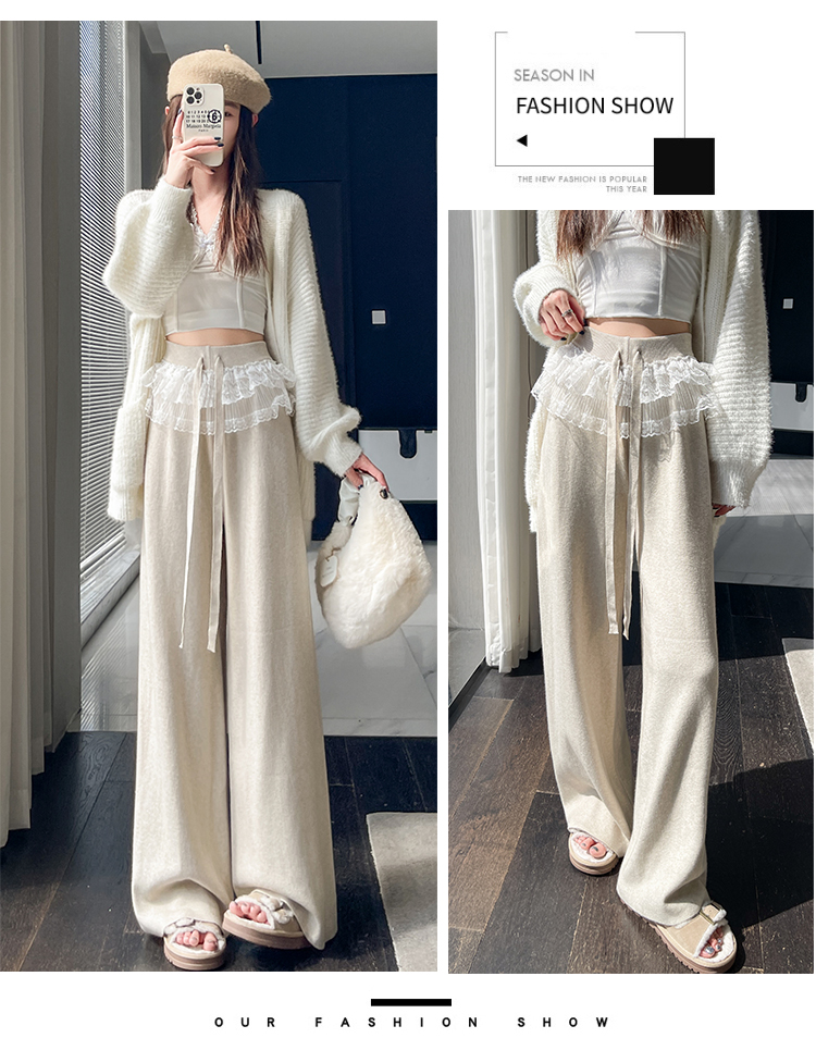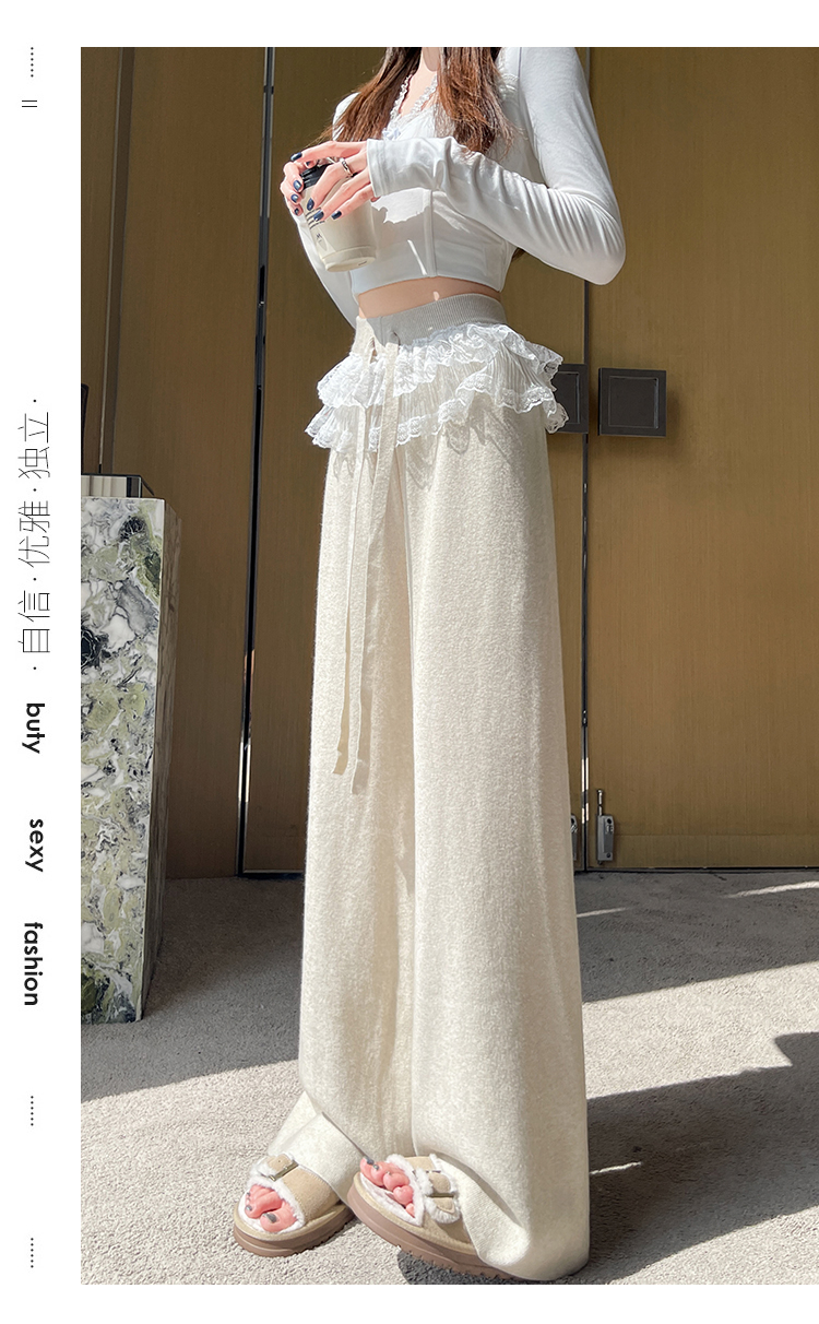 MY13720# 蕾丝拼接针织阔腿裤新款高腰显瘦慵懒垂感休闲裤子女裝貨源服裝批發