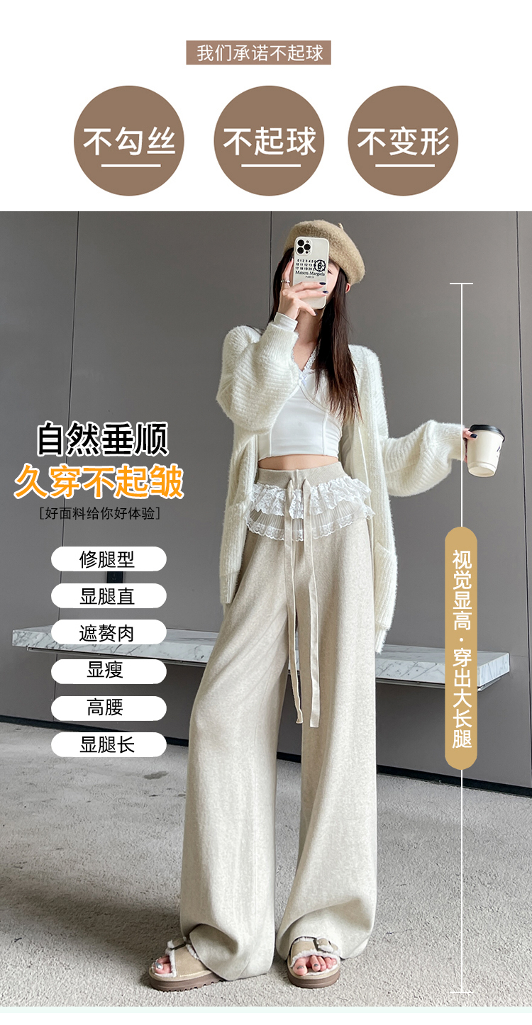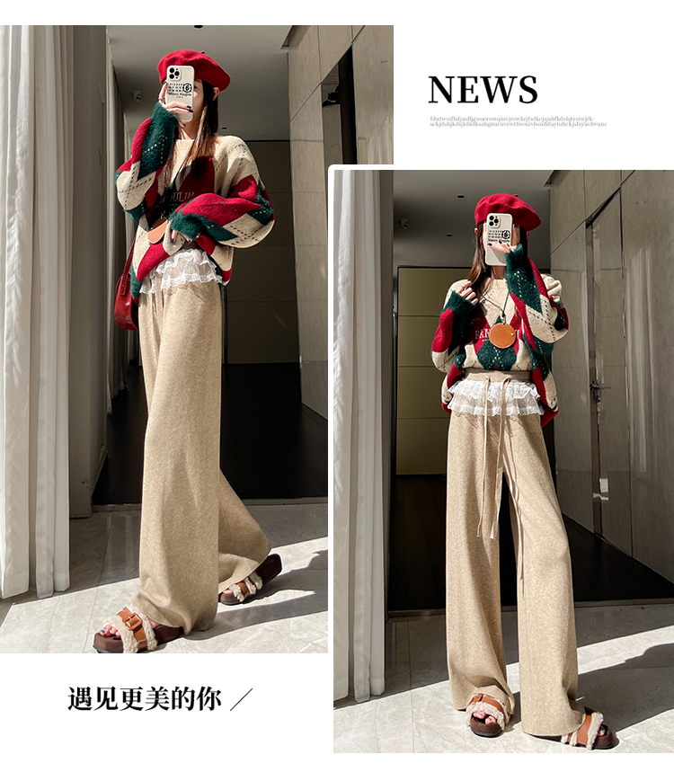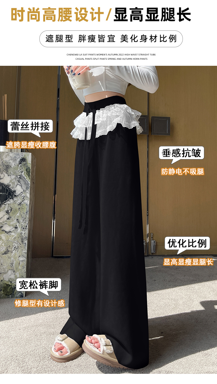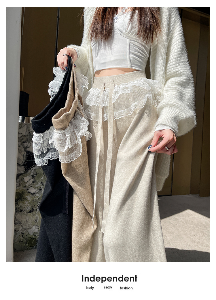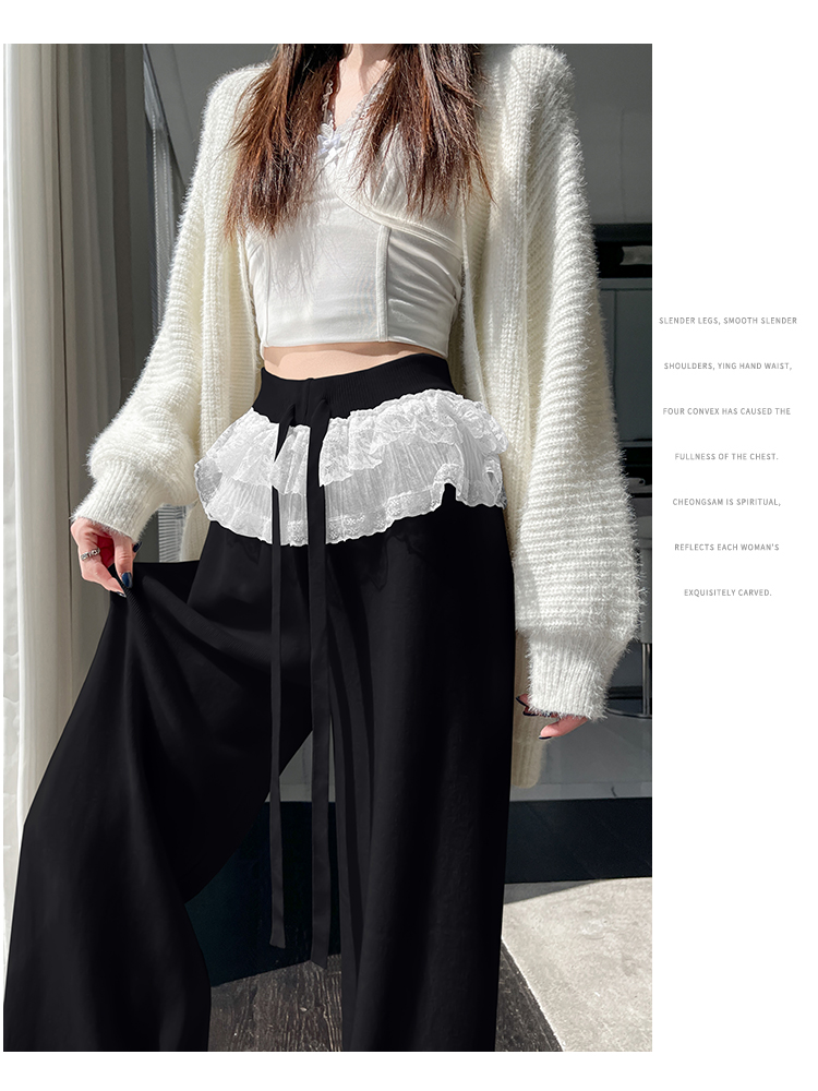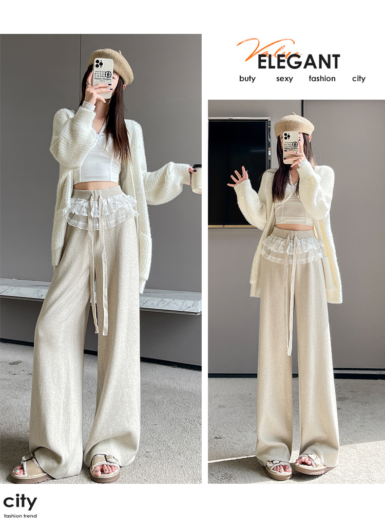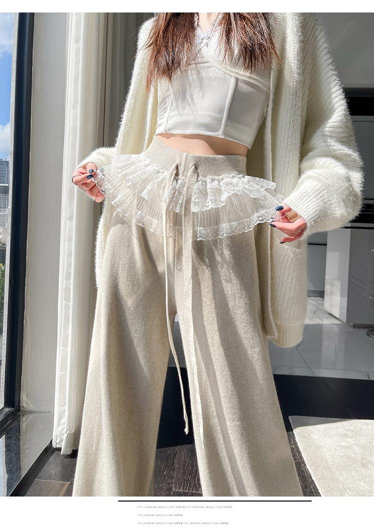 MY13720# 蕾丝拼接针织阔腿裤新款高腰显瘦慵懒垂感休闲裤子女裝貨源服裝批發