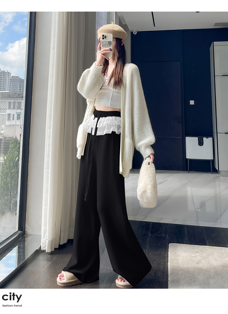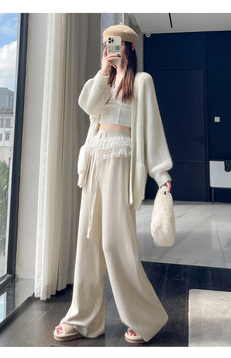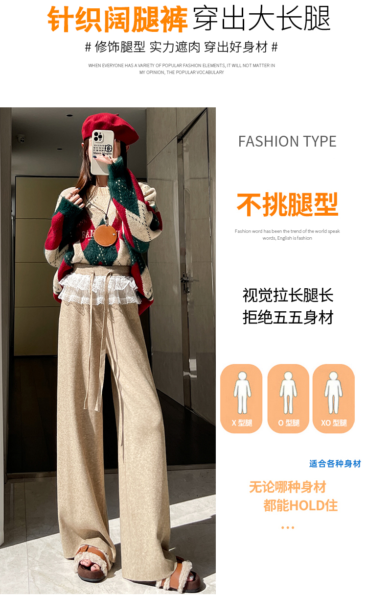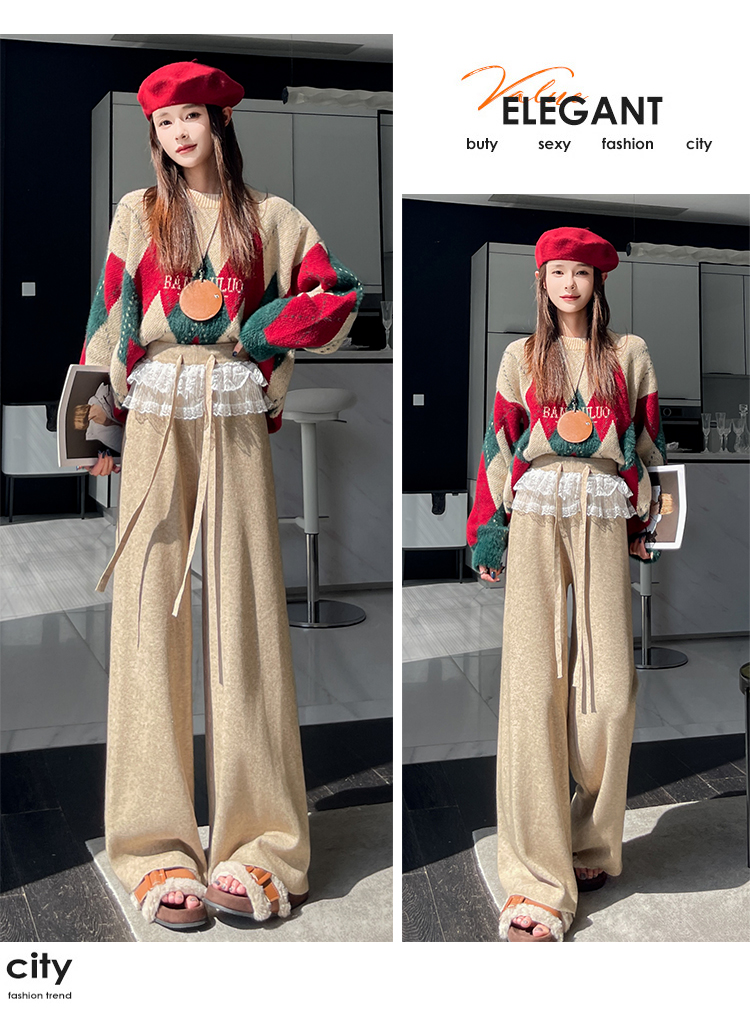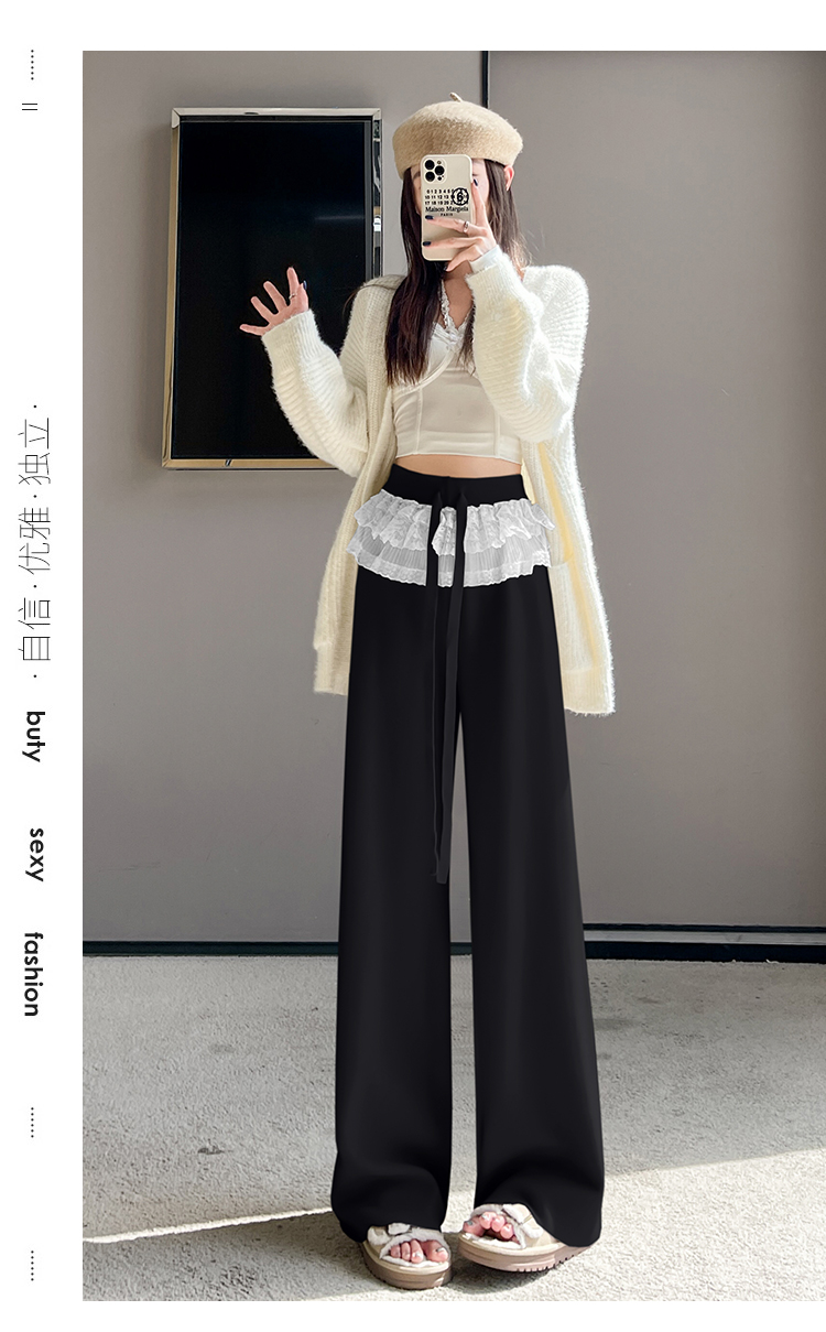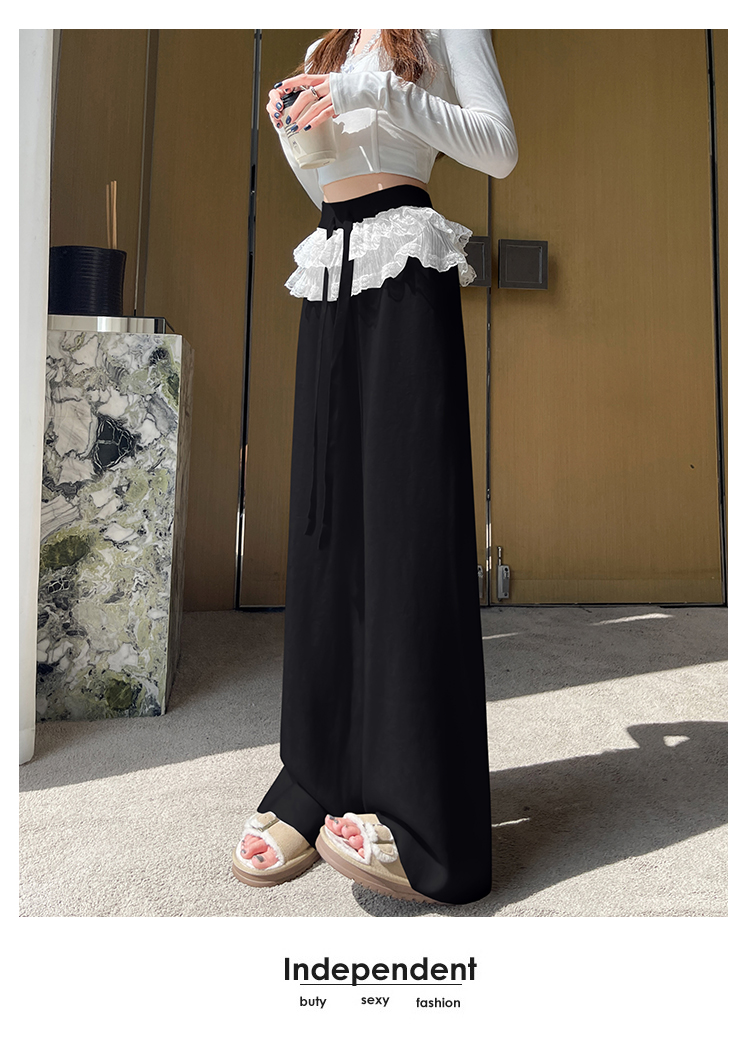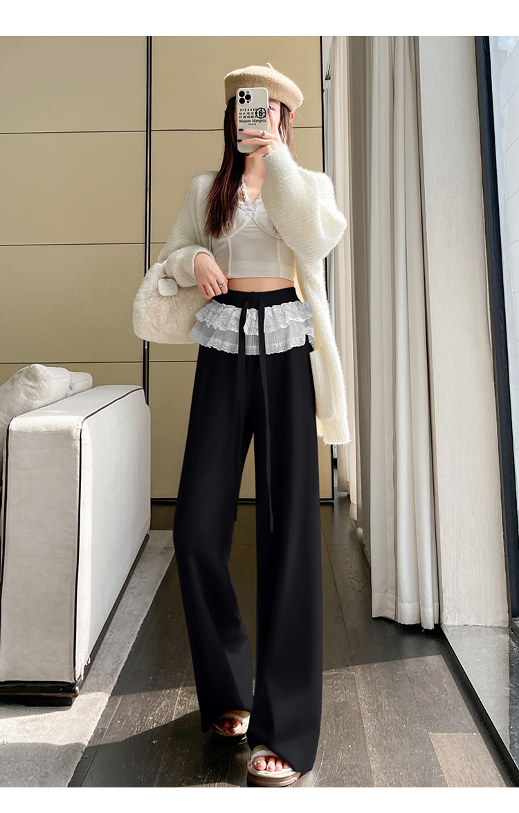 MY13720# 蕾丝拼接针织阔腿裤新款高腰显瘦慵懒垂感休闲裤子女裝貨源服裝批發