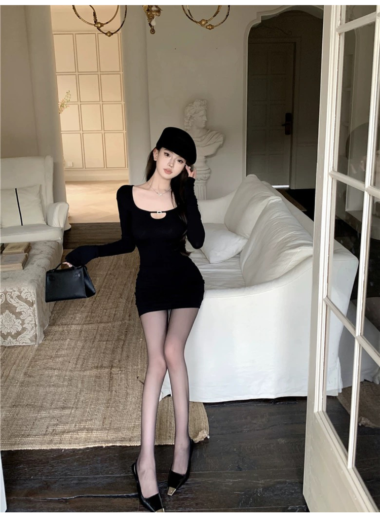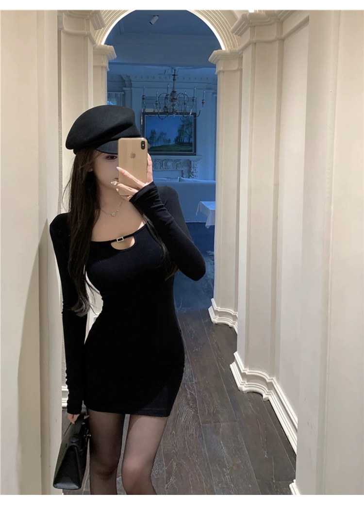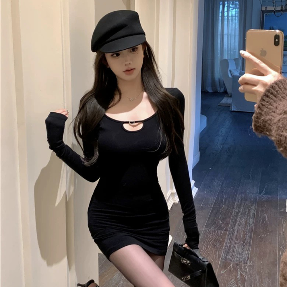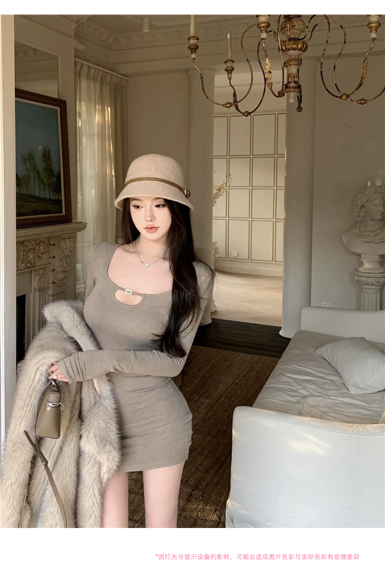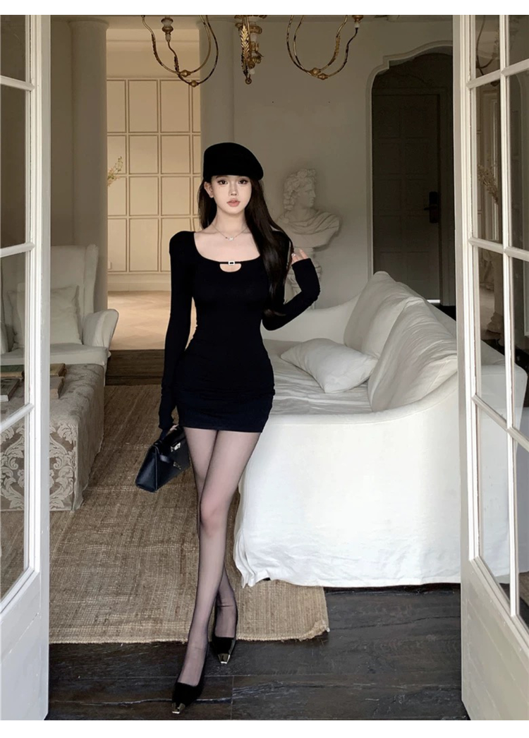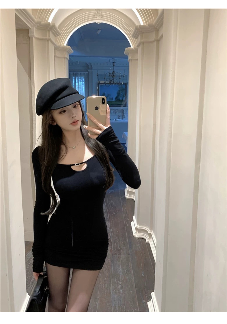 MY13723# 纯欲辣妹穿搭方领镂空长袖针织连衣裙女性感收腰显瘦百搭包臀裙女裝貨源服裝批發
