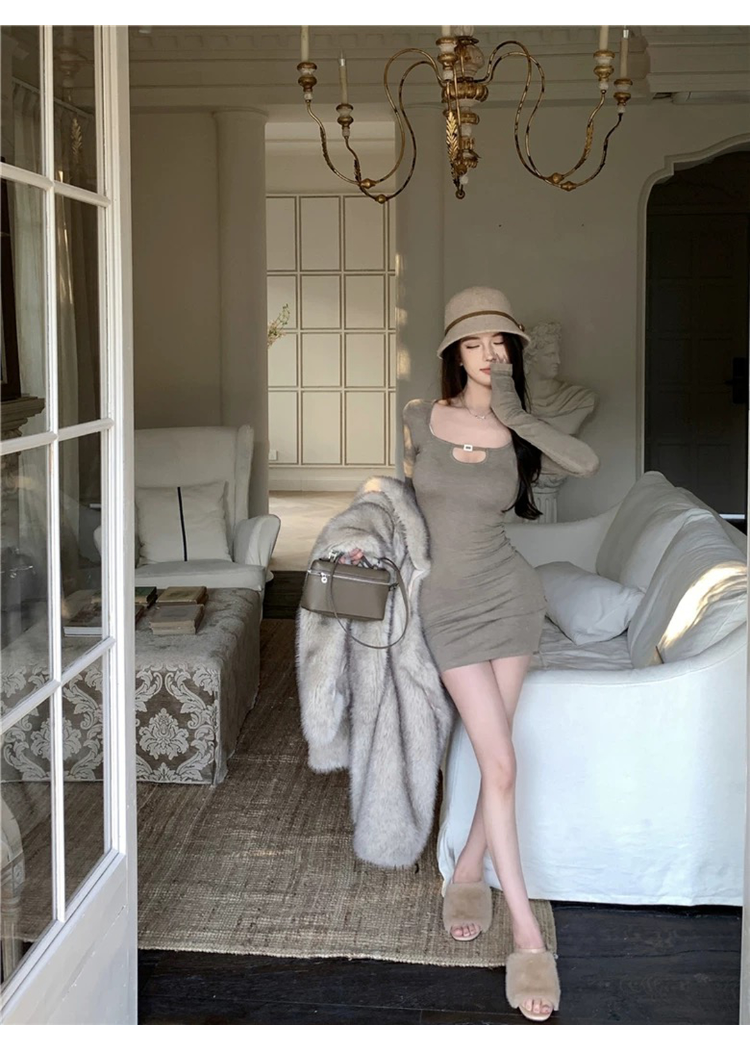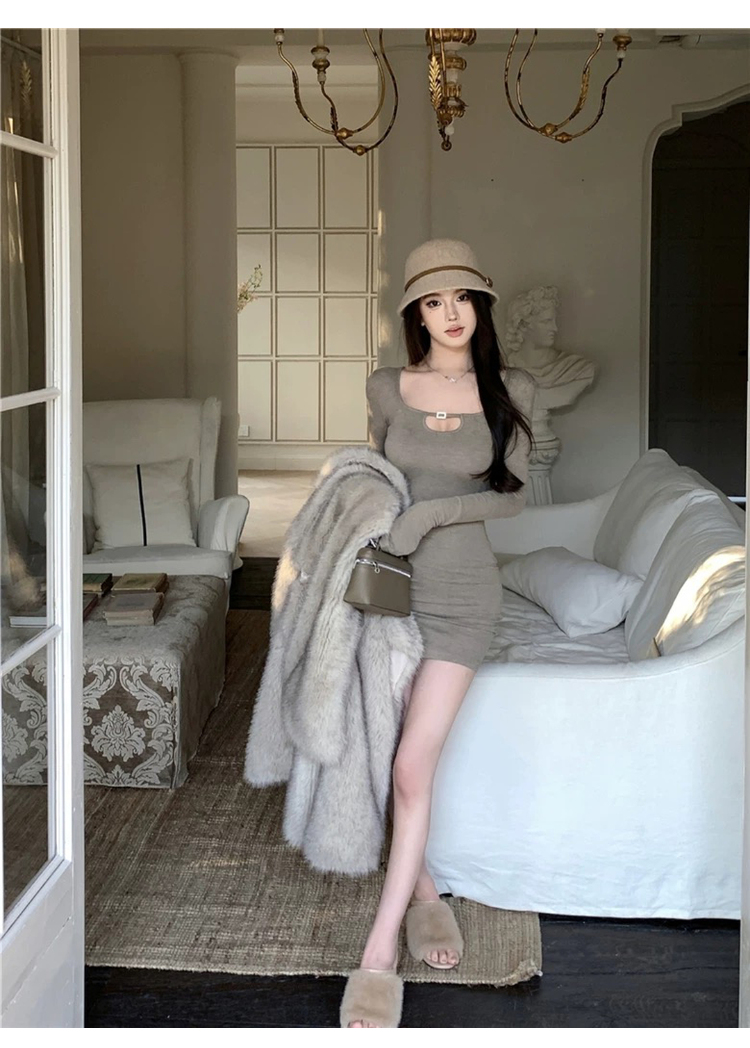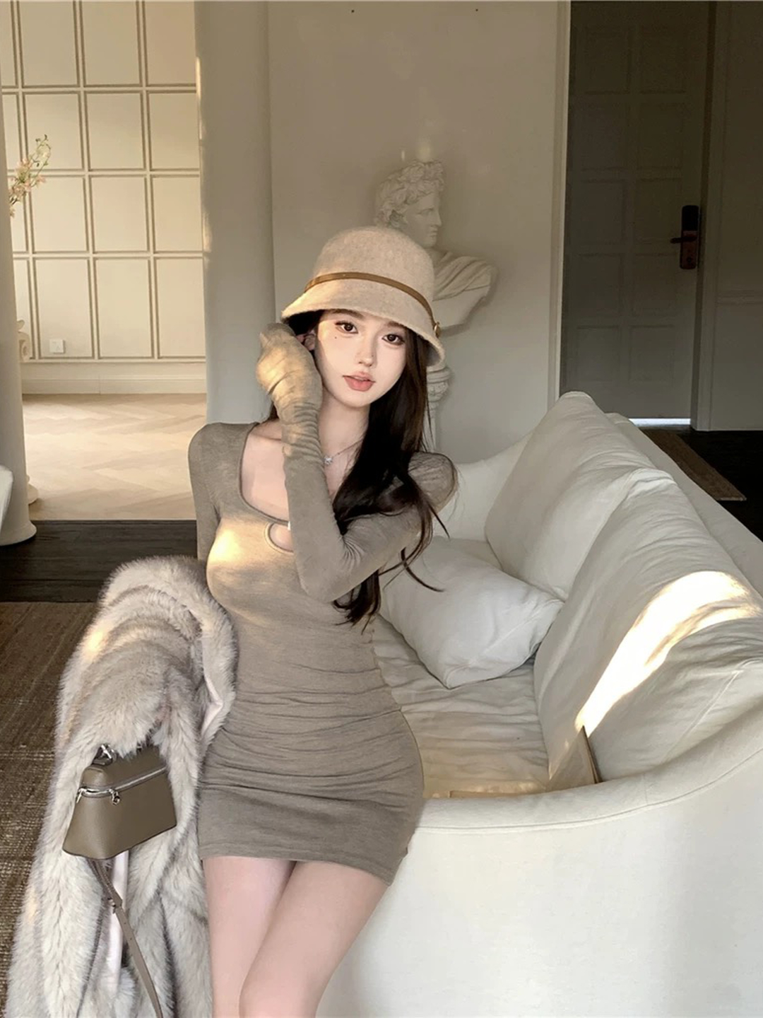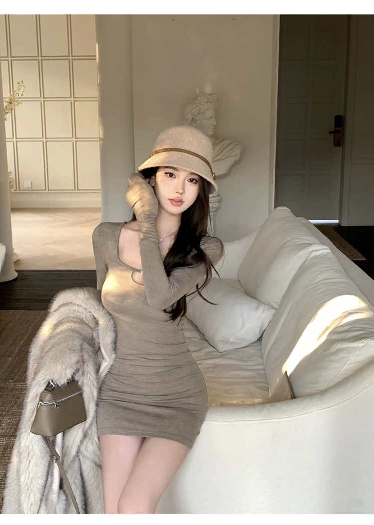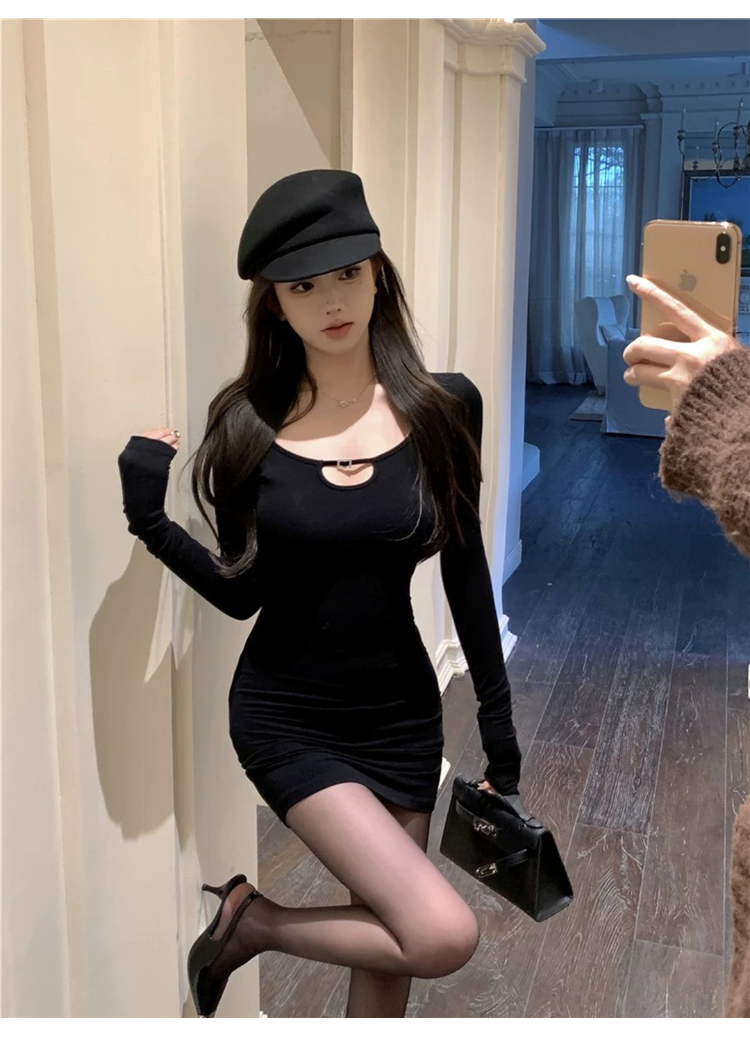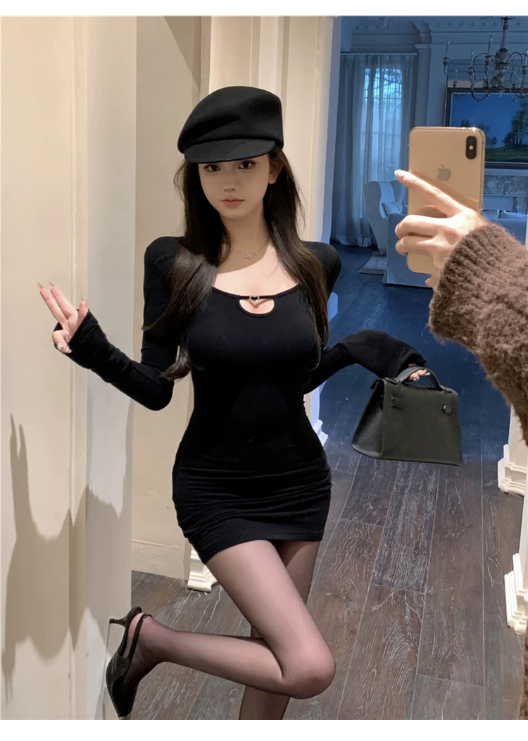 MY13723# 纯欲辣妹穿搭方领镂空长袖针织连衣裙女性感收腰显瘦百搭包臀裙女裝貨源服裝批發