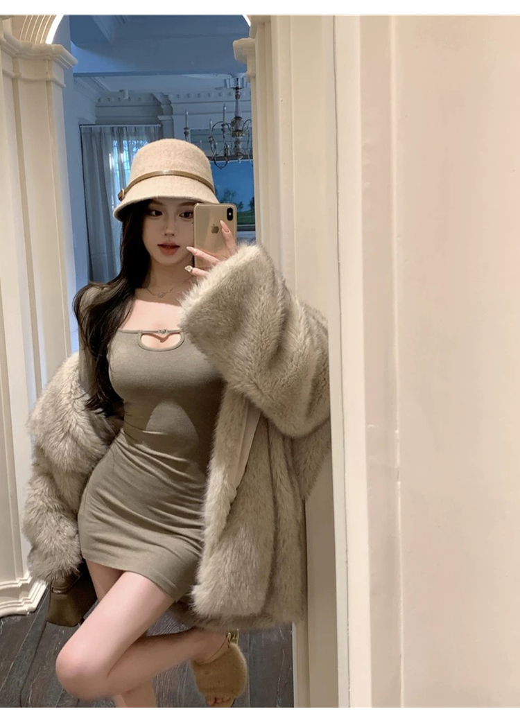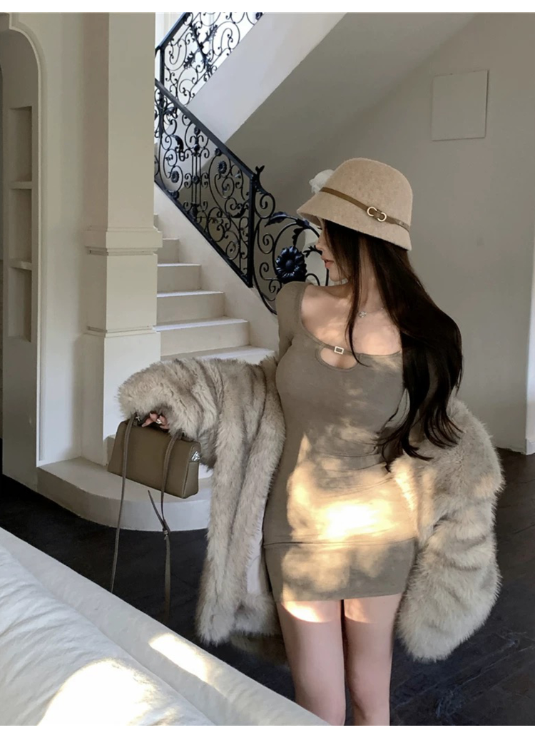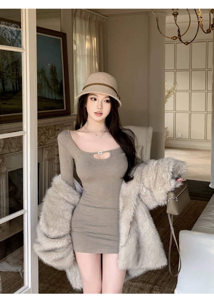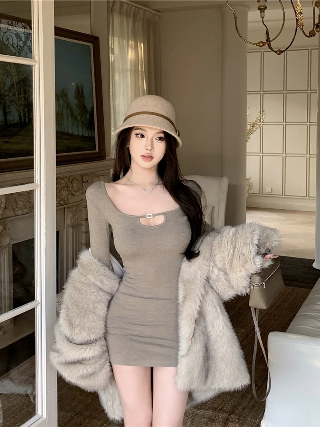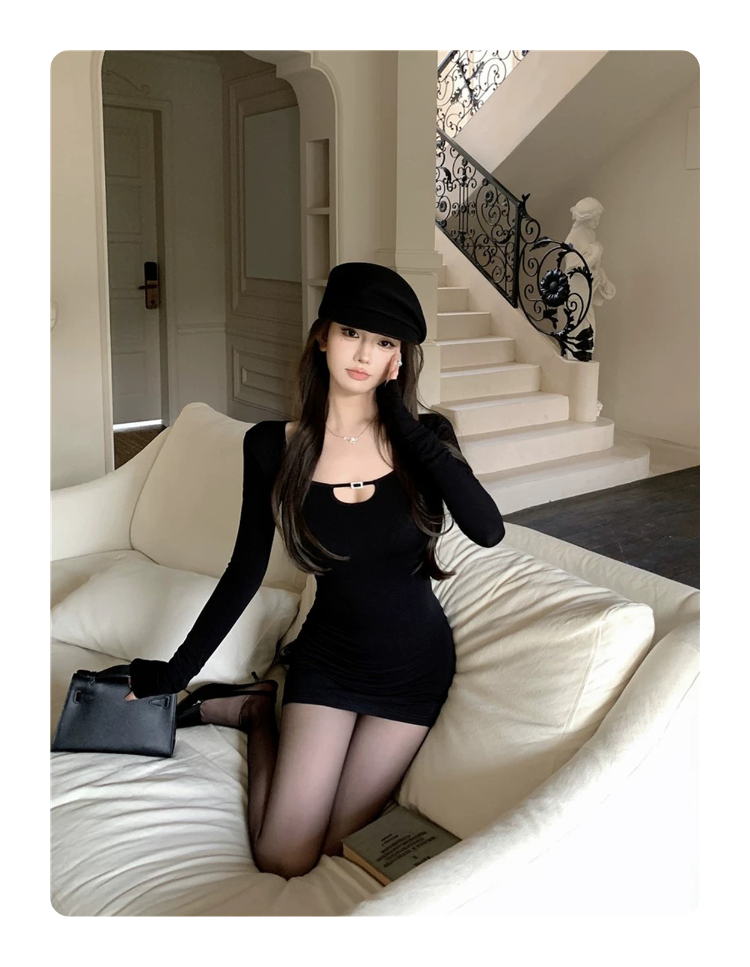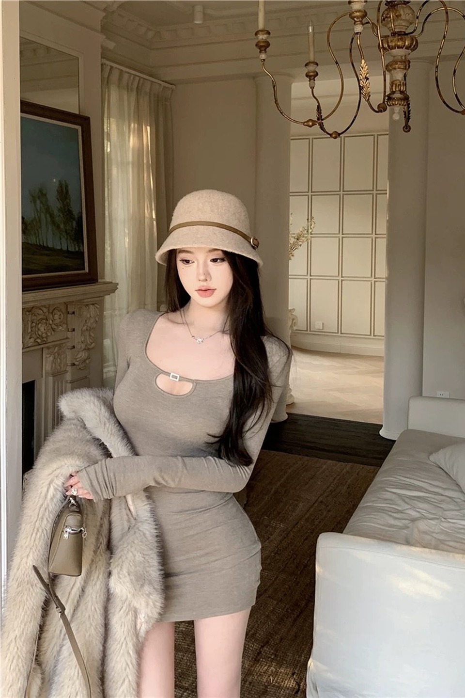 MY13723# 纯欲辣妹穿搭方领镂空长袖针织连衣裙女性感收腰显瘦百搭包臀裙女裝貨源服裝批發
