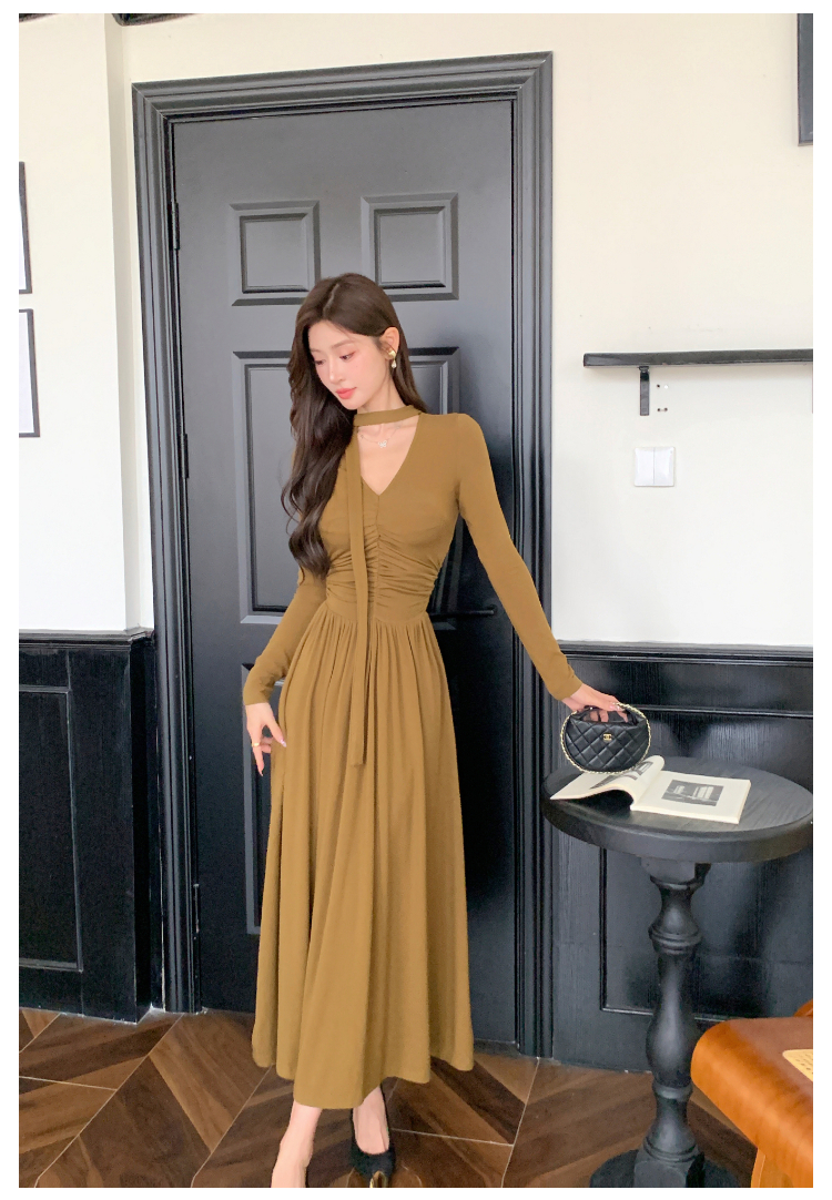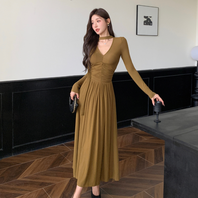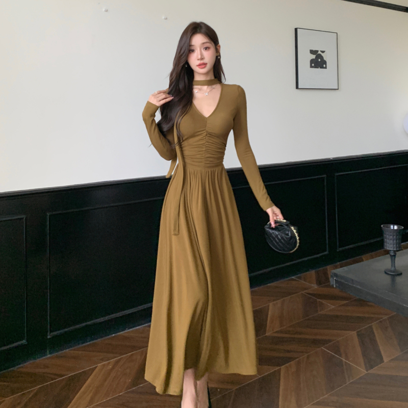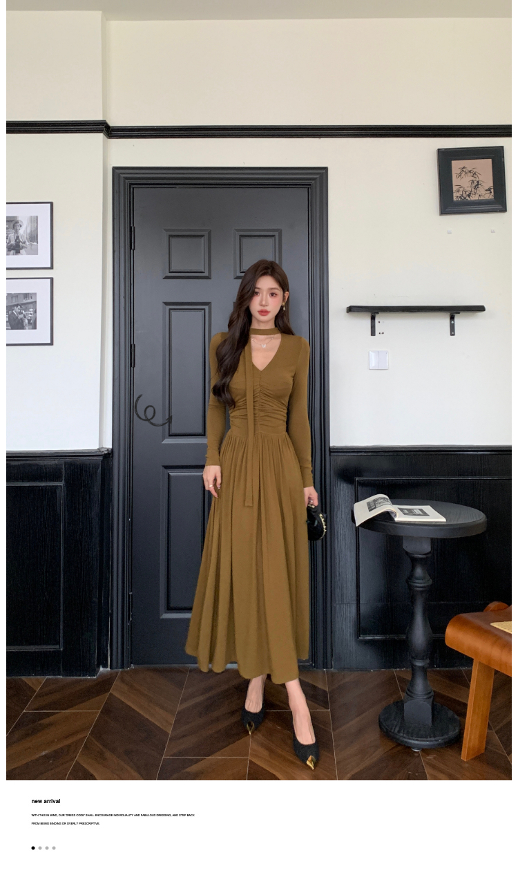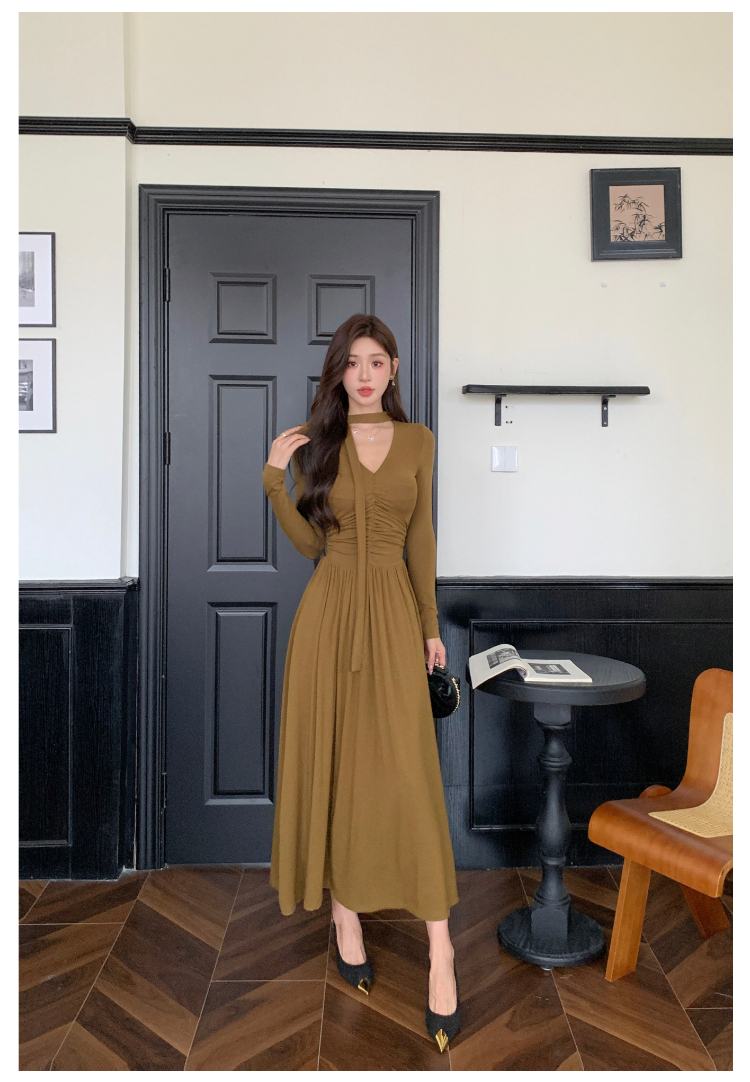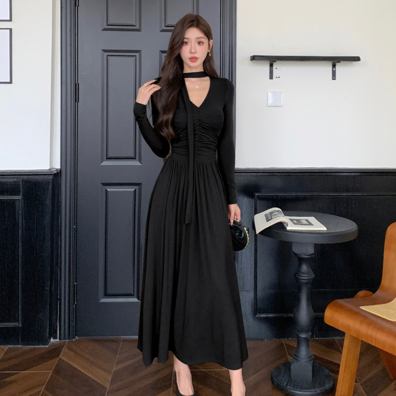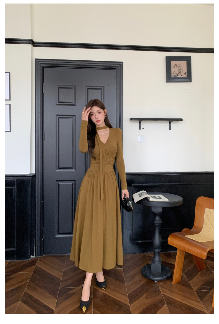 MY13729# 小众设计感褶皱飘带连衣裙女蠢修身显瘦a字针织长裙女裝貨源服裝批發