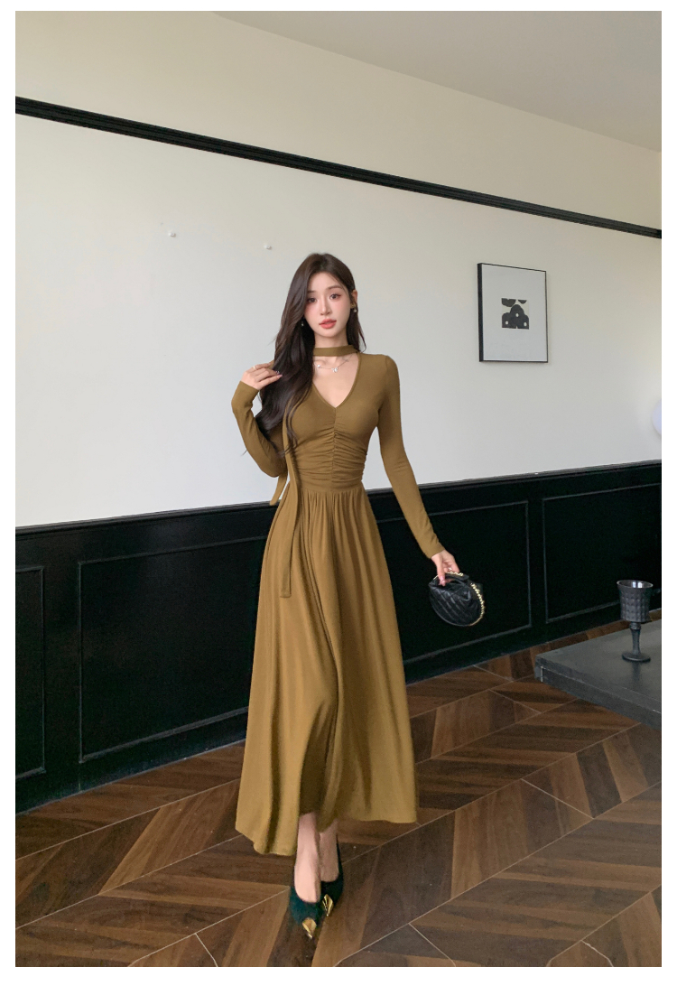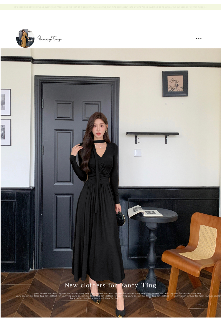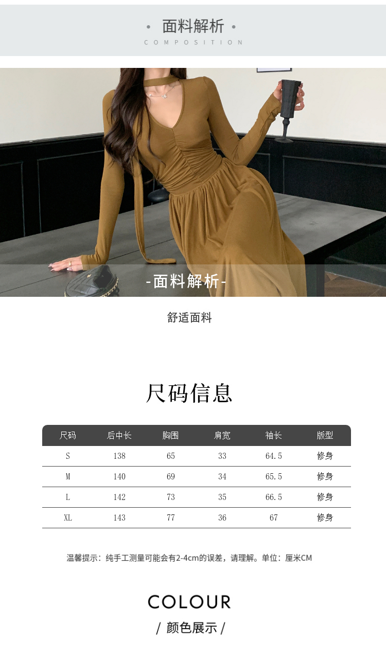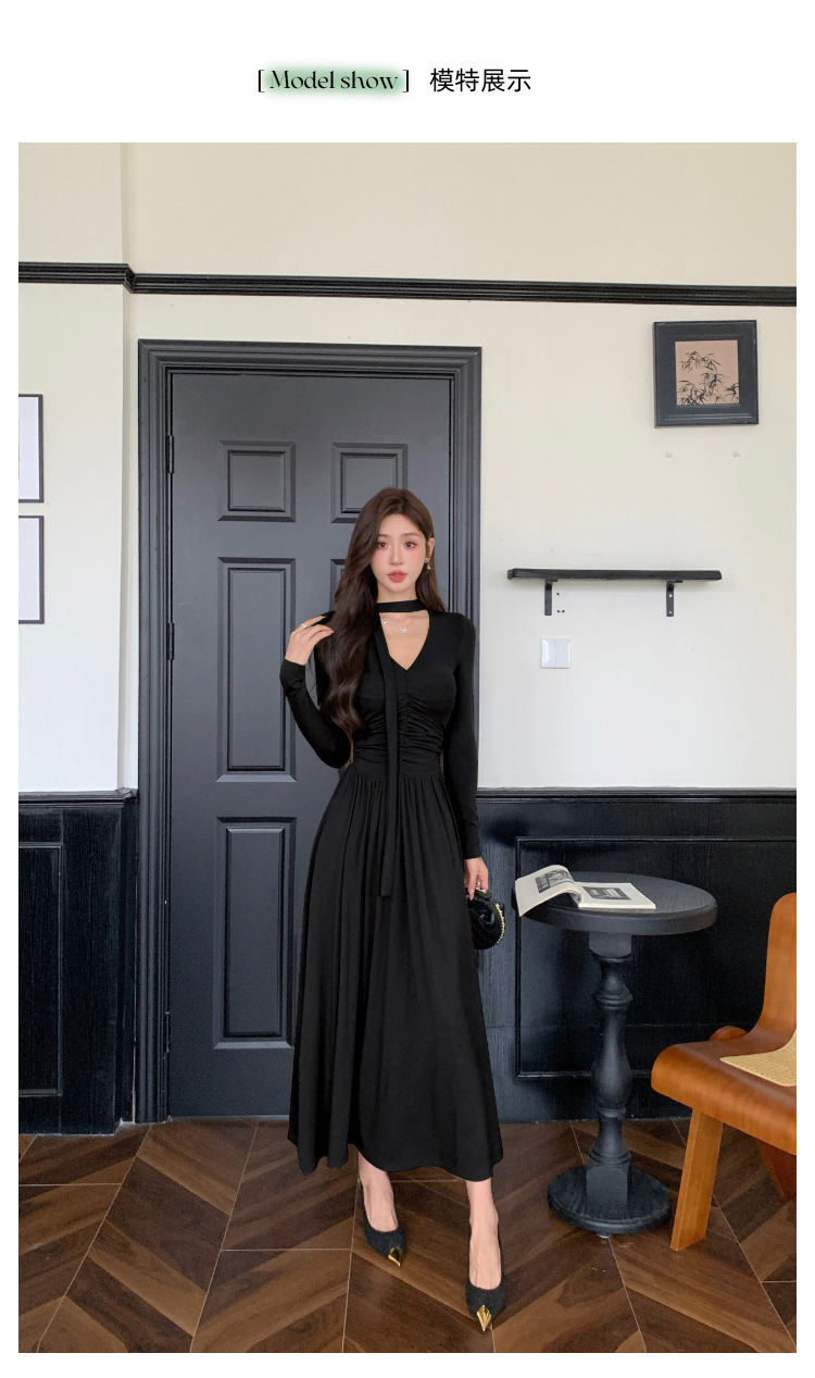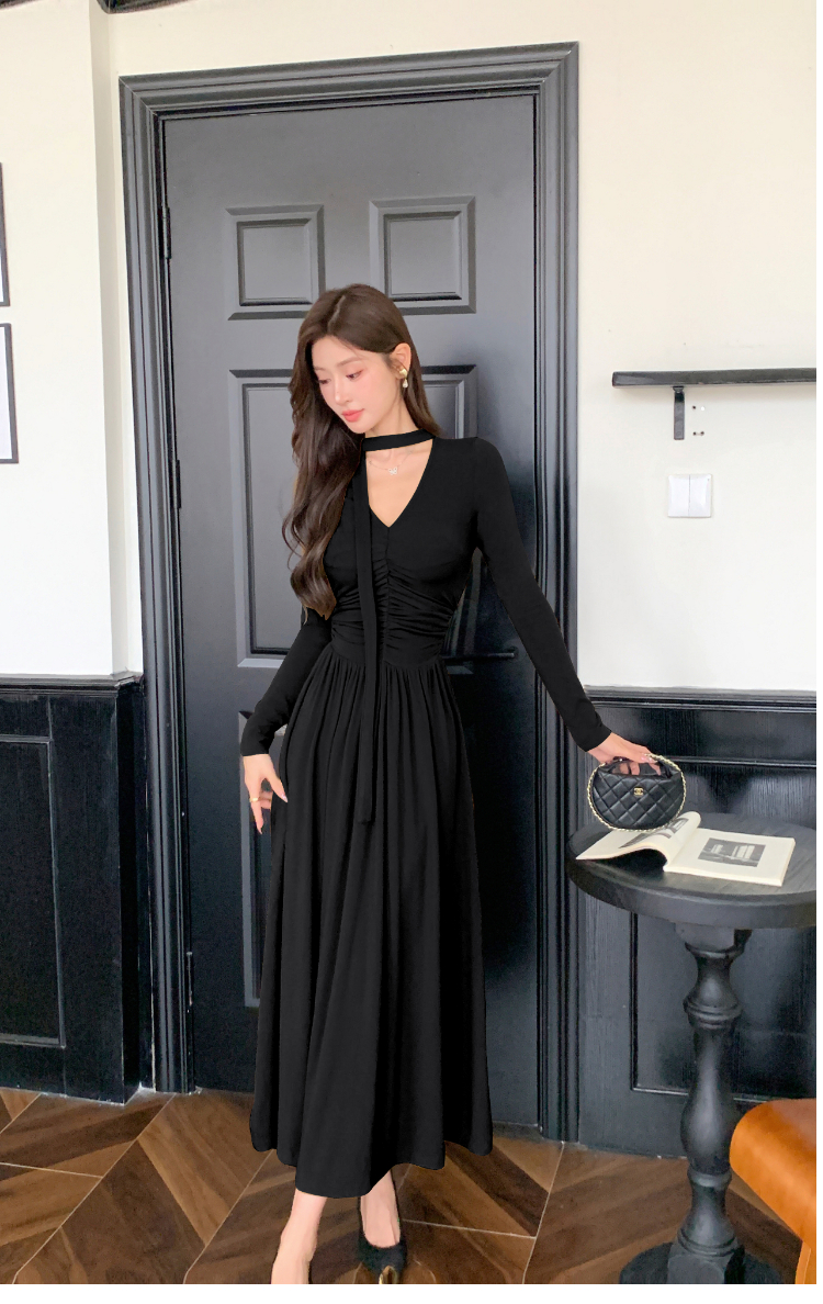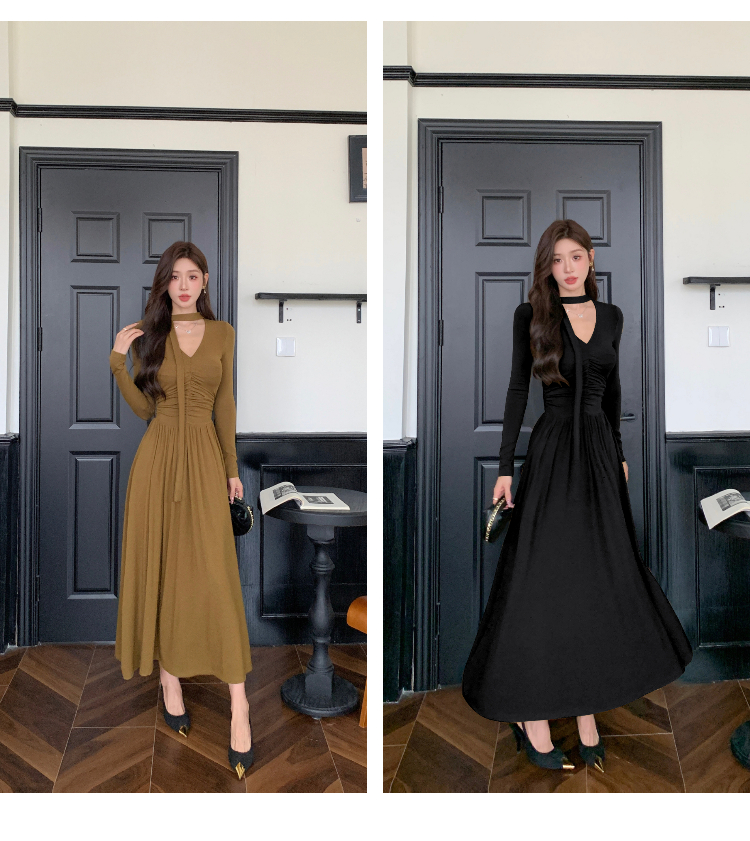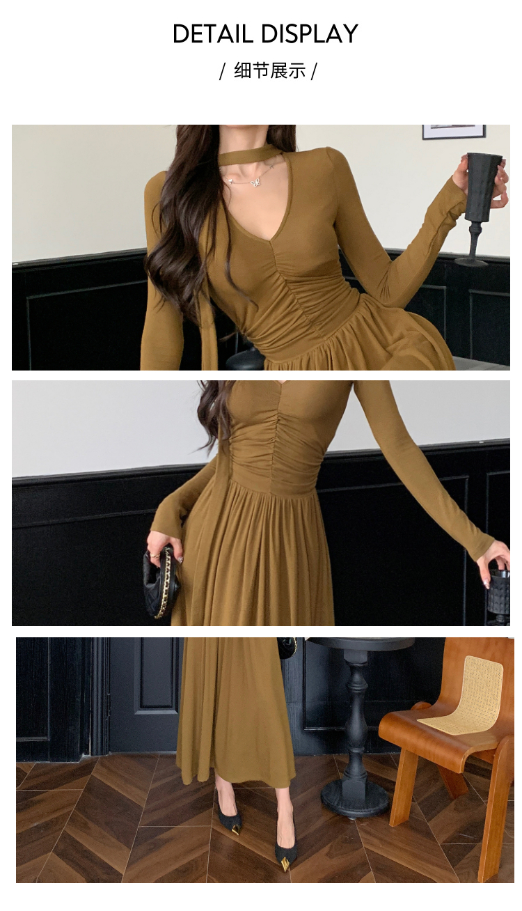 MY13729# 小众设计感褶皱飘带连衣裙女蠢修身显瘦a字针织长裙女裝貨源服裝批發