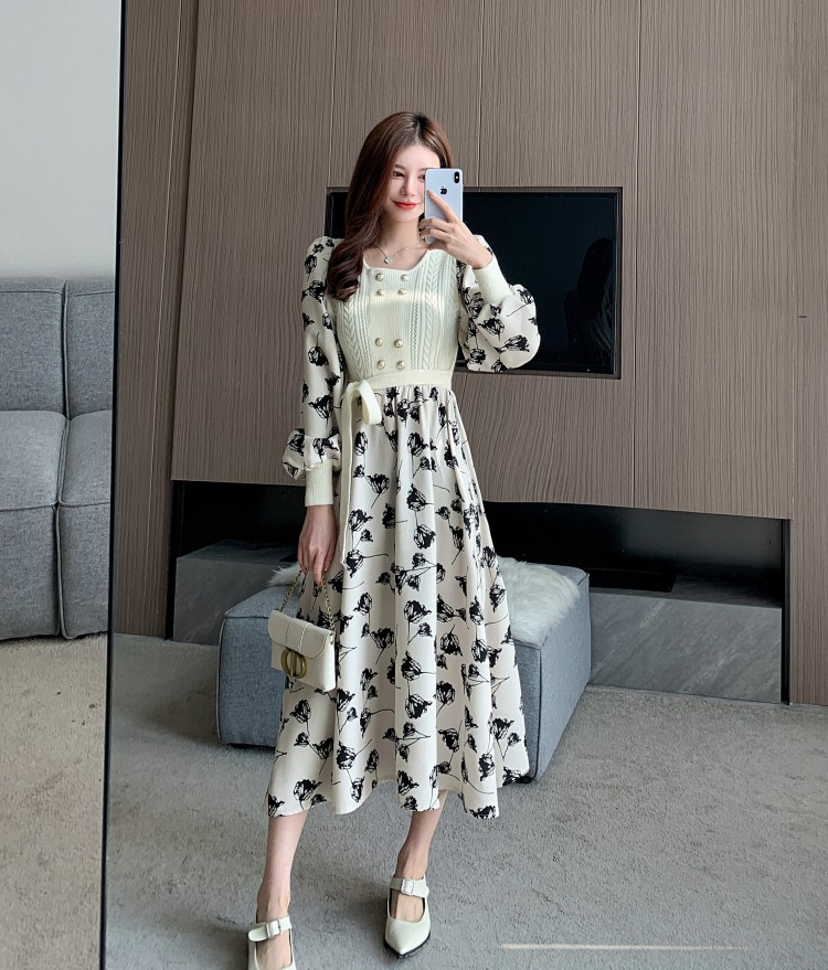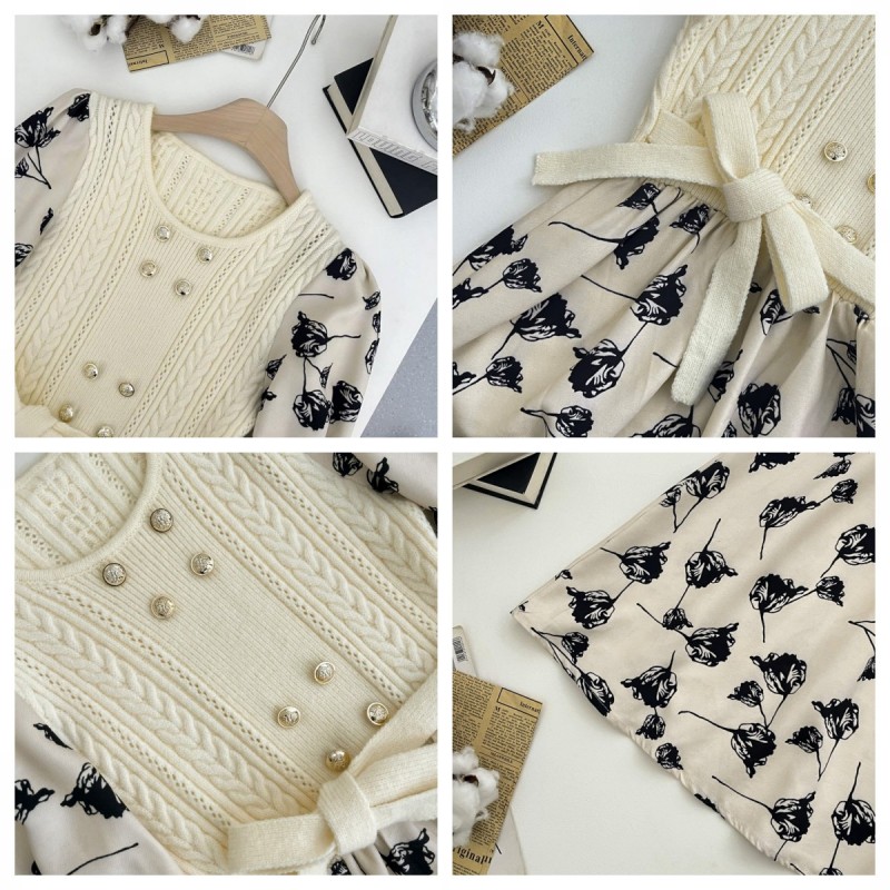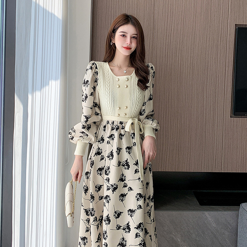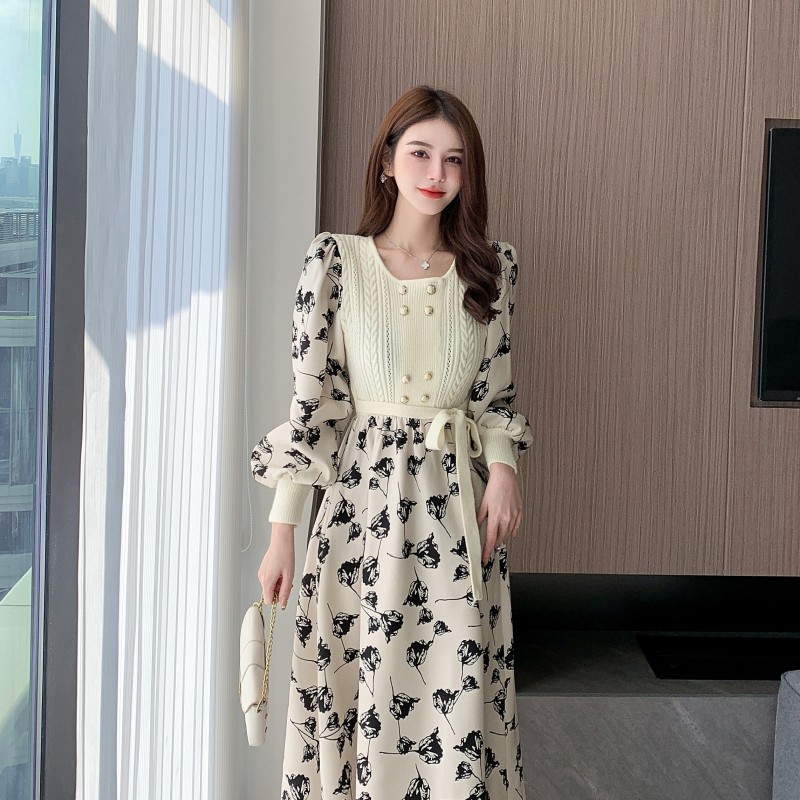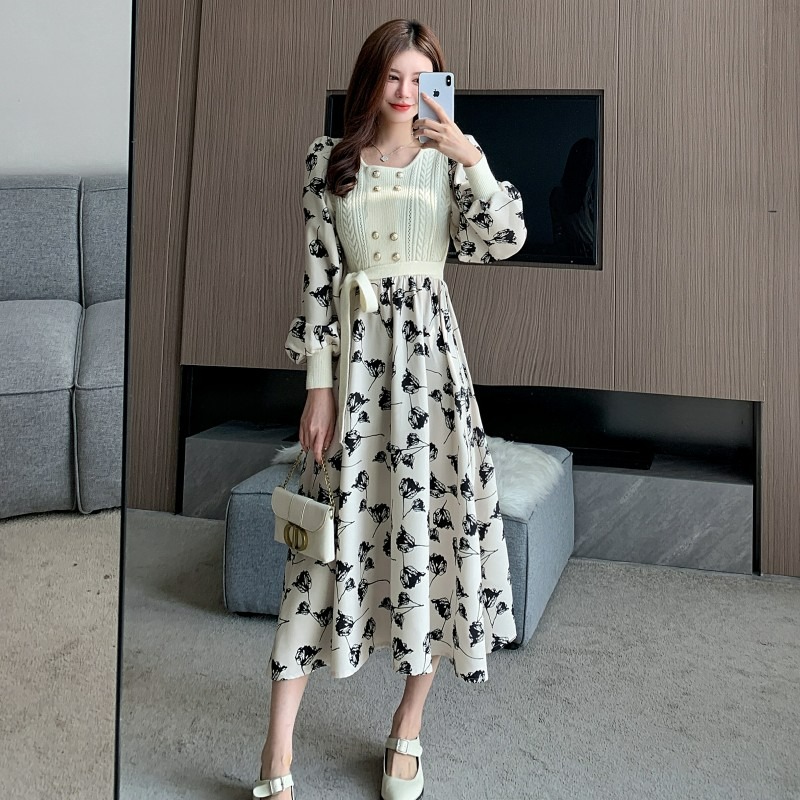 MY13732# 韩系圆领毛织连衣裙法式高级感灯笼袖腰带显瘦假两件打底裙女裝貨源服裝批發