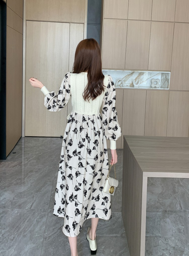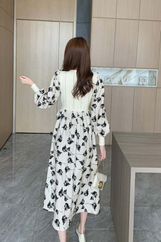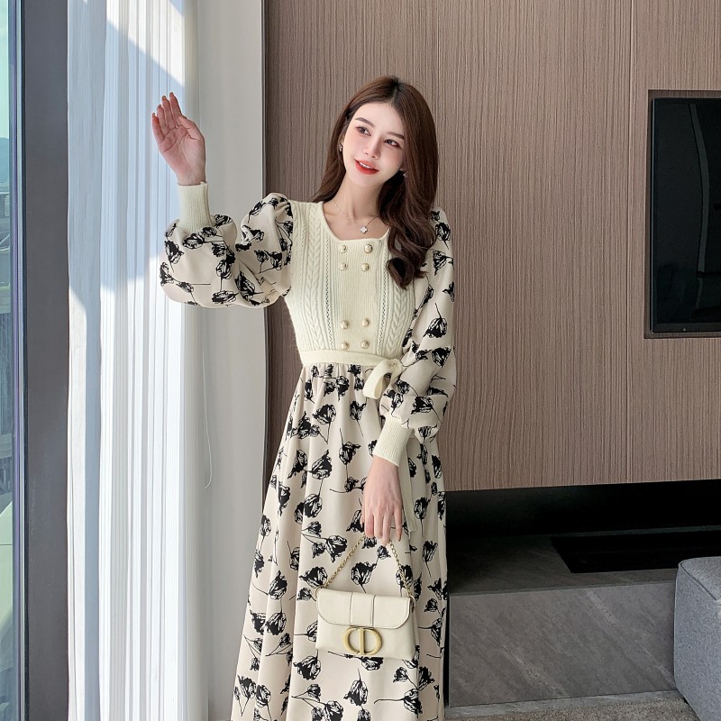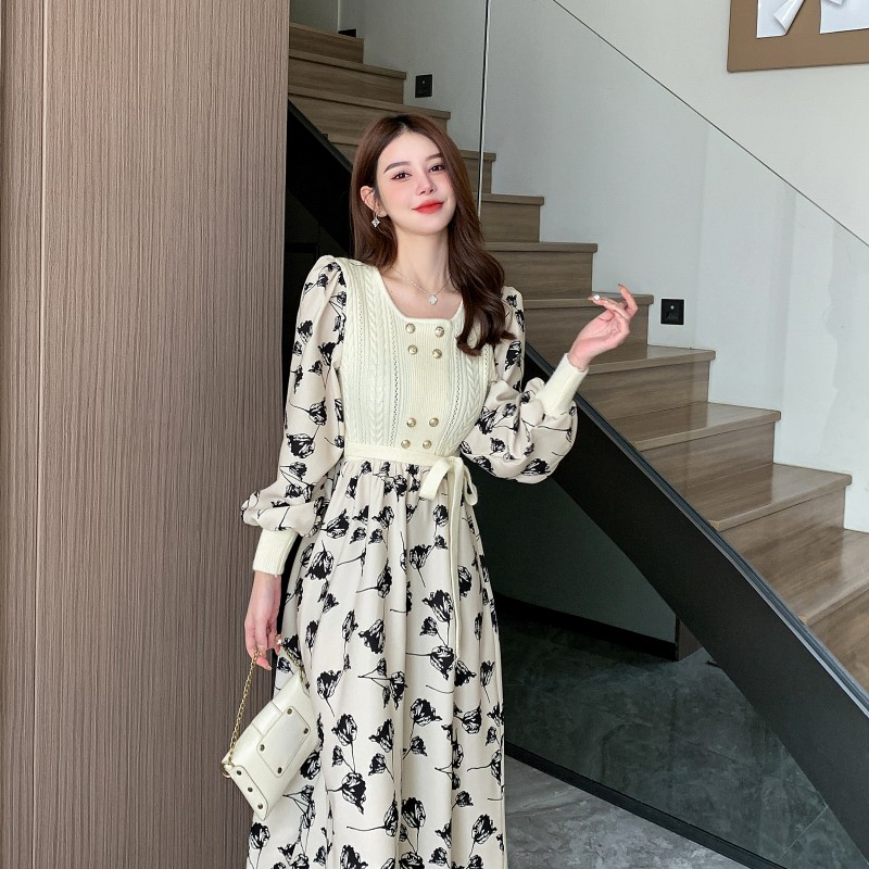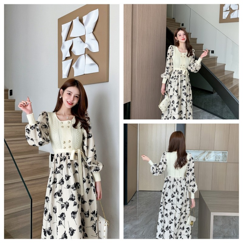 MY13732# 韩系圆领毛织连衣裙法式高级感灯笼袖腰带显瘦假两件打底裙女裝貨源服裝批發
