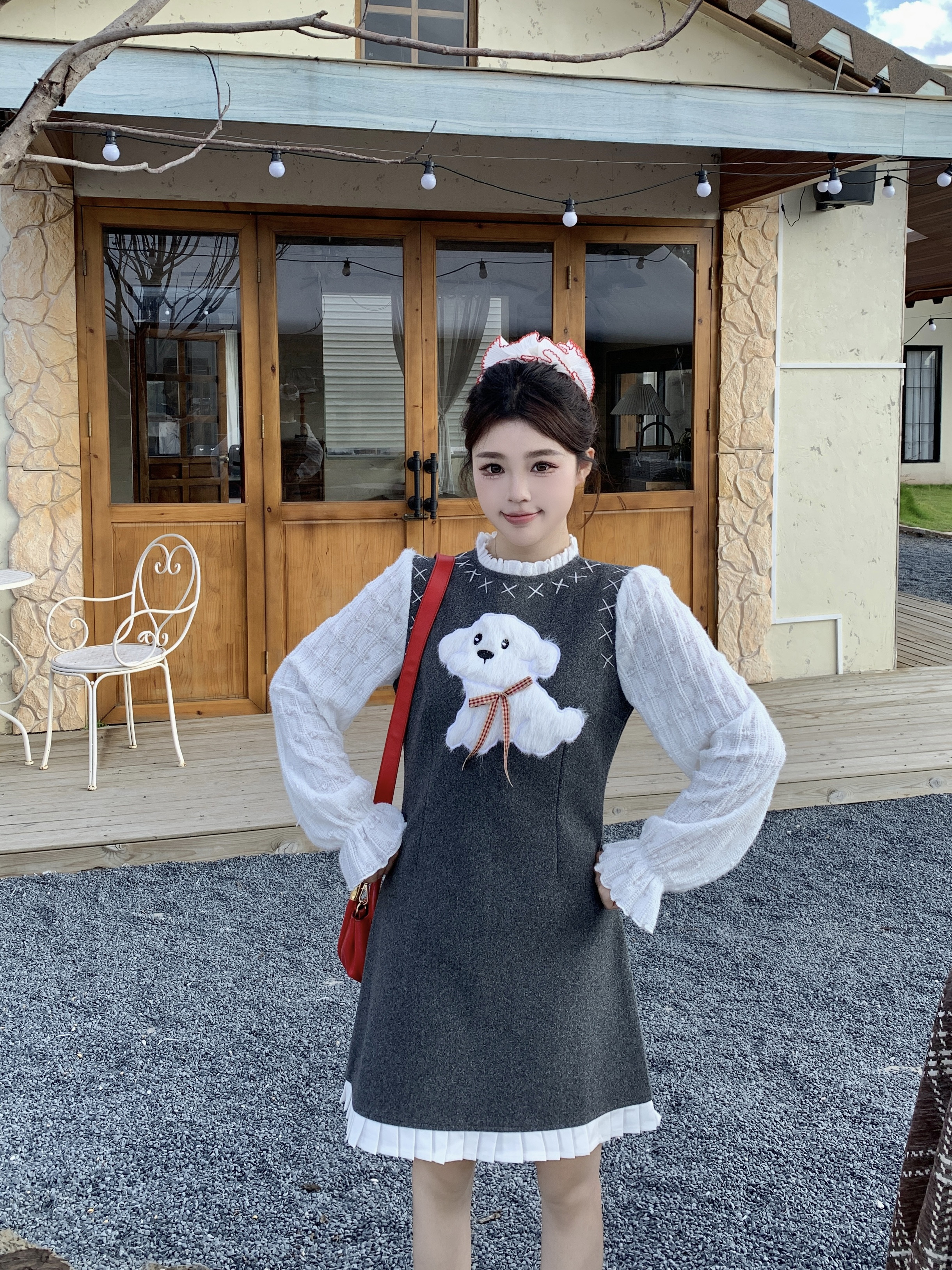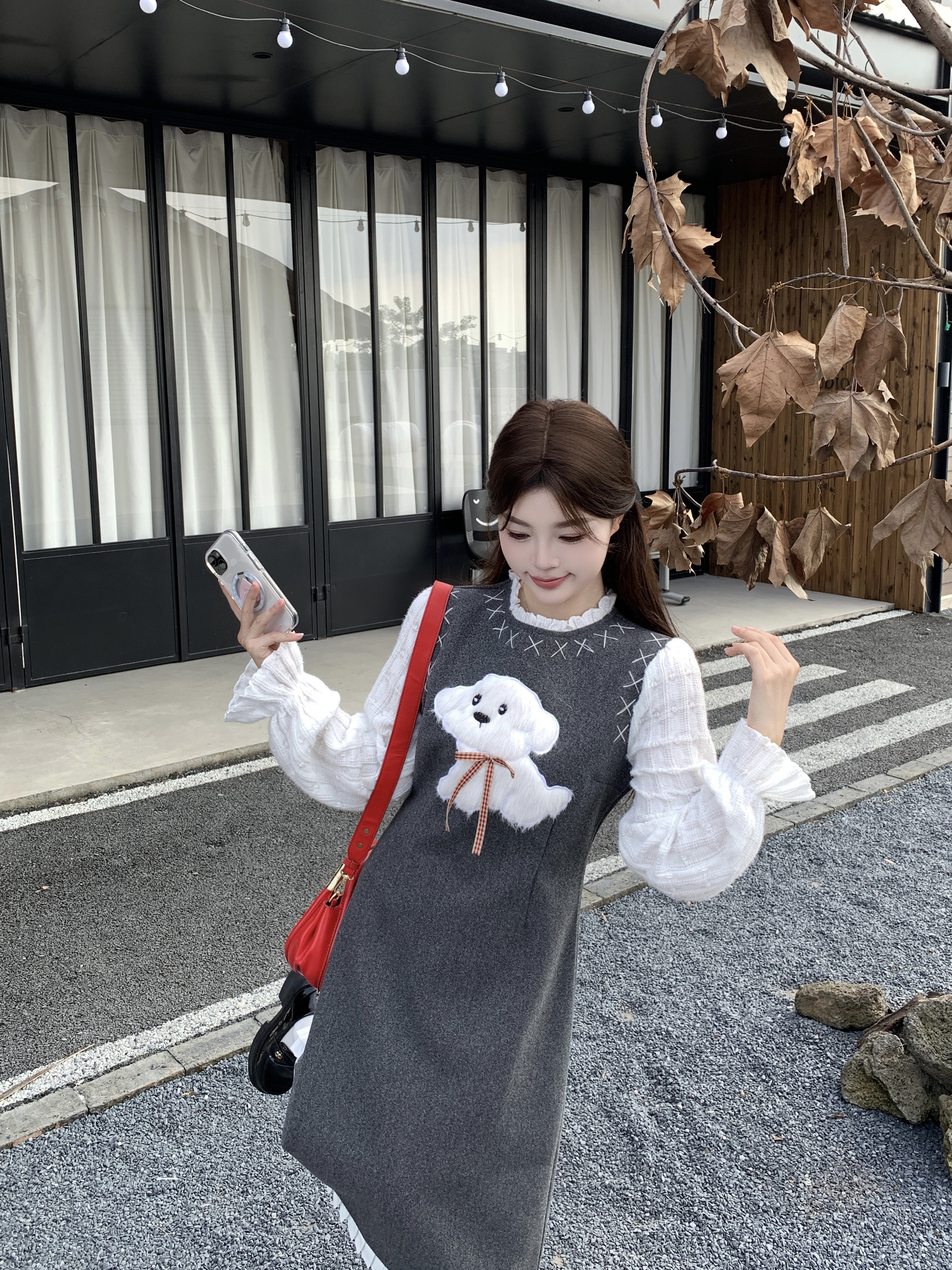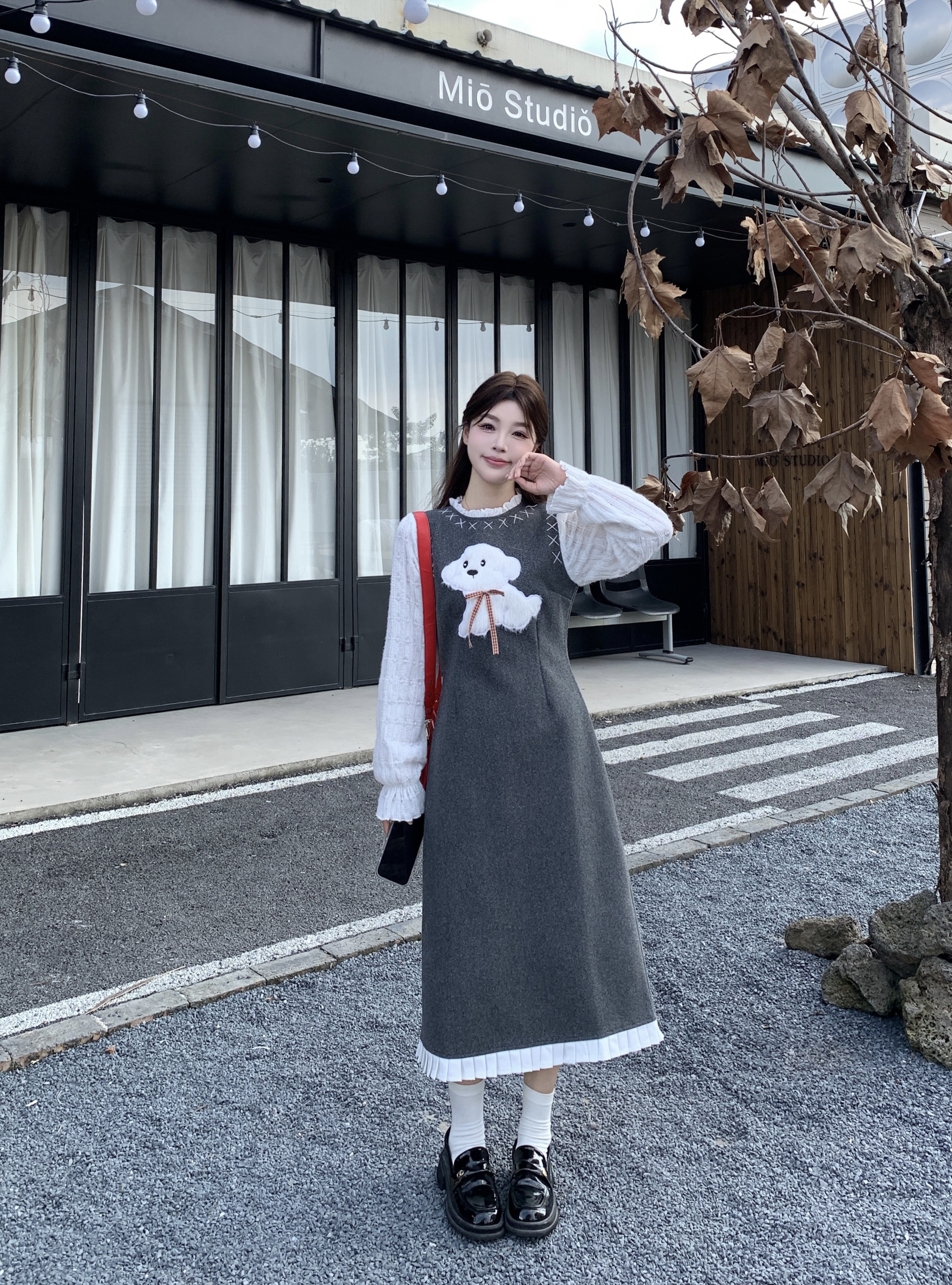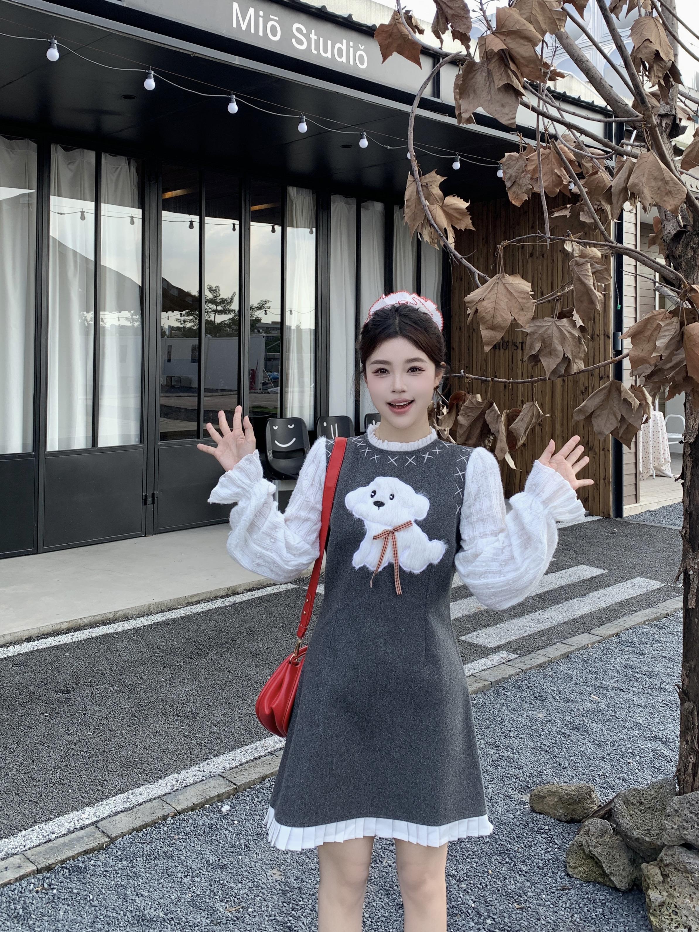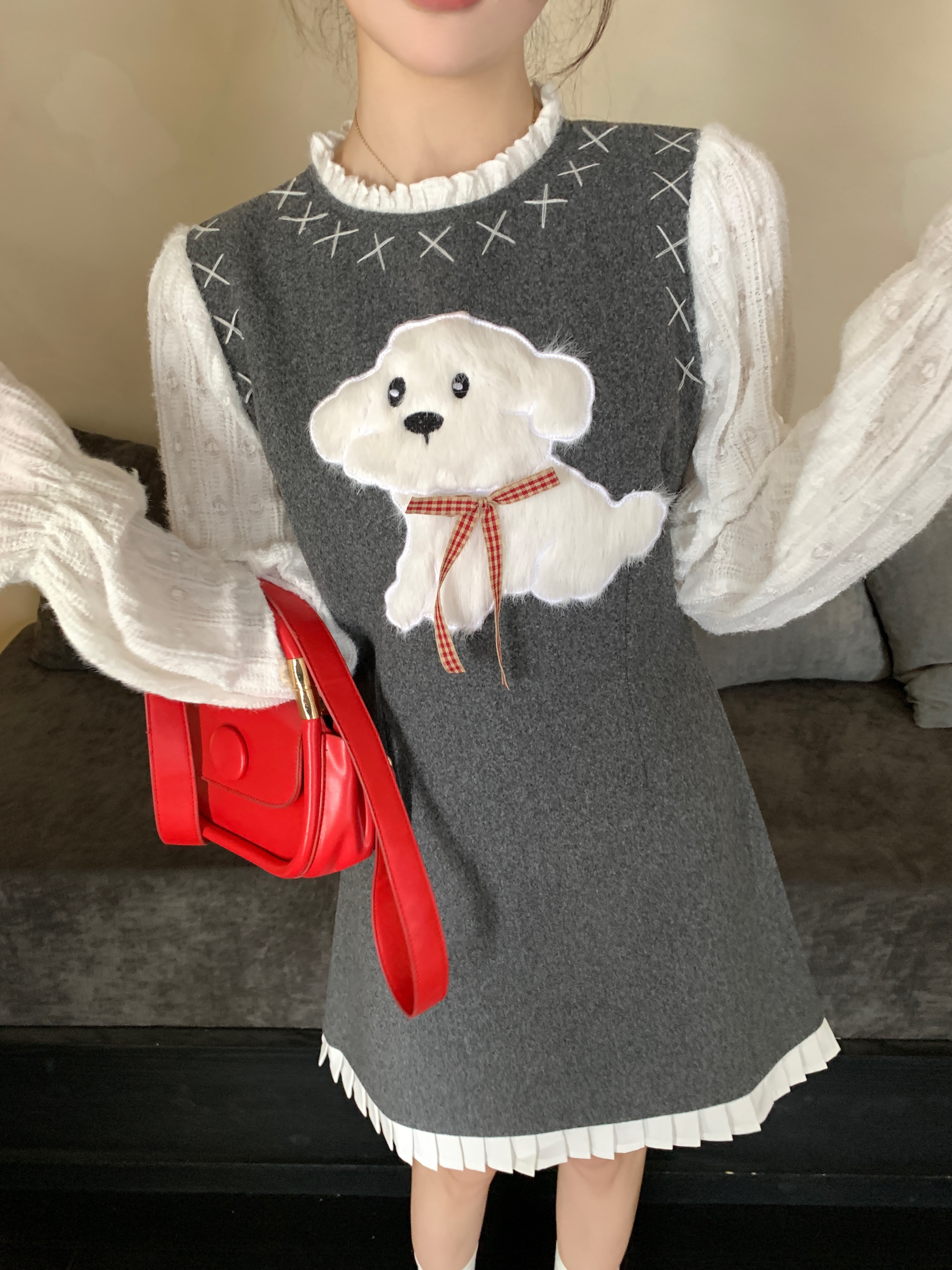 MY13737# 复古旋律大码女装微胖妹妹显瘦穿搭灰色小狗毛呢马甲假两件连衣裙女裝貨源服裝批發
