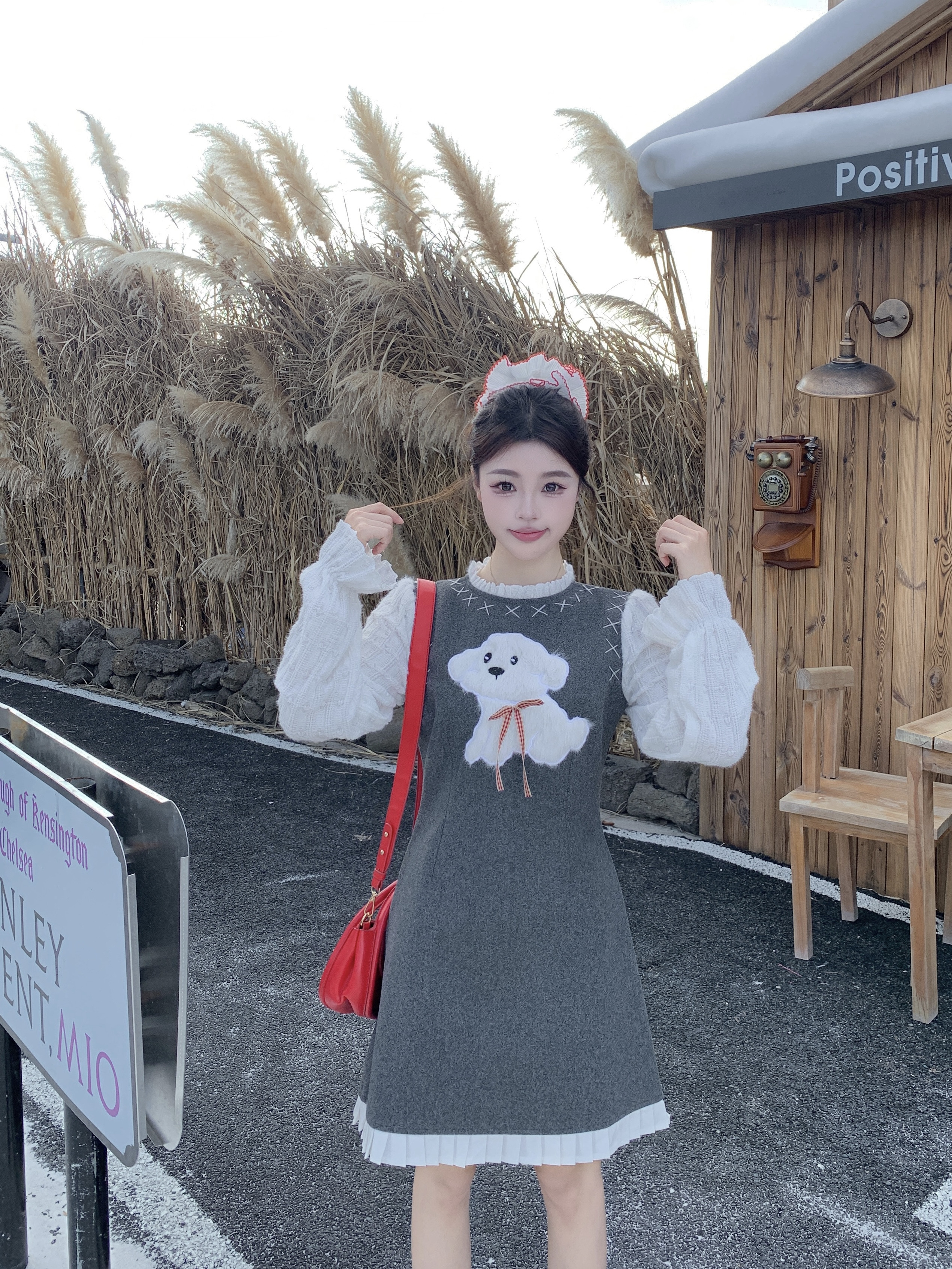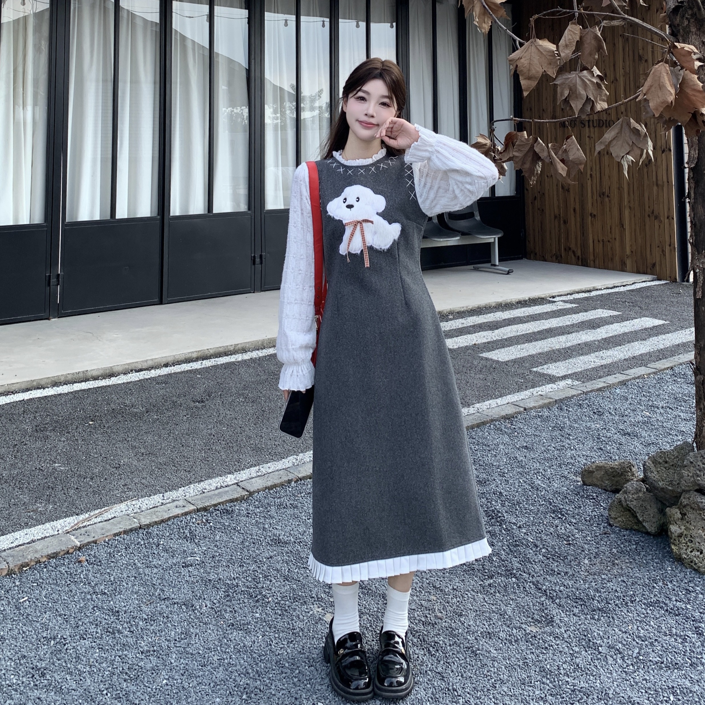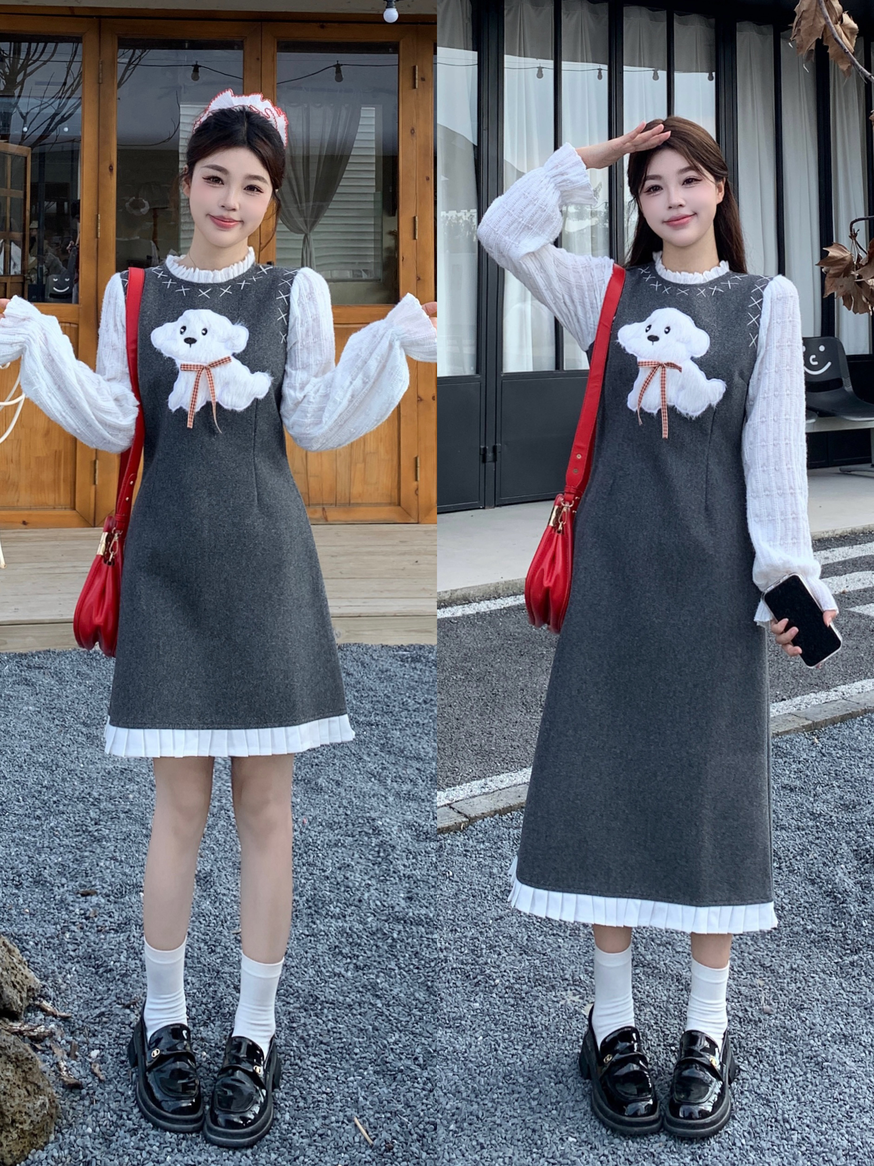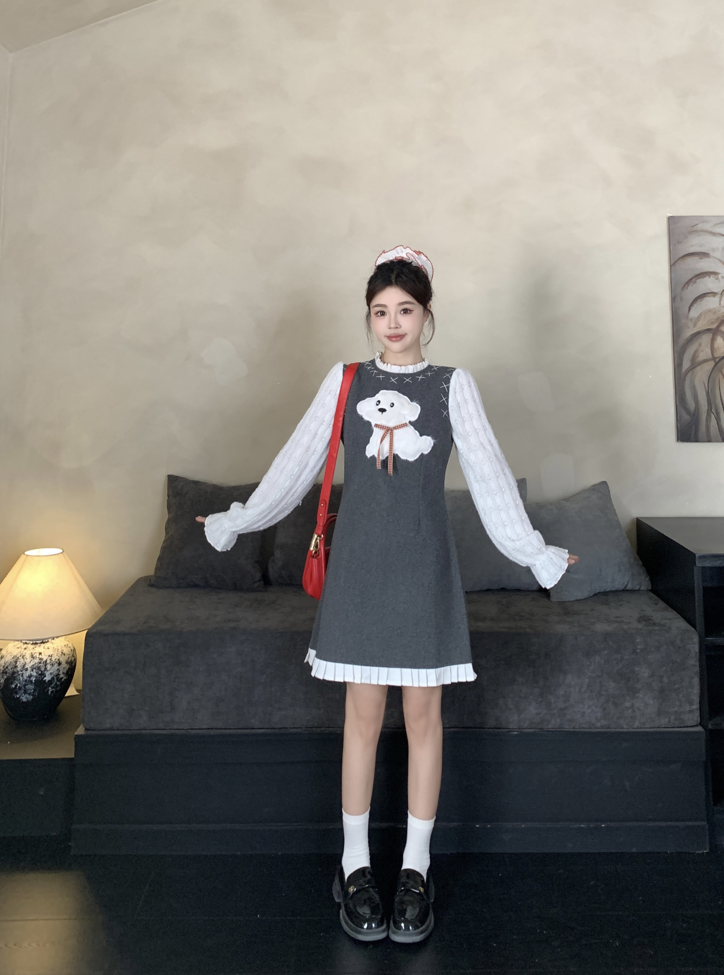 MY13737# 复古旋律大码女装微胖妹妹显瘦穿搭灰色小狗毛呢马甲假两件连衣裙女裝貨源服裝批發
