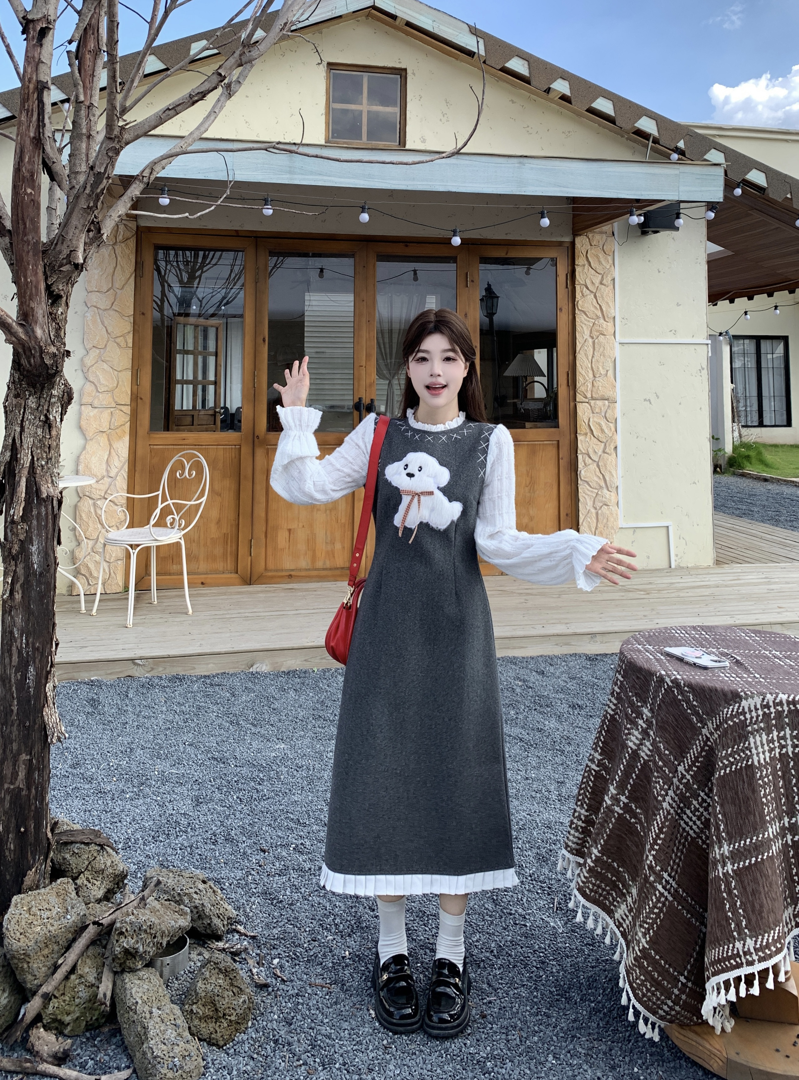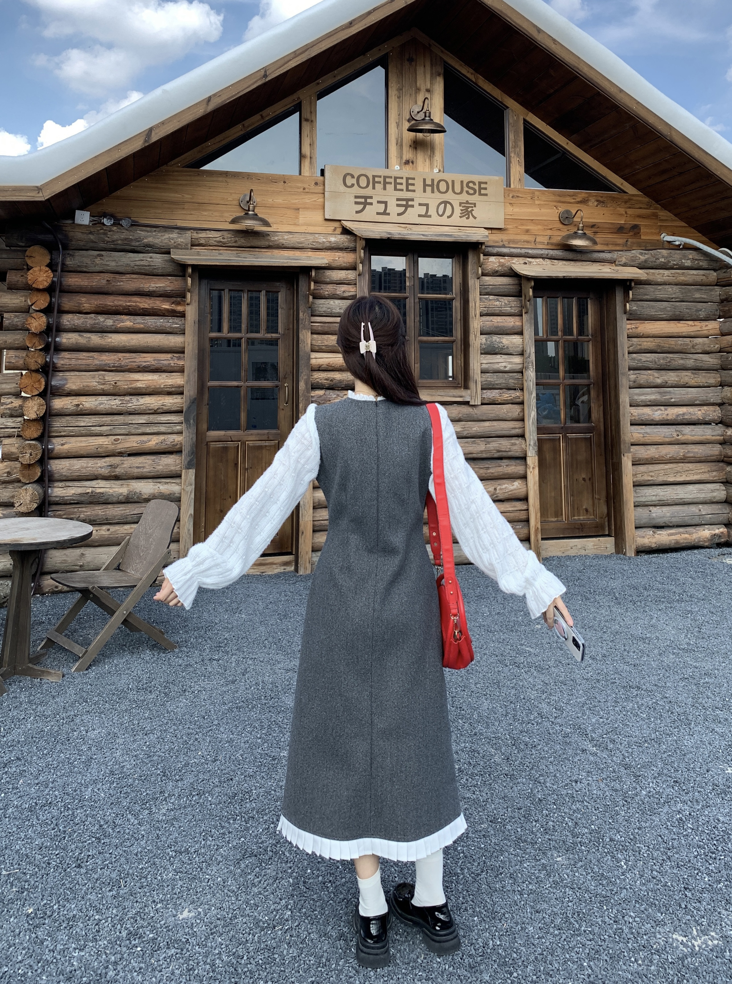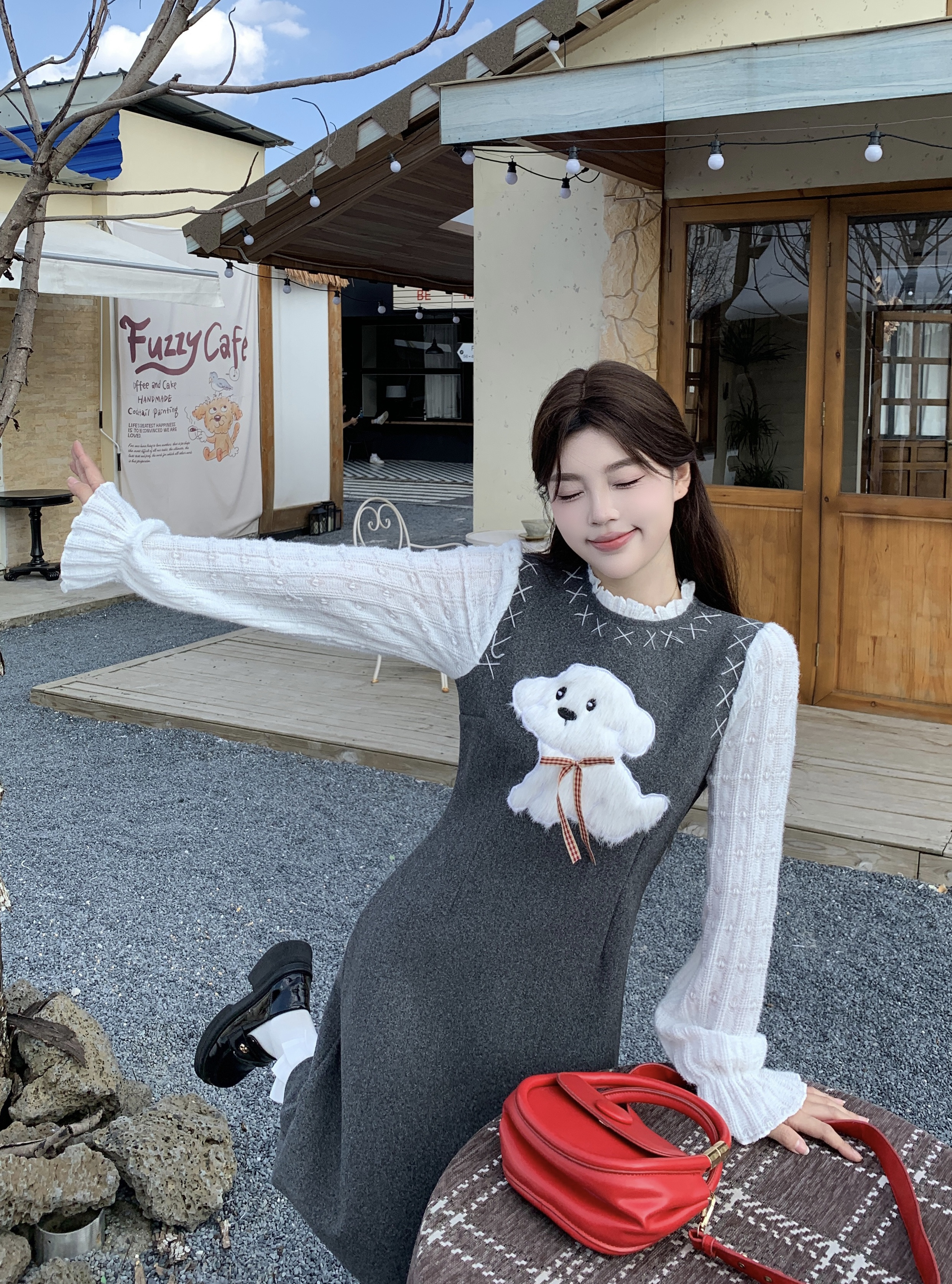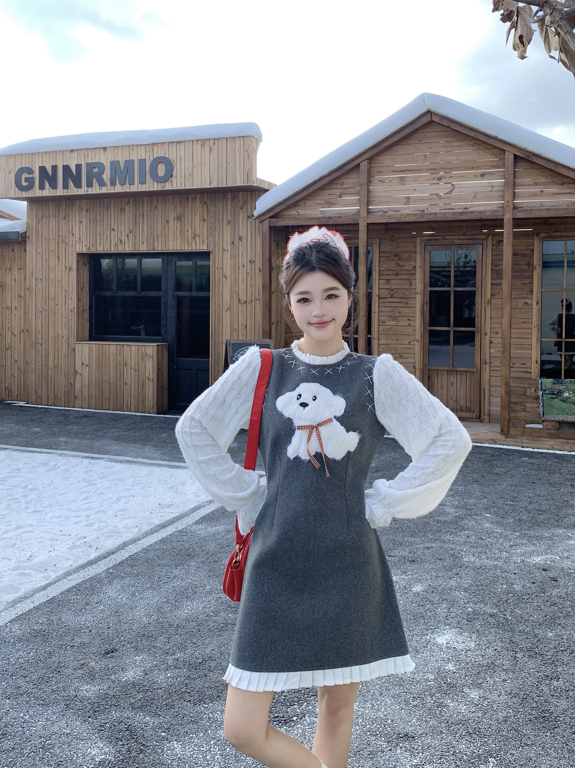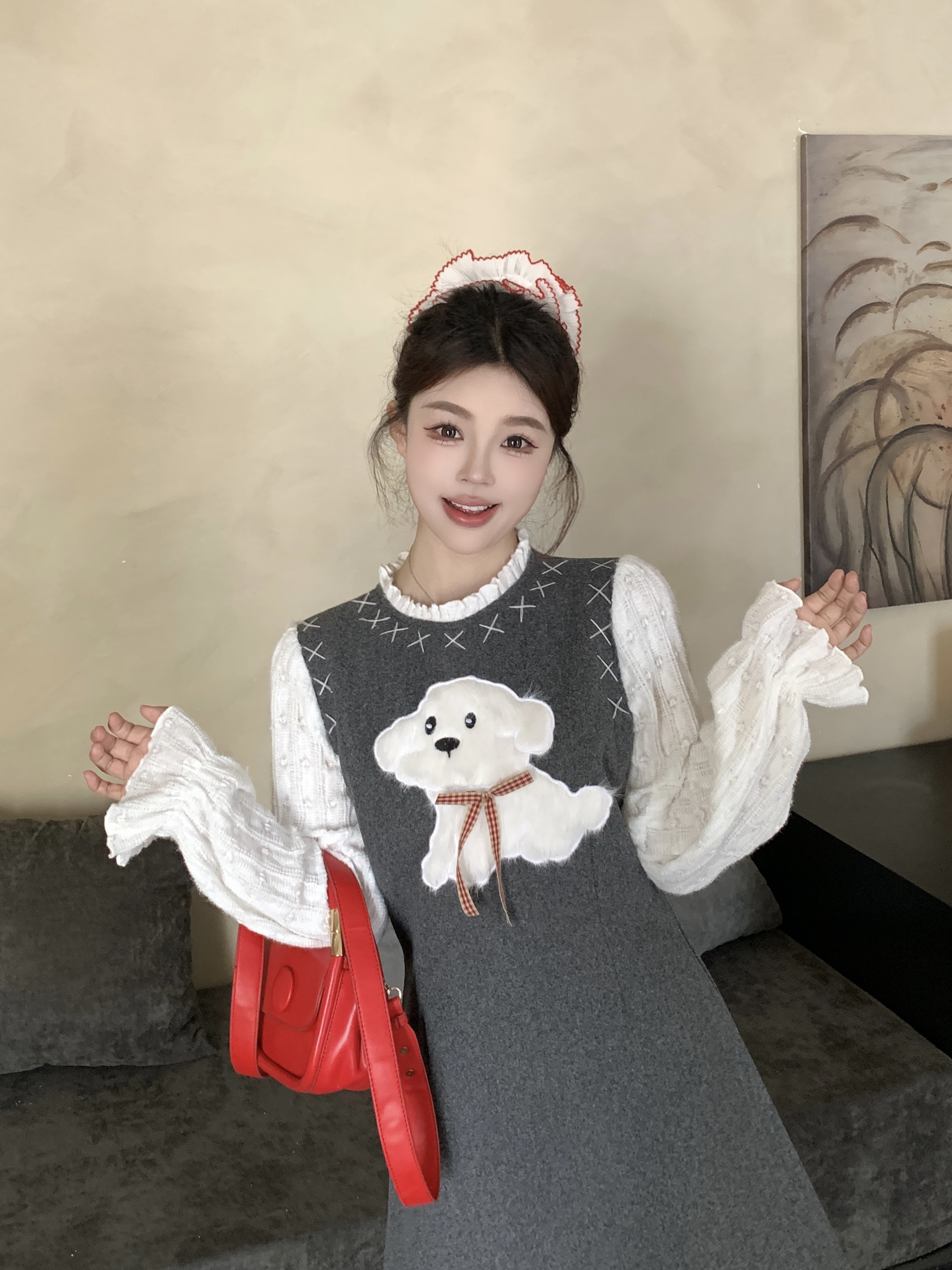 MY13737# 复古旋律大码女装微胖妹妹显瘦穿搭灰色小狗毛呢马甲假两件连衣裙女裝貨源服裝批發