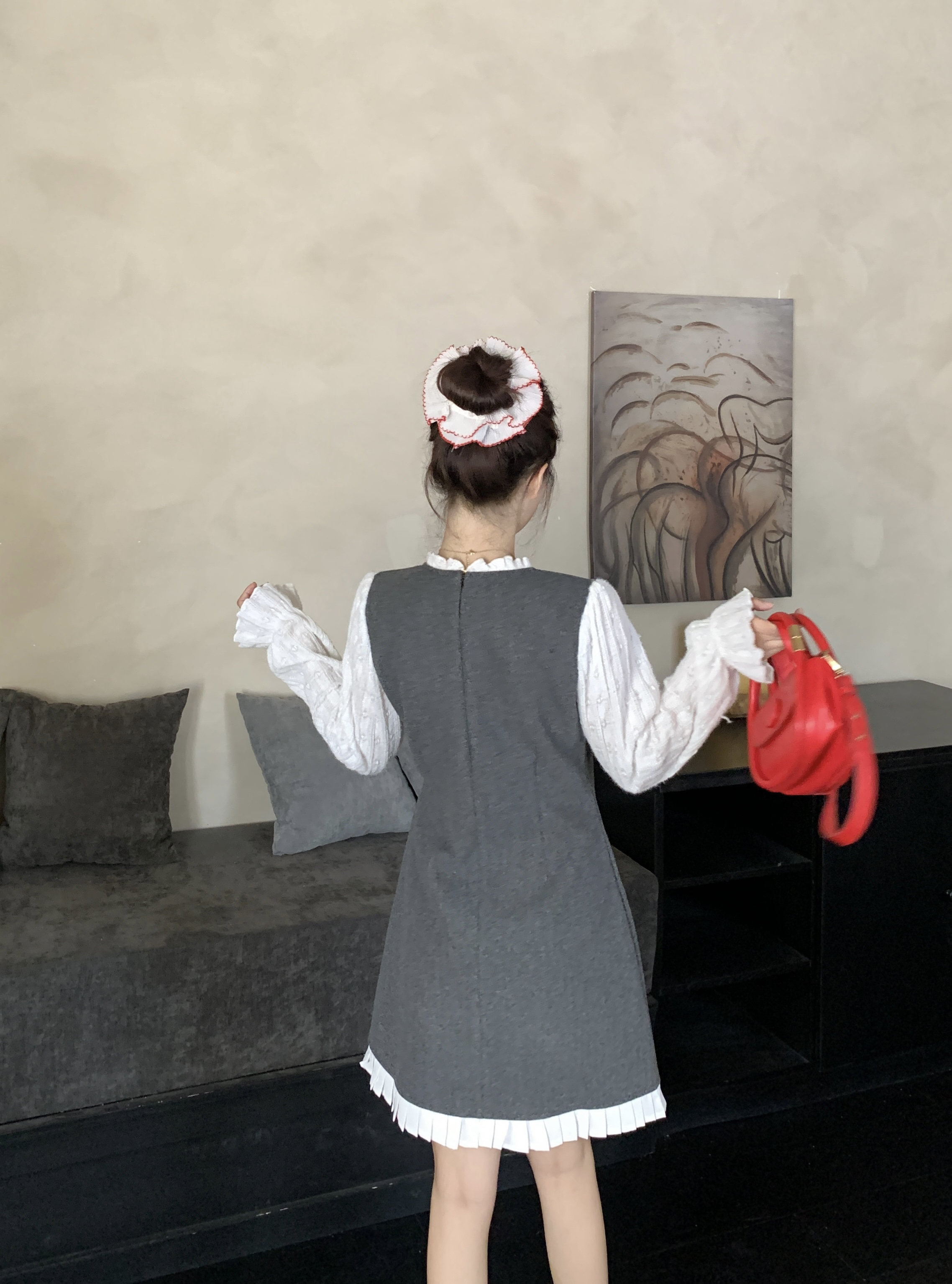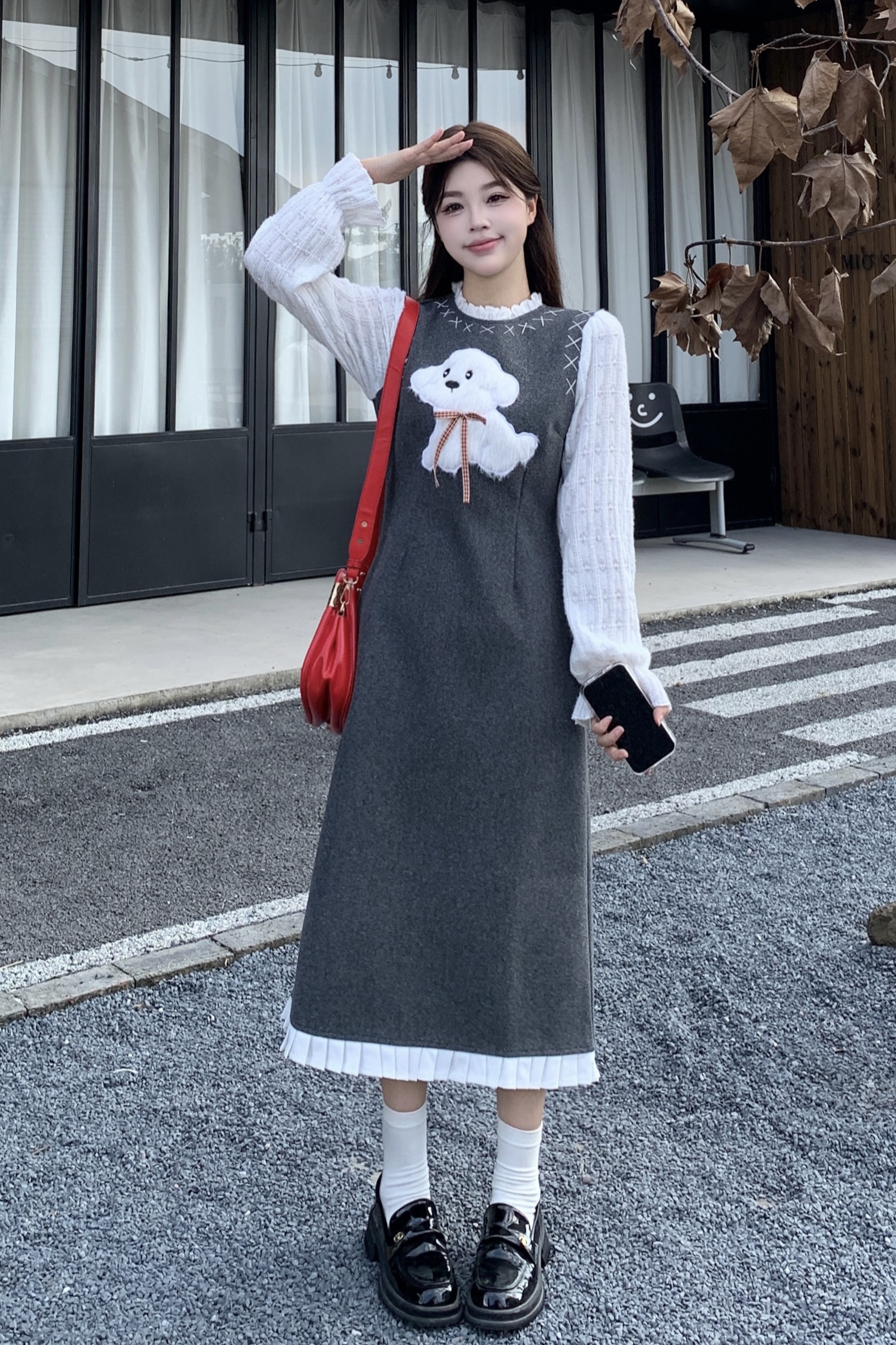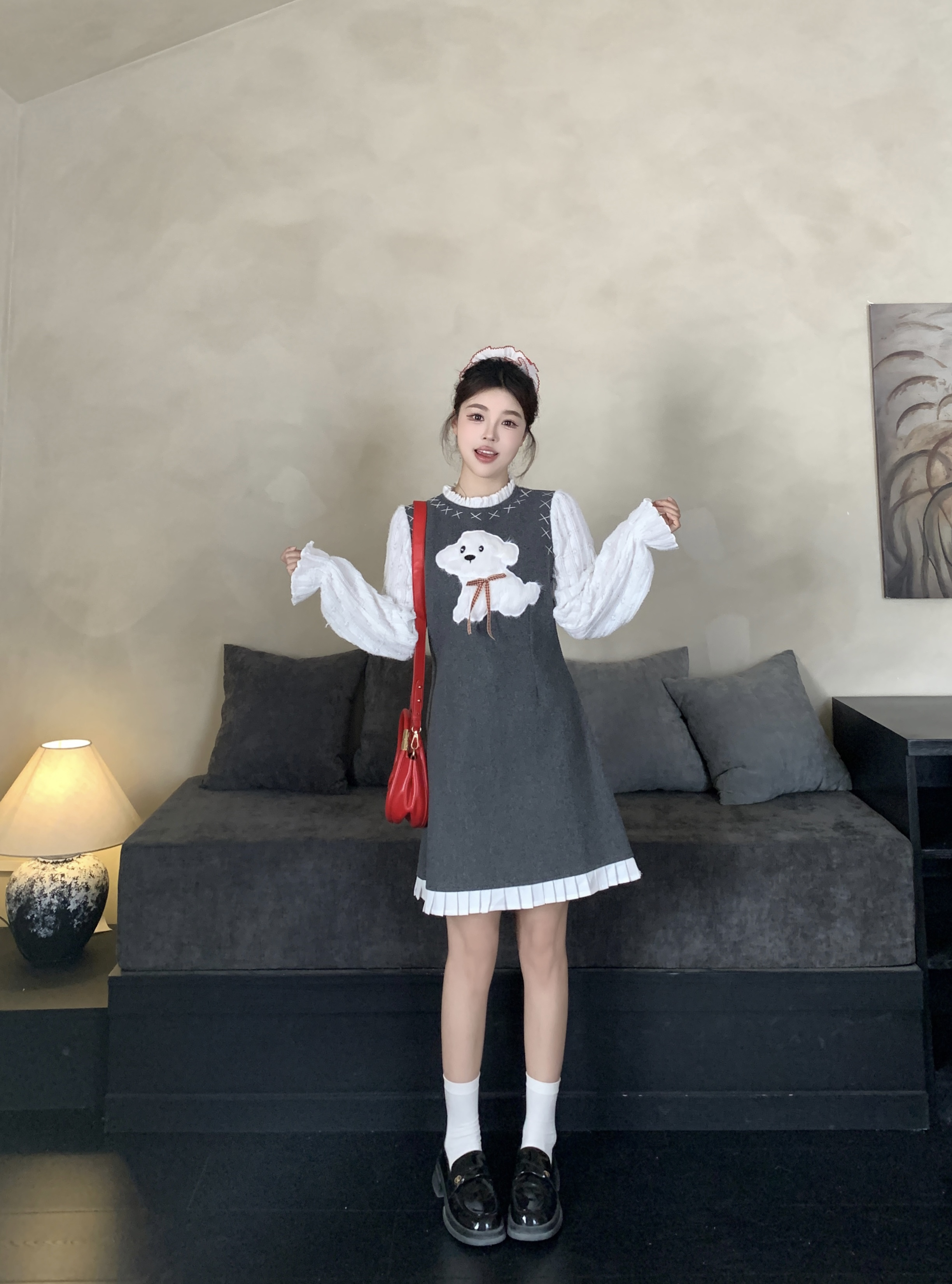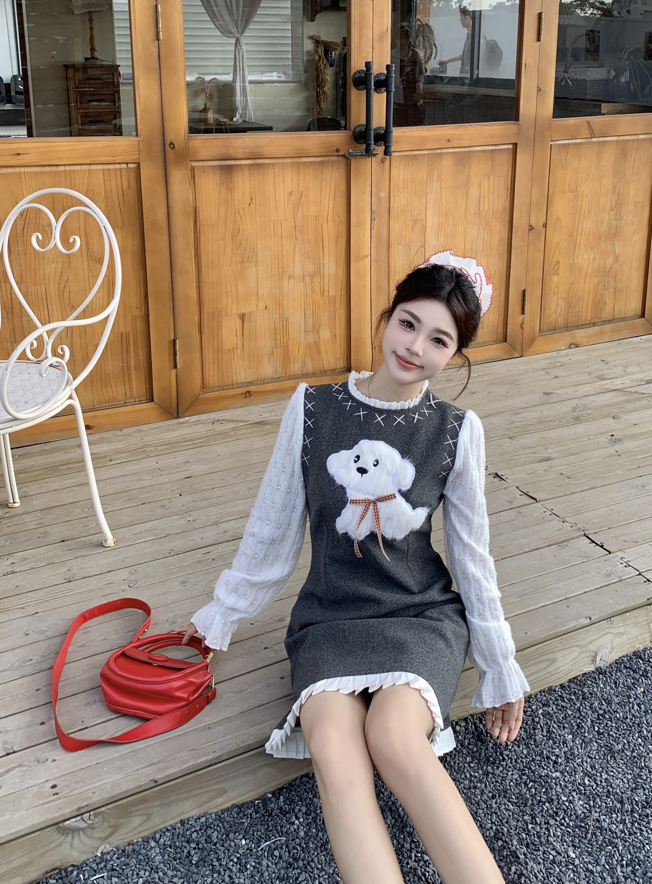 MY13737# 复古旋律大码女装微胖妹妹显瘦穿搭灰色小狗毛呢马甲假两件连衣裙女裝貨源服裝批發