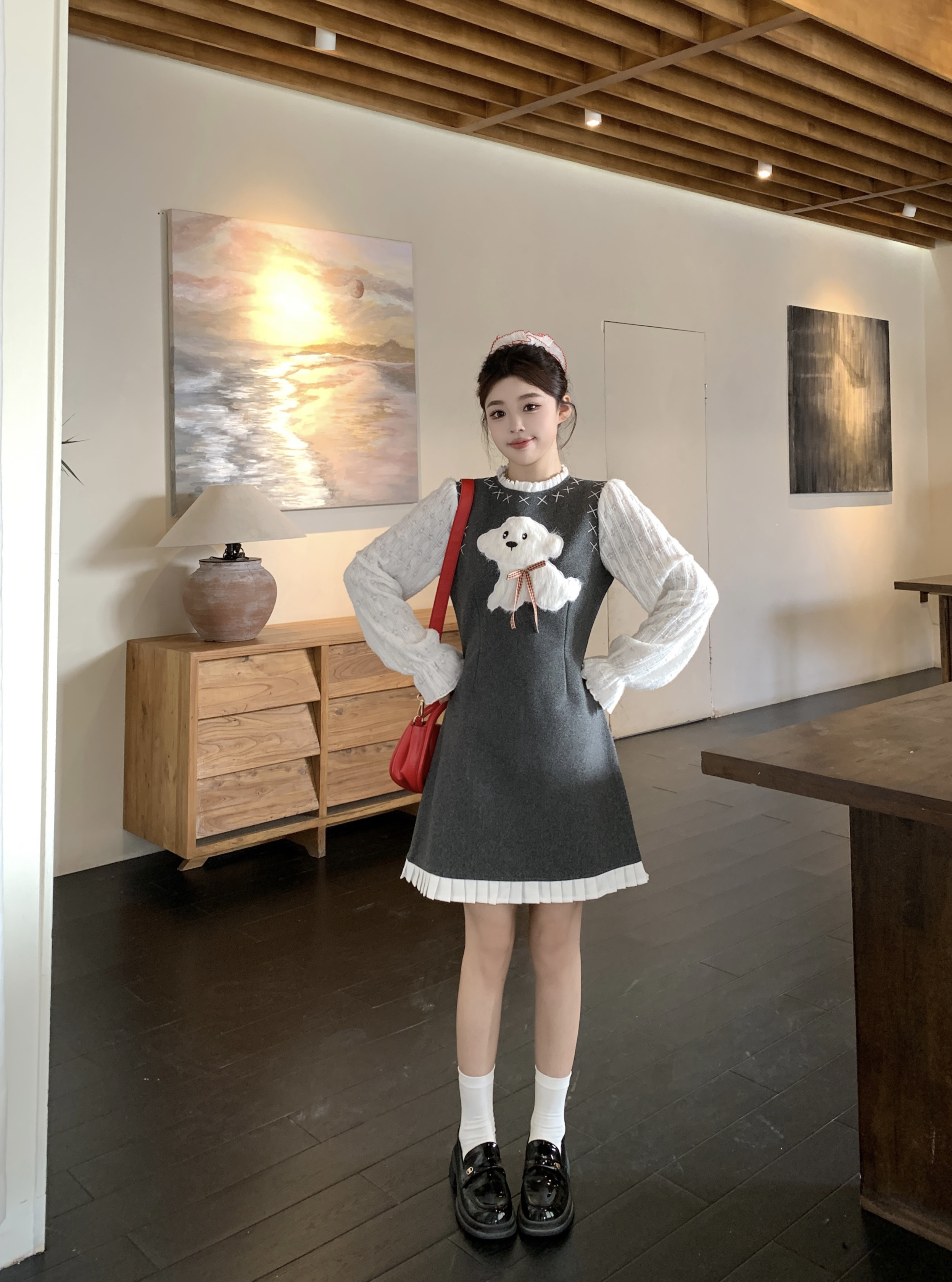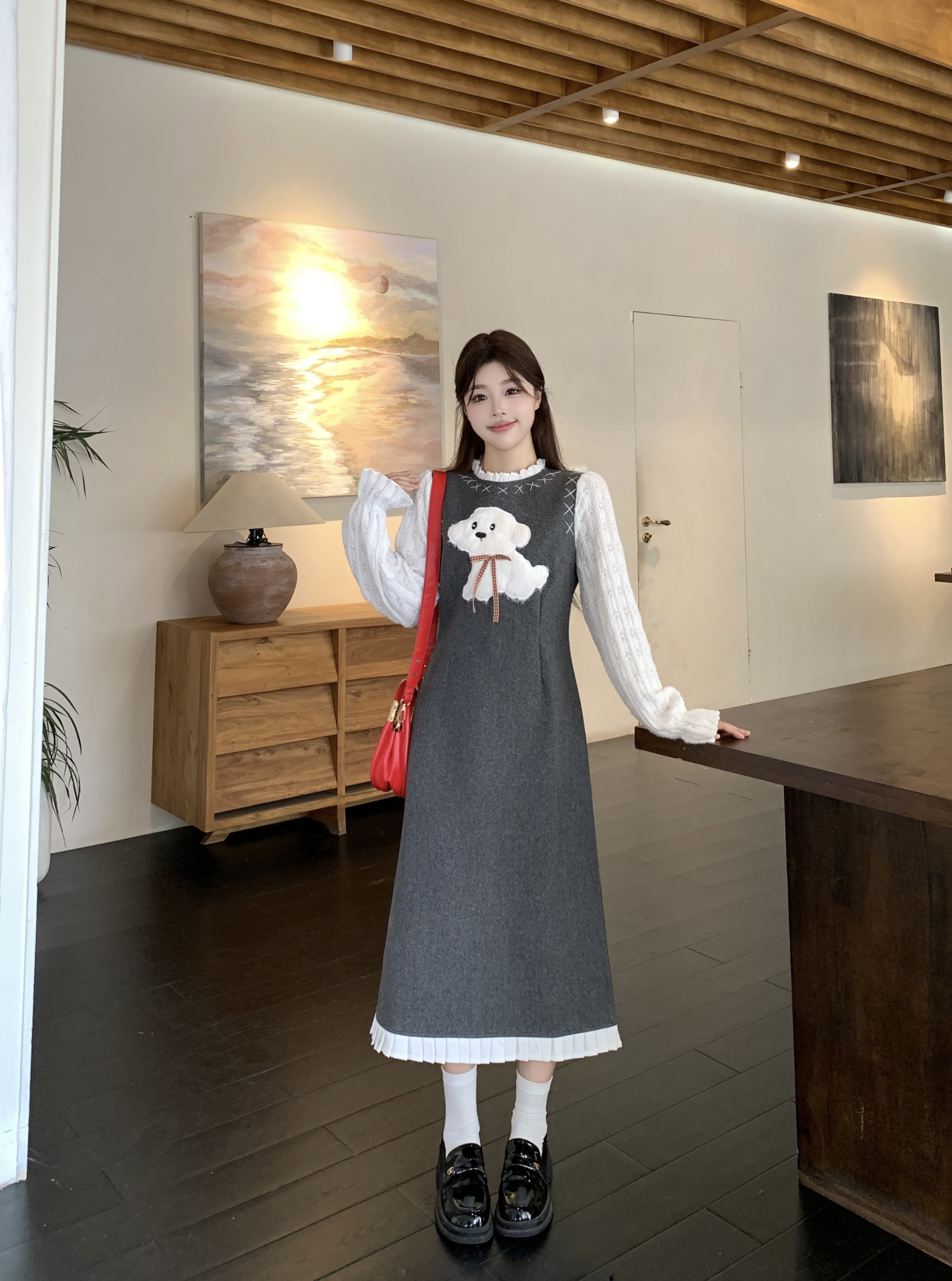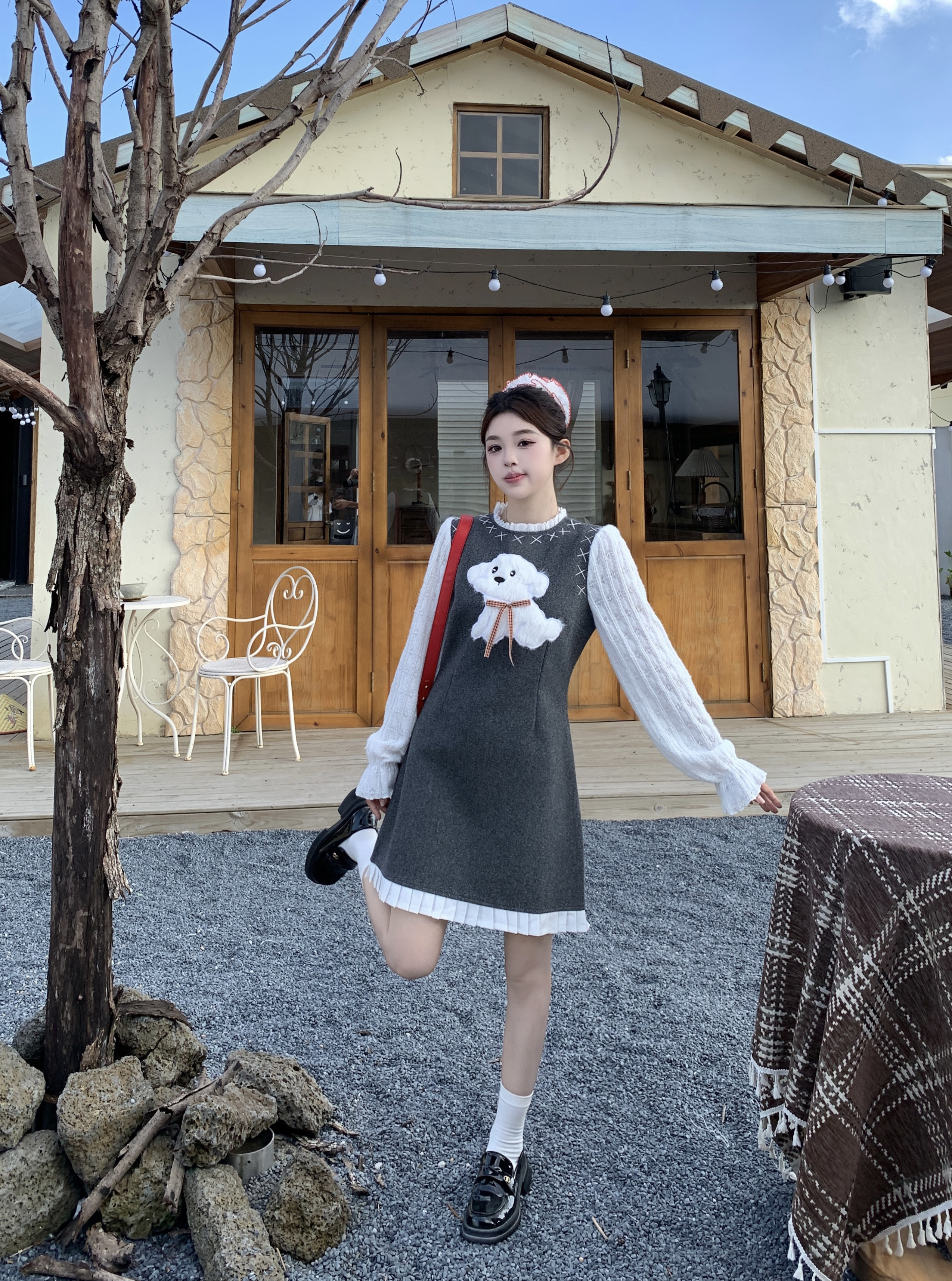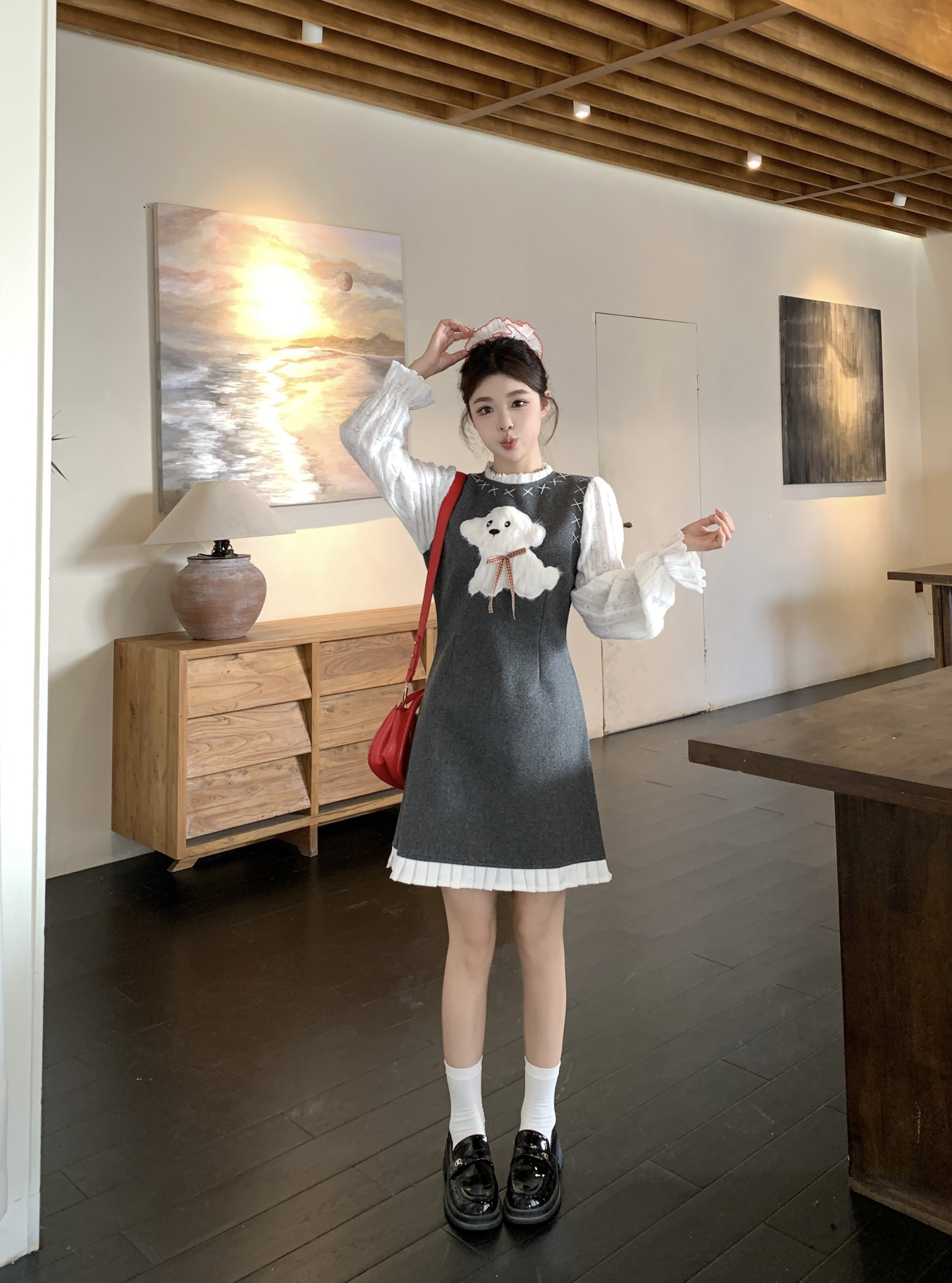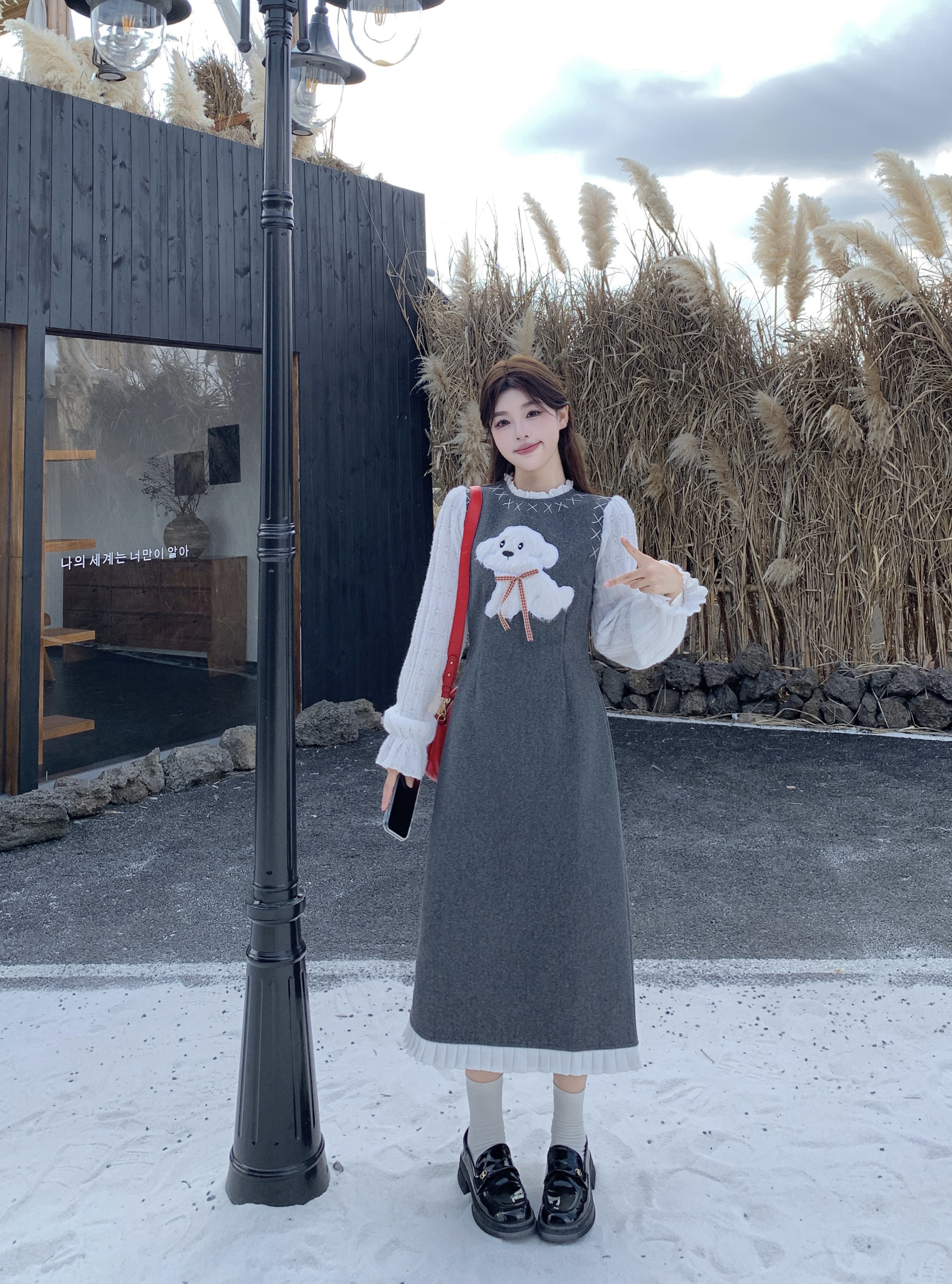 MY13737# 复古旋律大码女装微胖妹妹显瘦穿搭灰色小狗毛呢马甲假两件连衣裙女裝貨源服裝批發