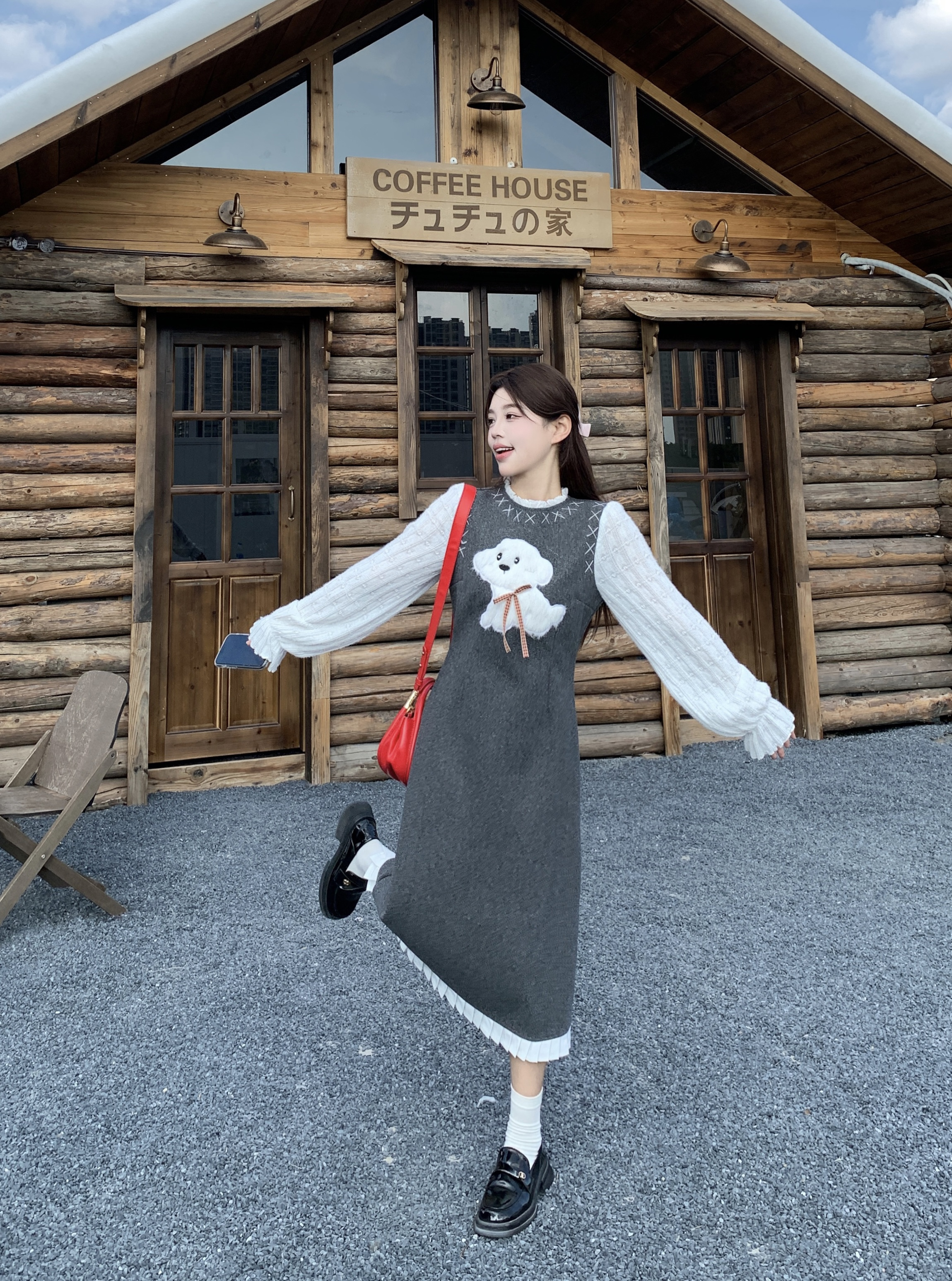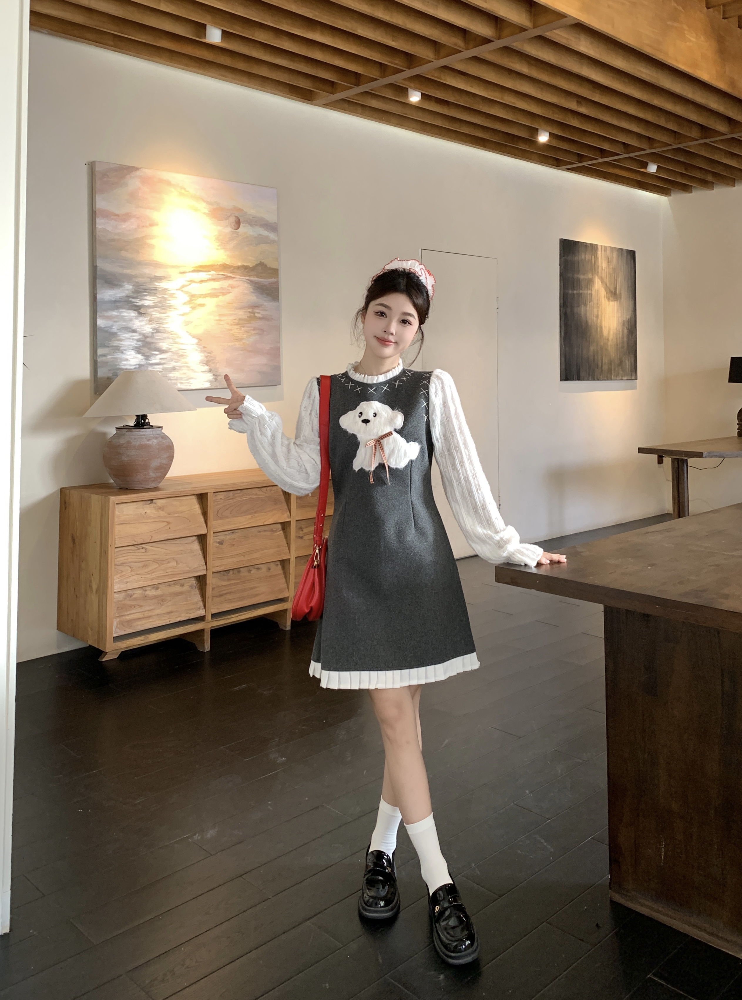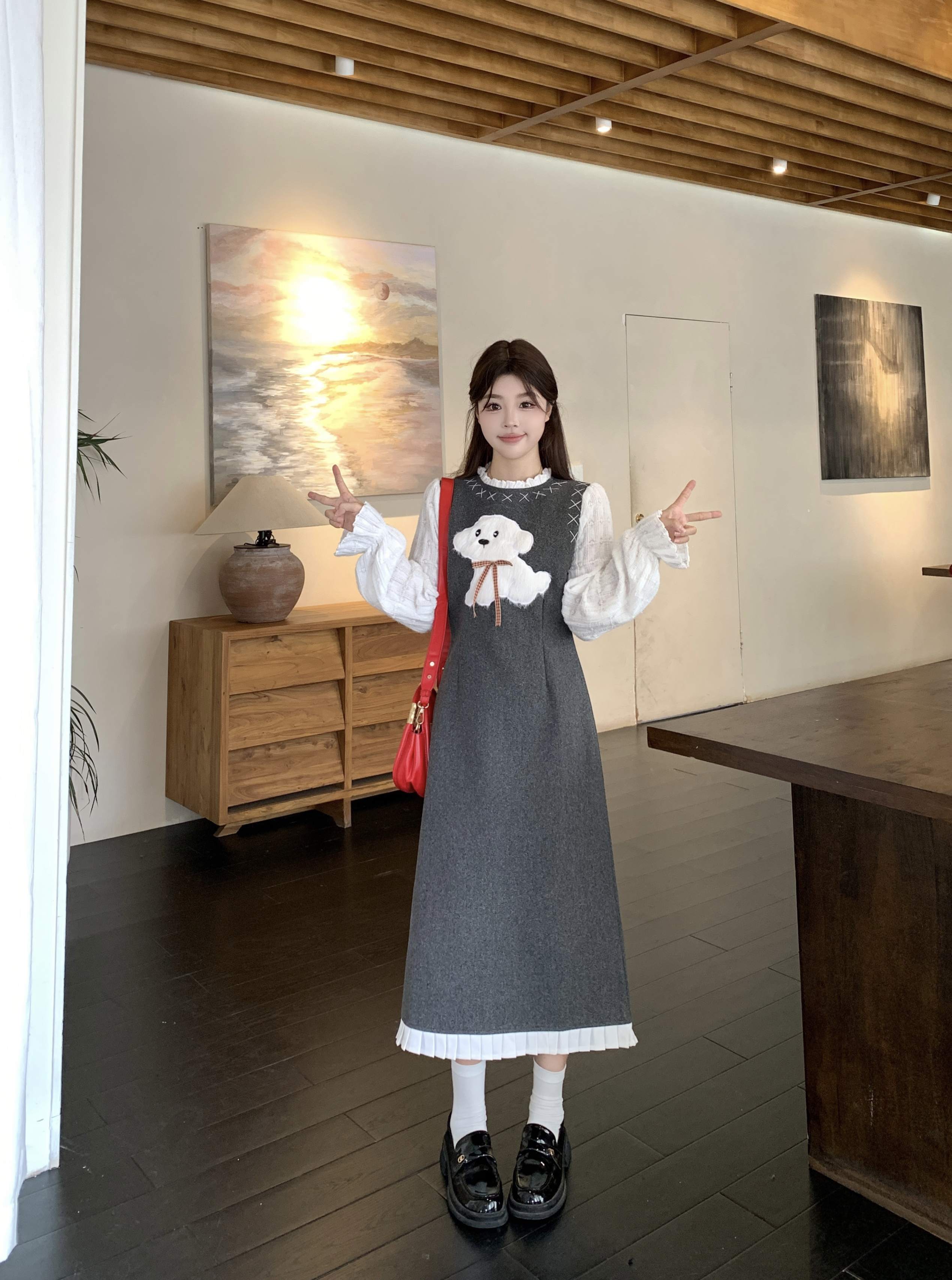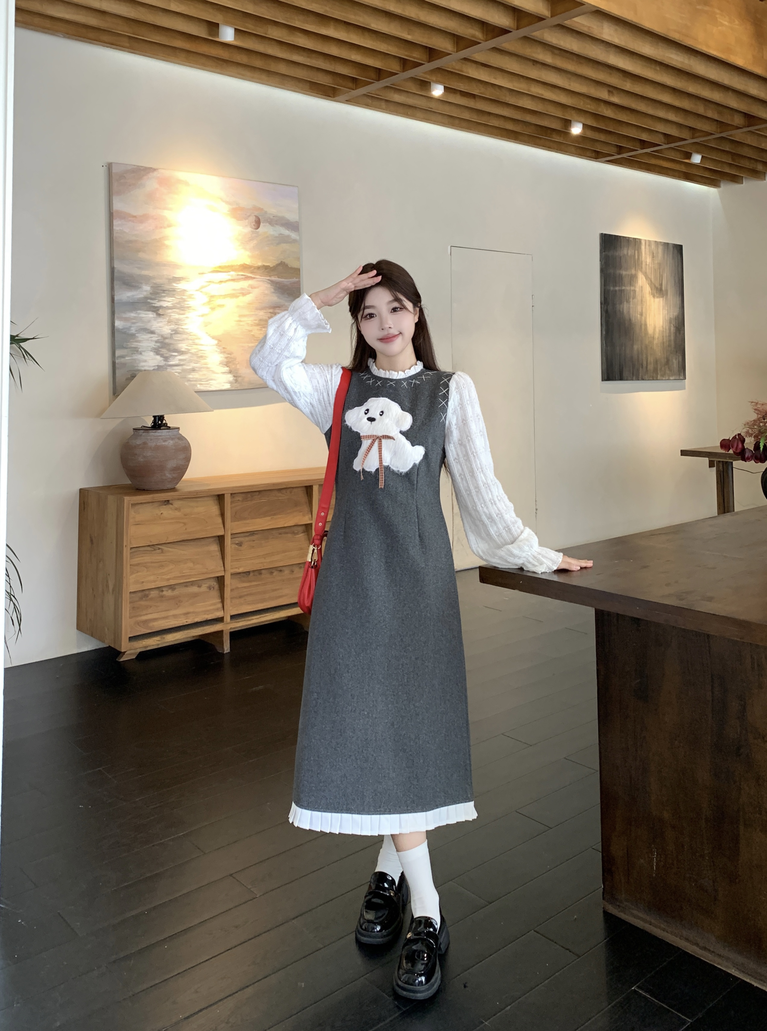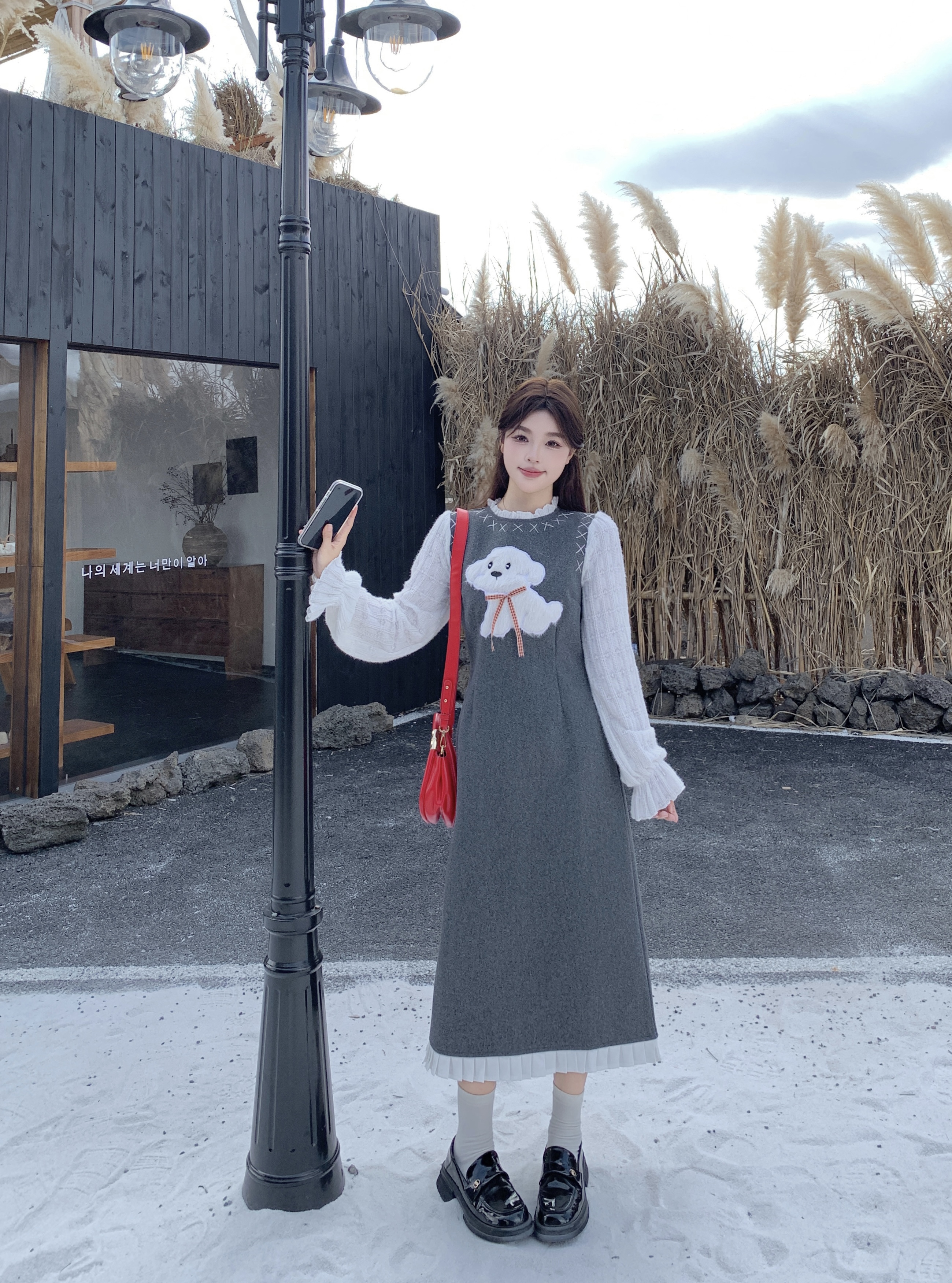 MY13737# 复古旋律大码女装微胖妹妹显瘦穿搭灰色小狗毛呢马甲假两件连衣裙女裝貨源服裝批發
