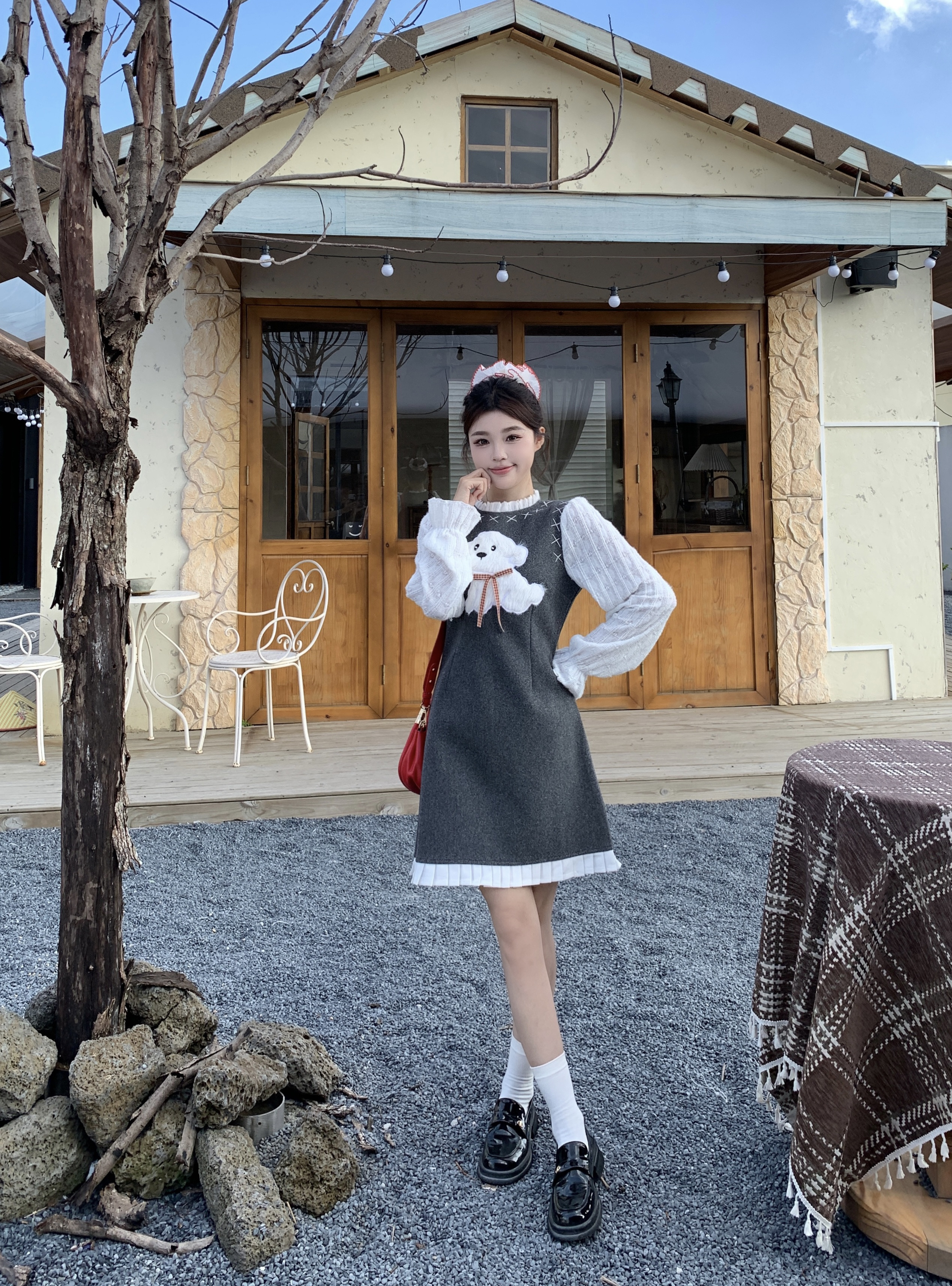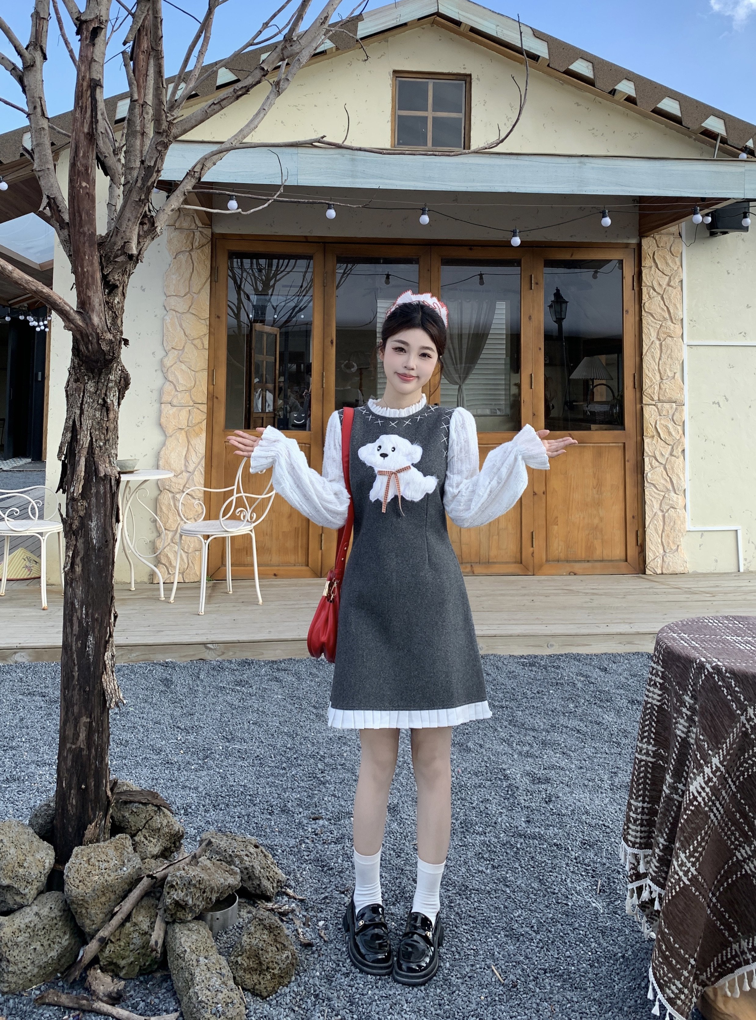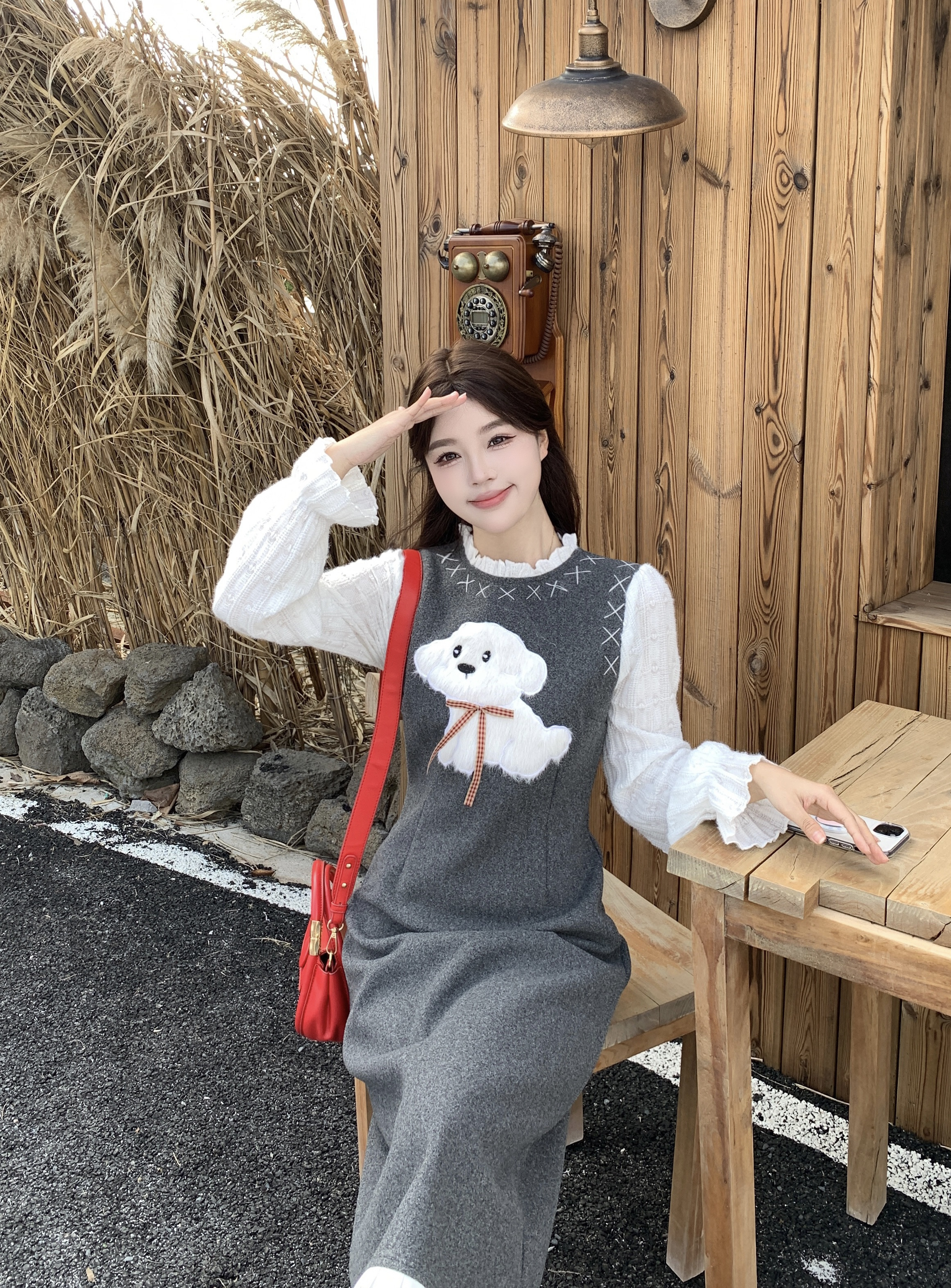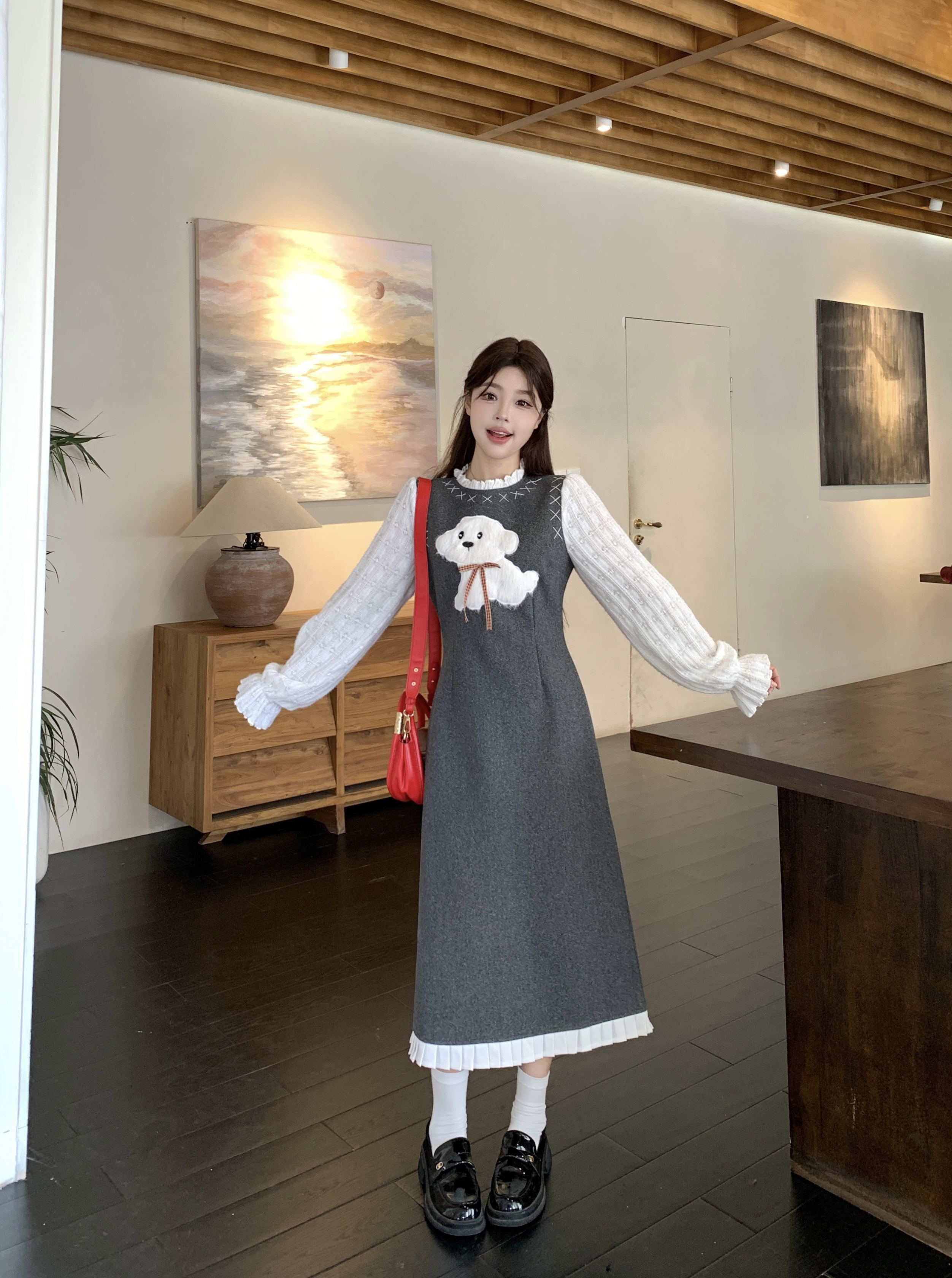 MY13737# 复古旋律大码女装微胖妹妹显瘦穿搭灰色小狗毛呢马甲假两件连衣裙女裝貨源服裝批發