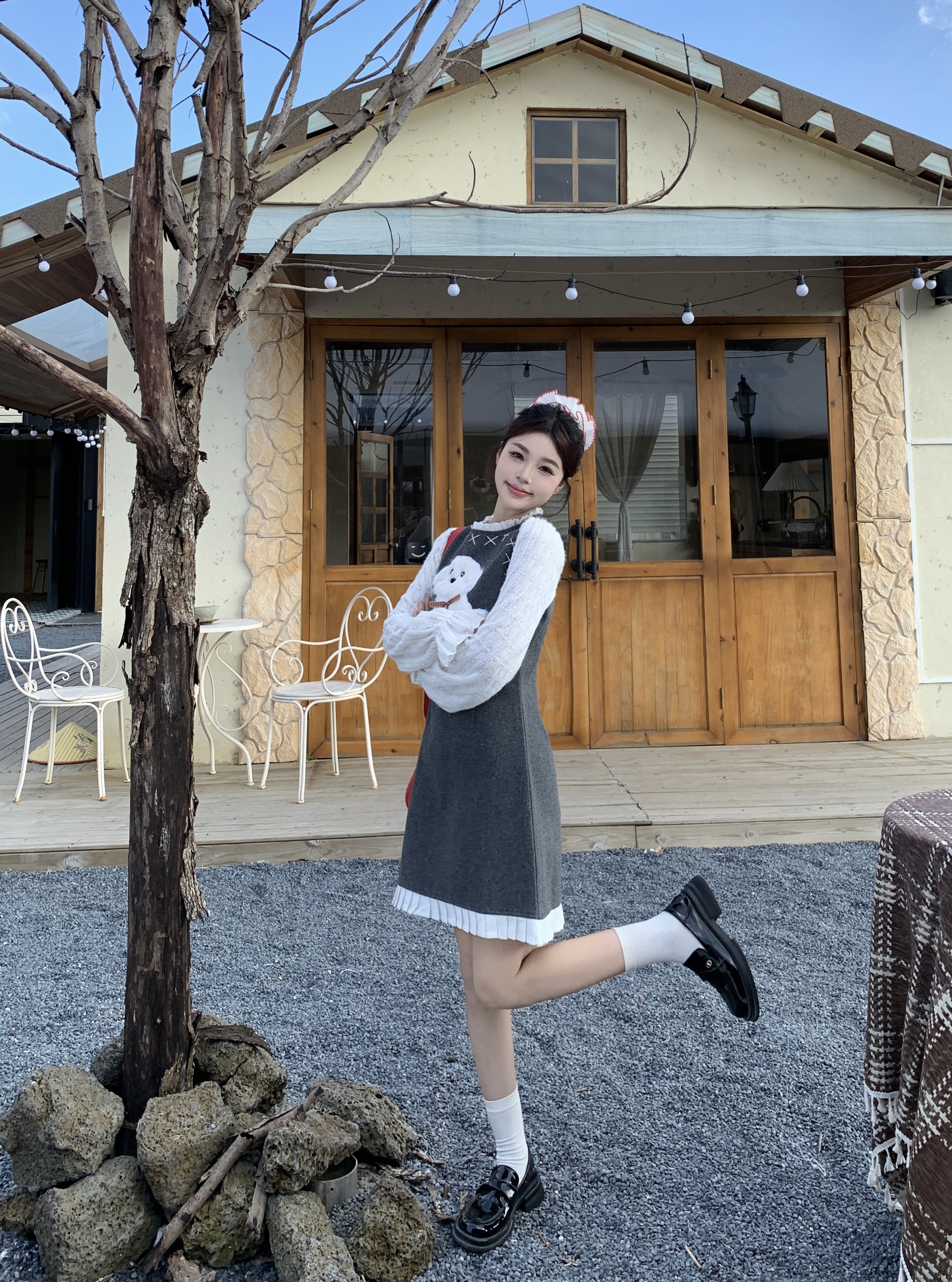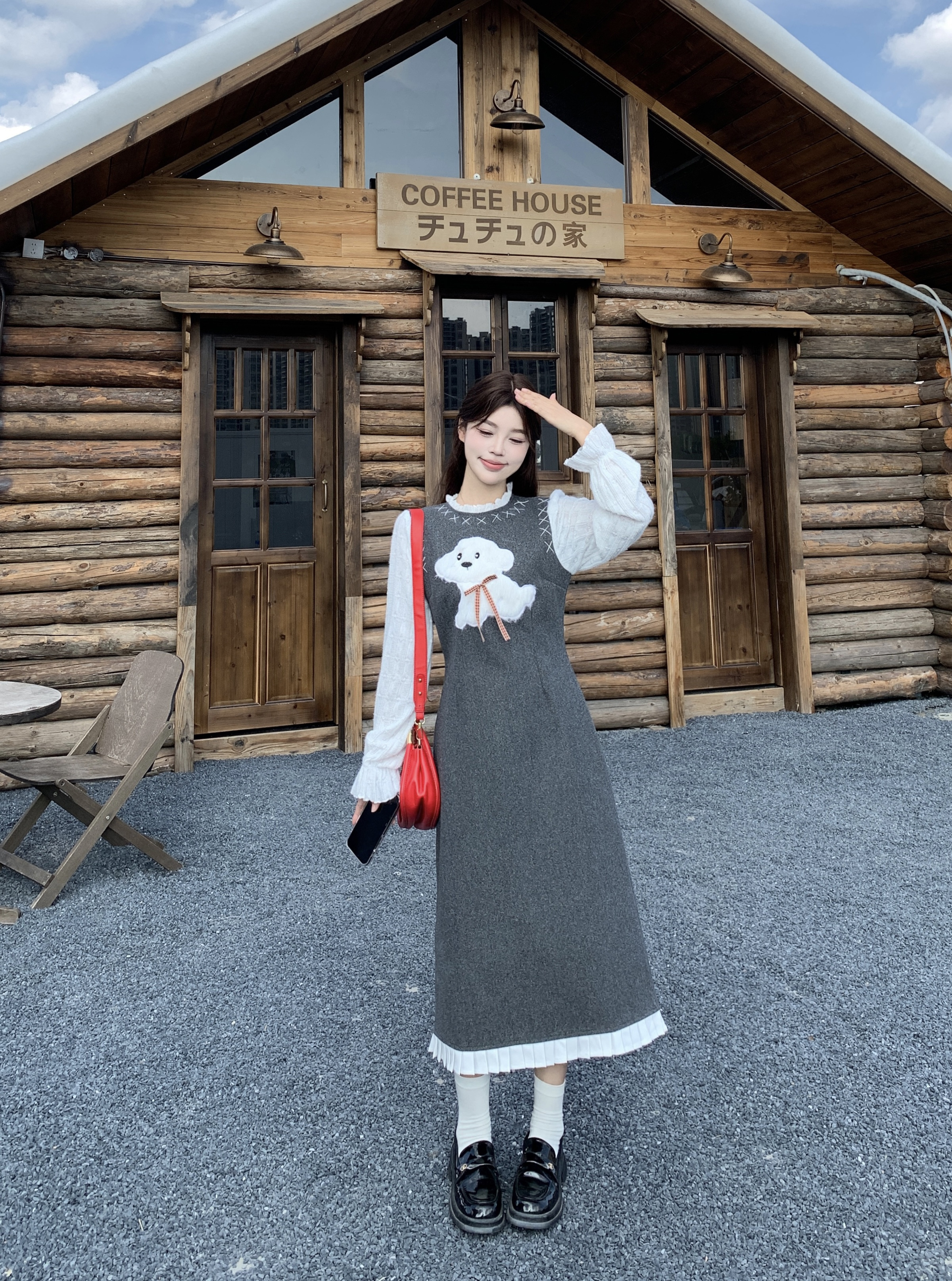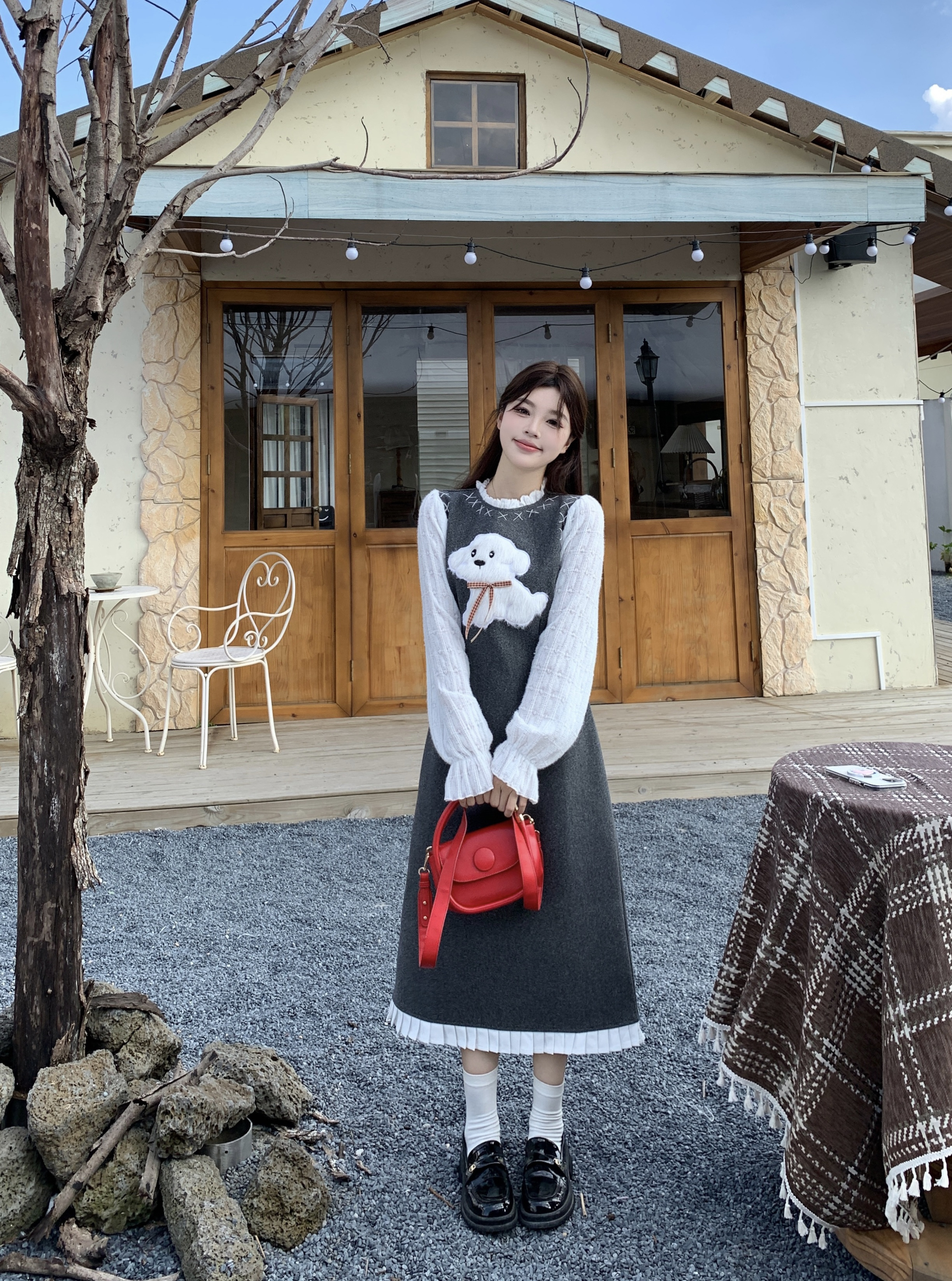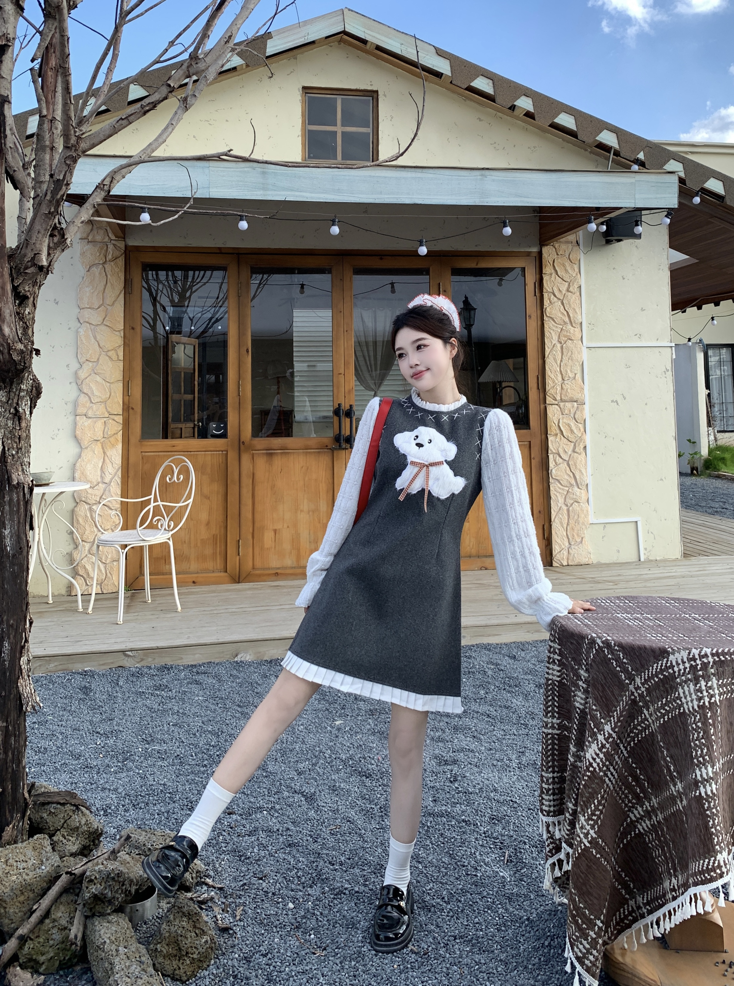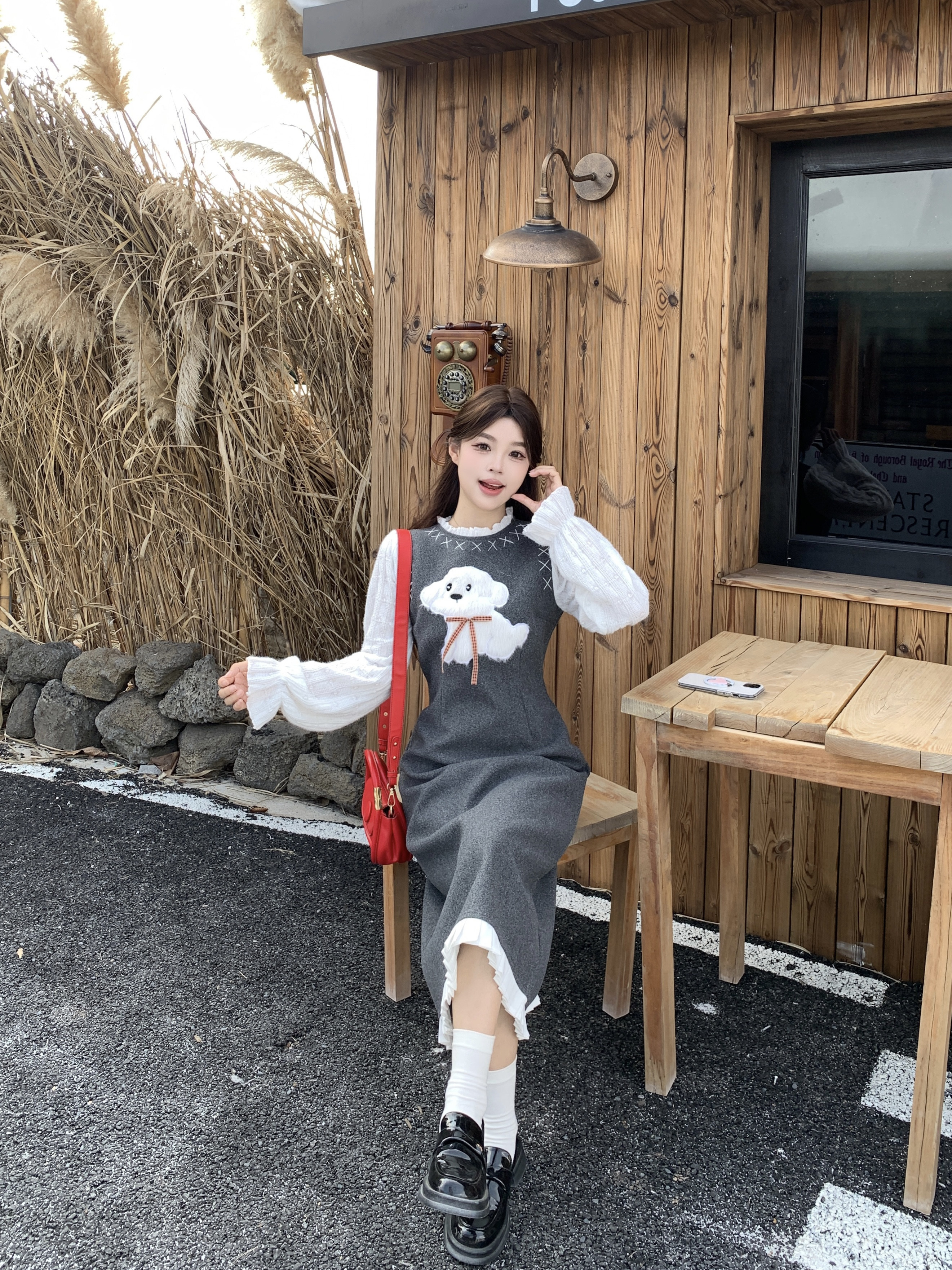 MY13737# 复古旋律大码女装微胖妹妹显瘦穿搭灰色小狗毛呢马甲假两件连衣裙女裝貨源服裝批發
