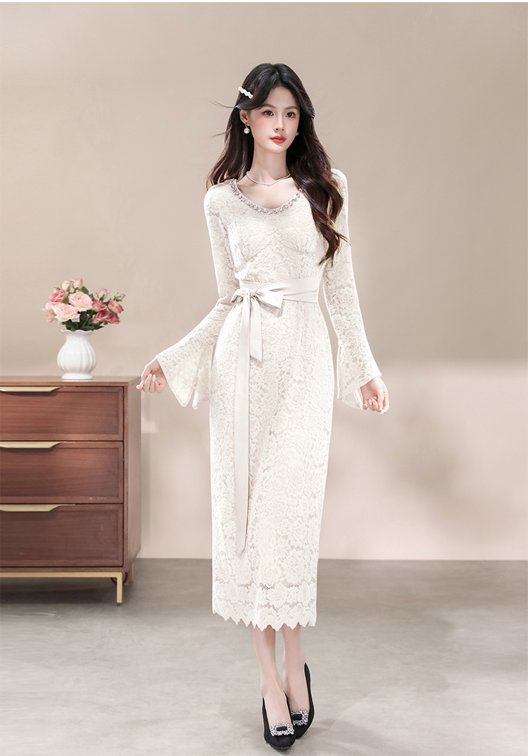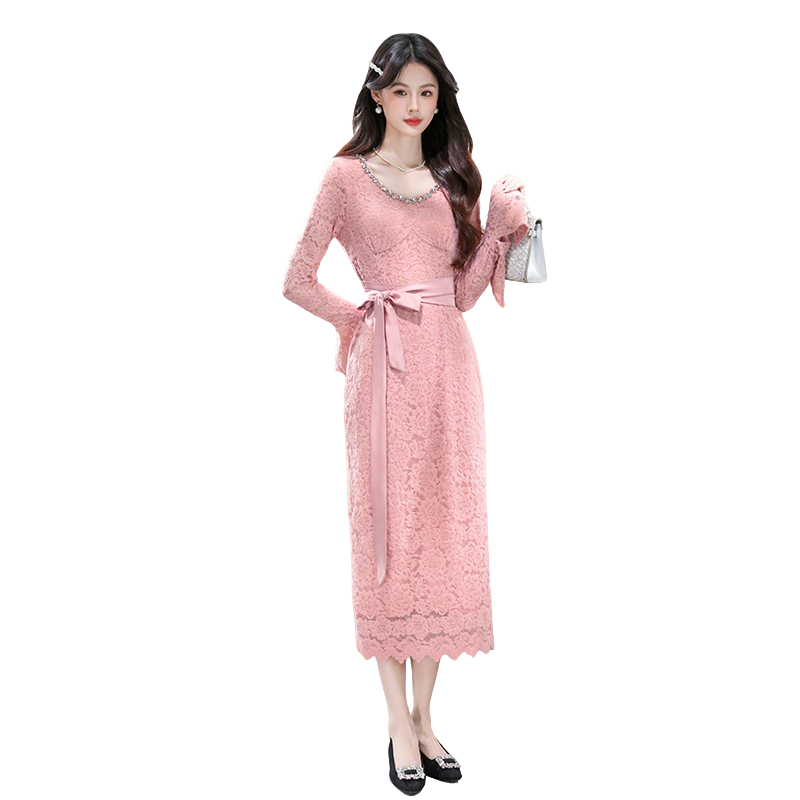 MY13742# 法式钉钻V领粉色蕾丝连衣裙高级感收腰气质长裙女女裝貨源服裝批發