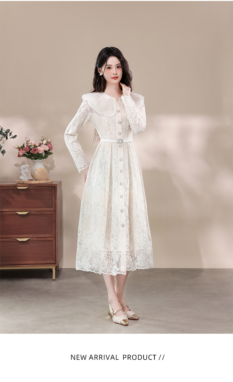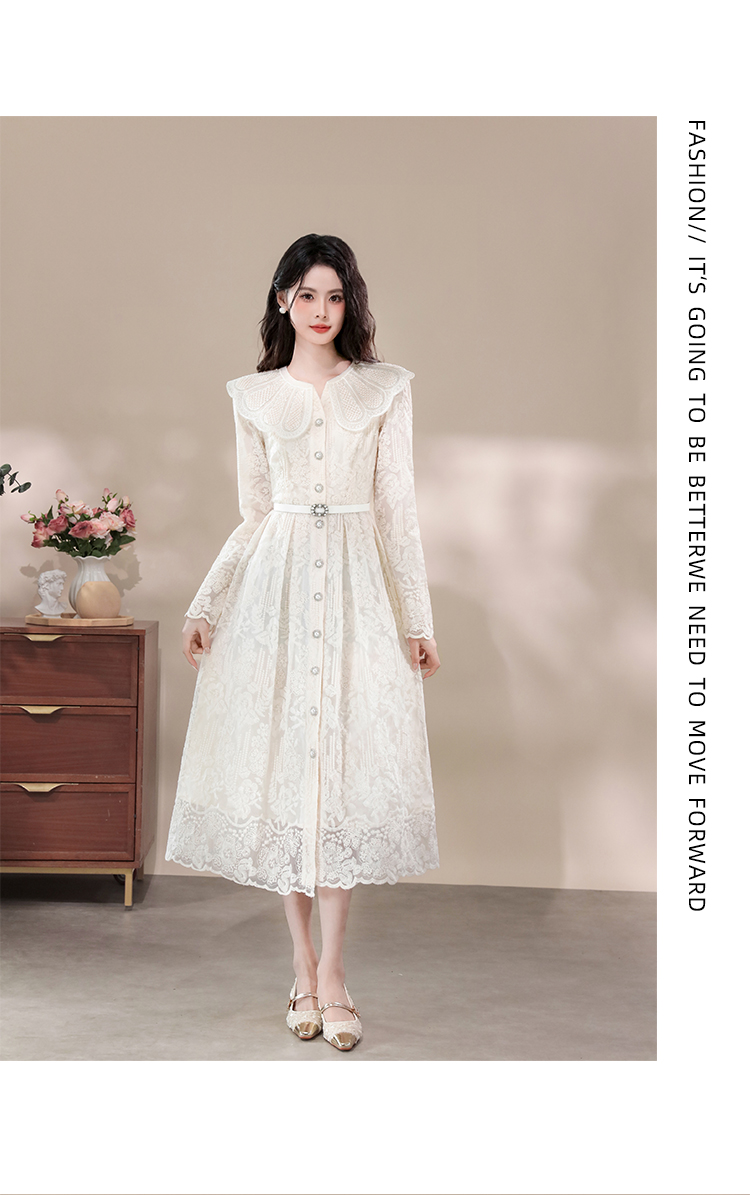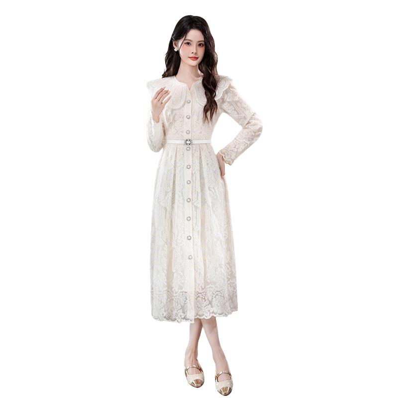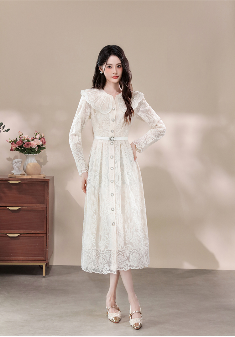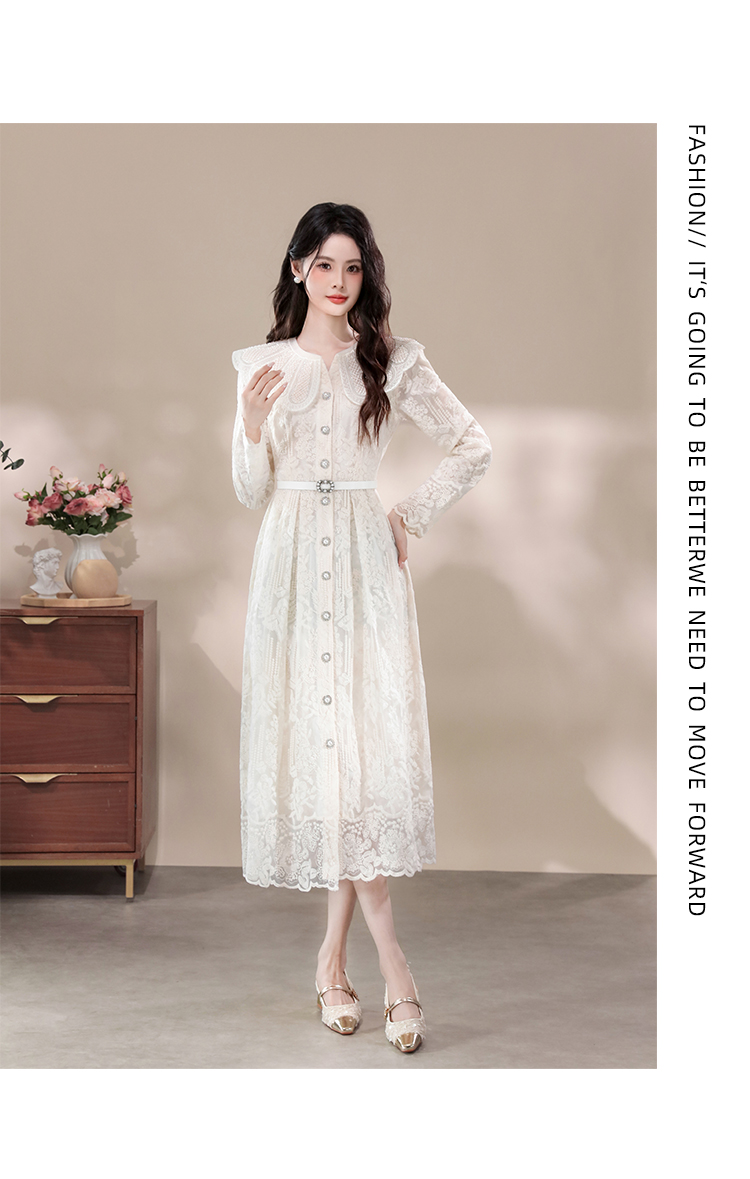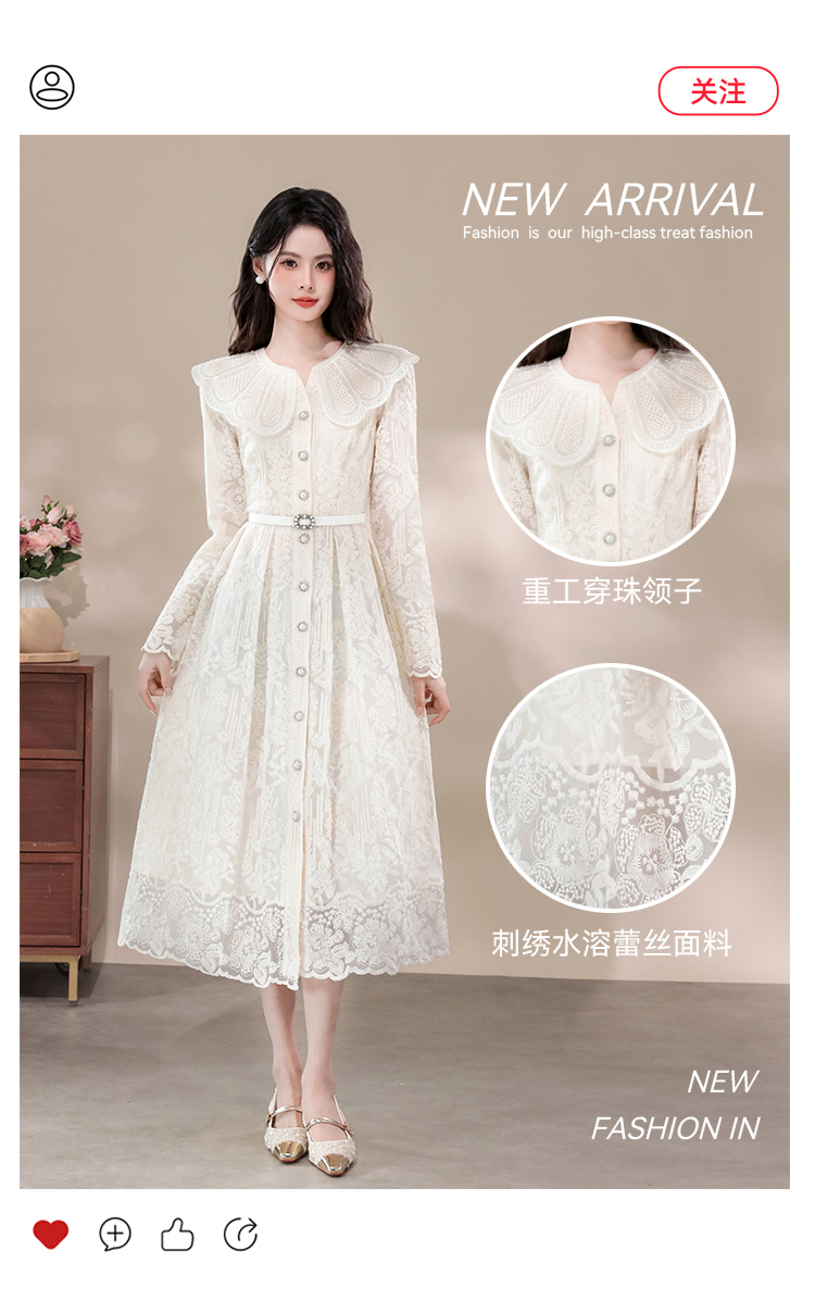 MY13745# 高级感重工镶钻娃娃领排扣收腰蕾丝刺绣连衣裙女裝貨源服裝批發