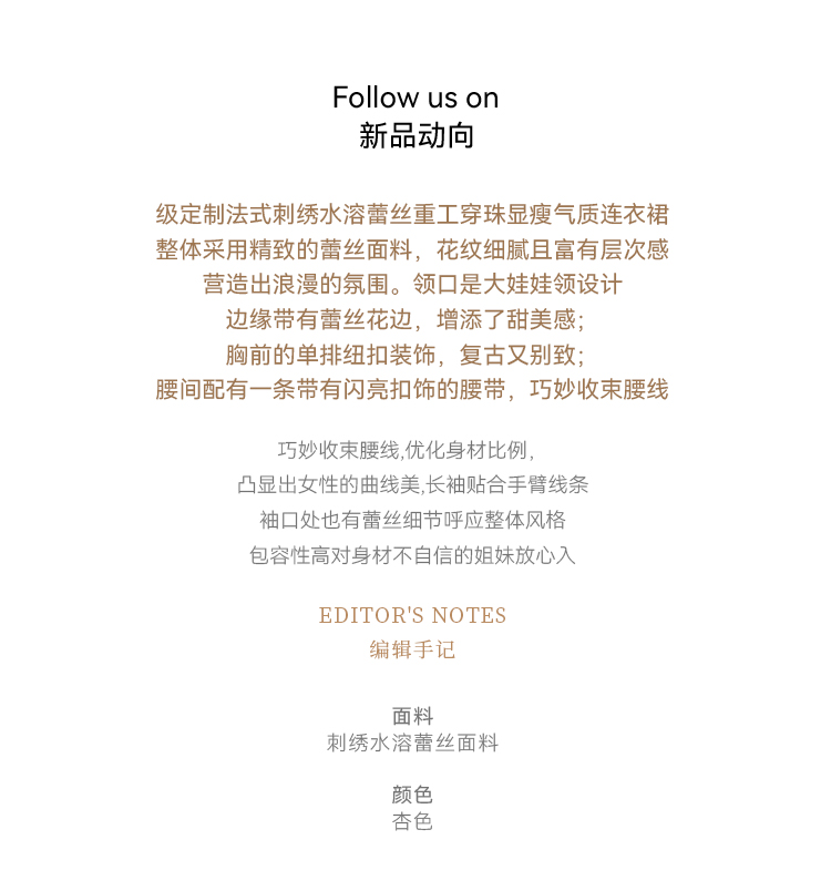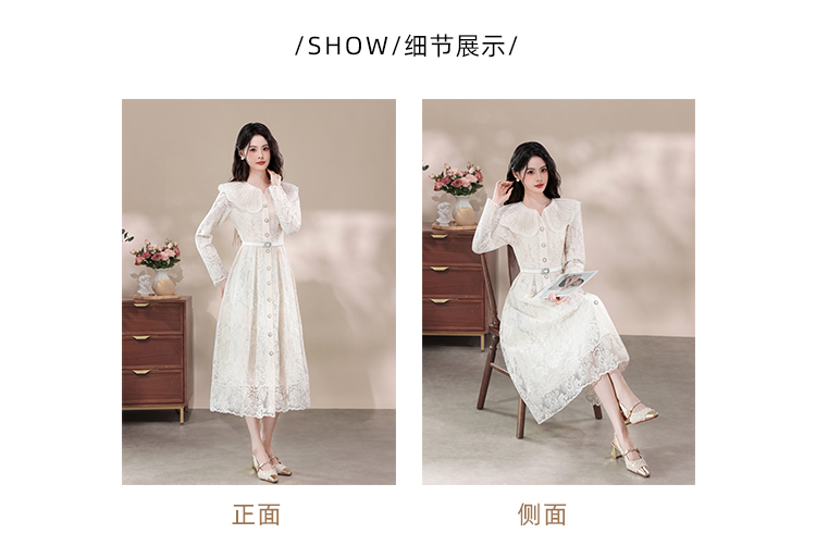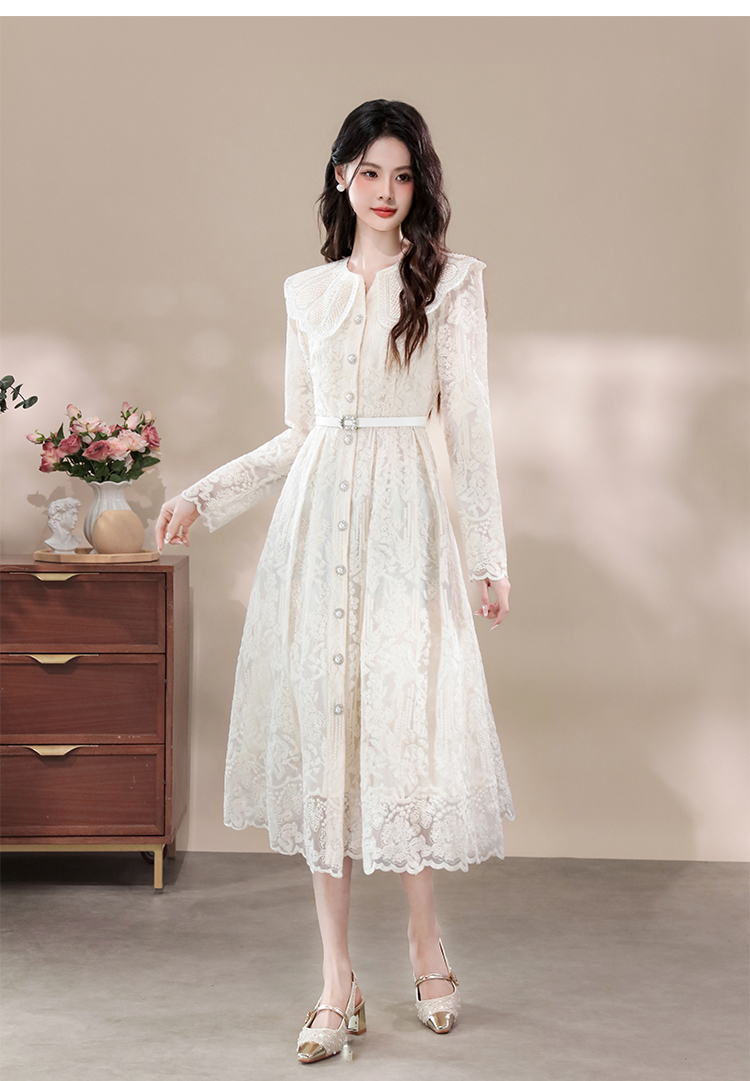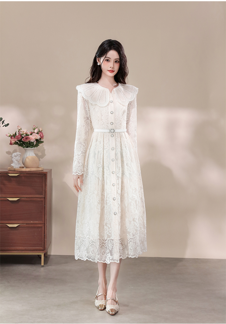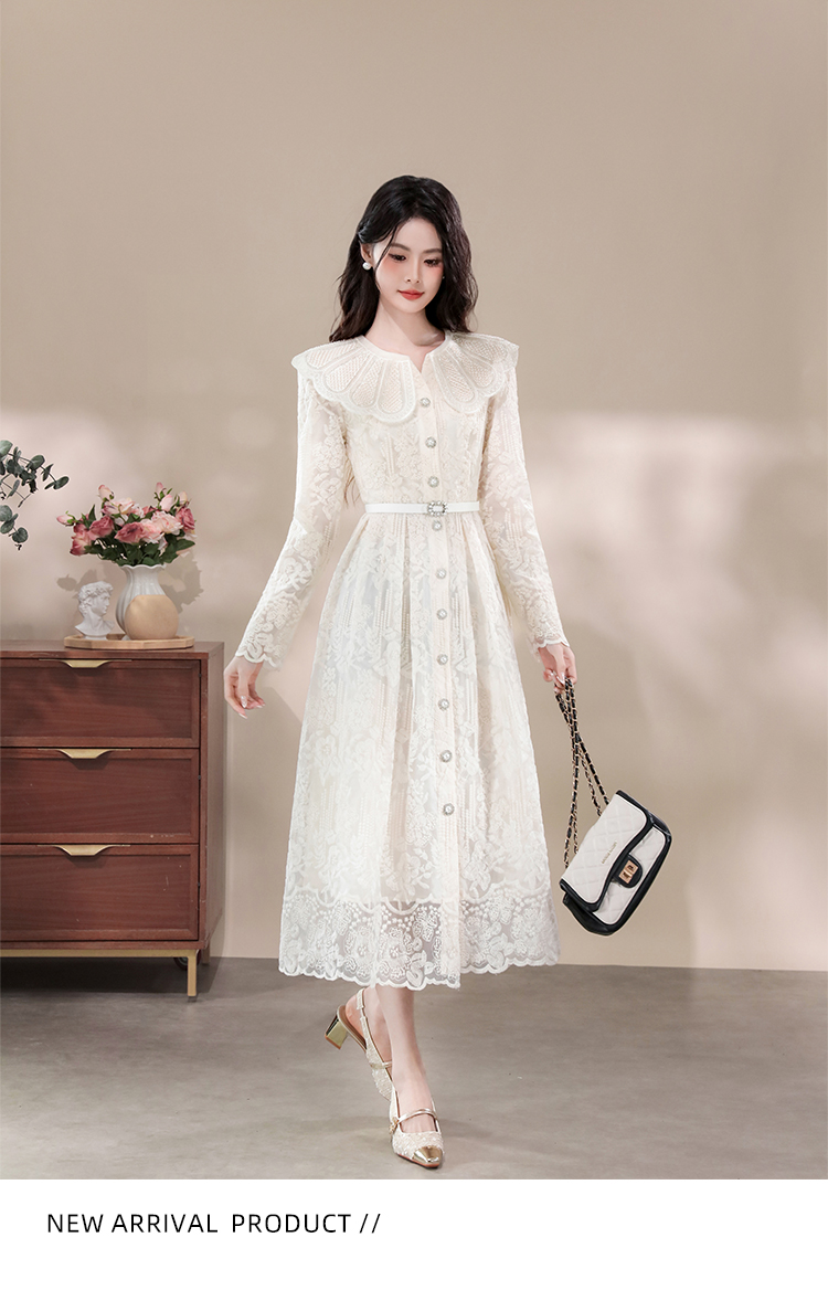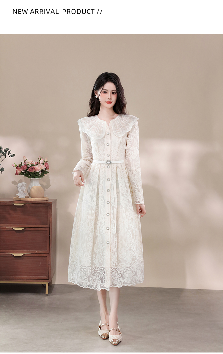 MY13745# 高级感重工镶钻娃娃领排扣收腰蕾丝刺绣连衣裙女裝貨源服裝批發