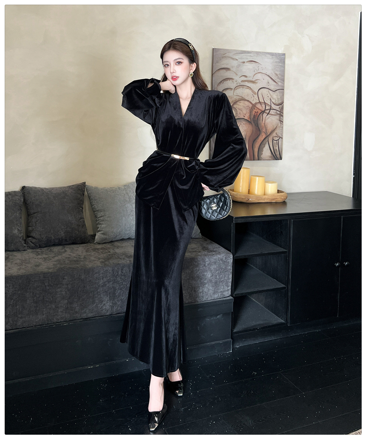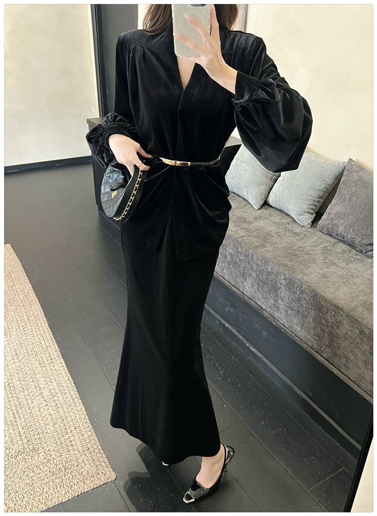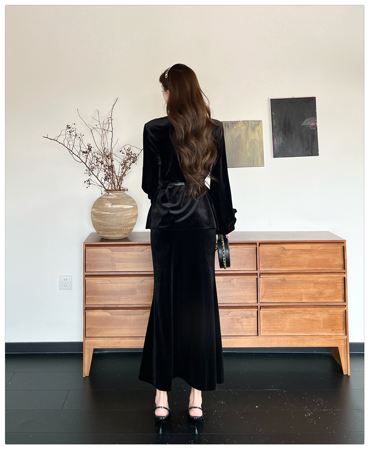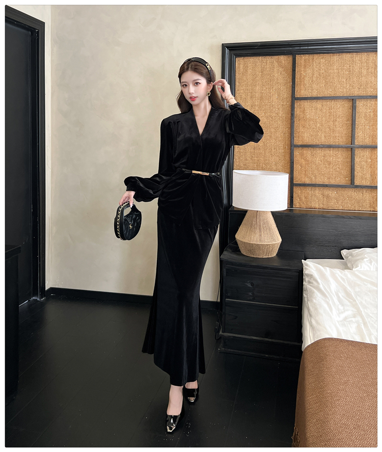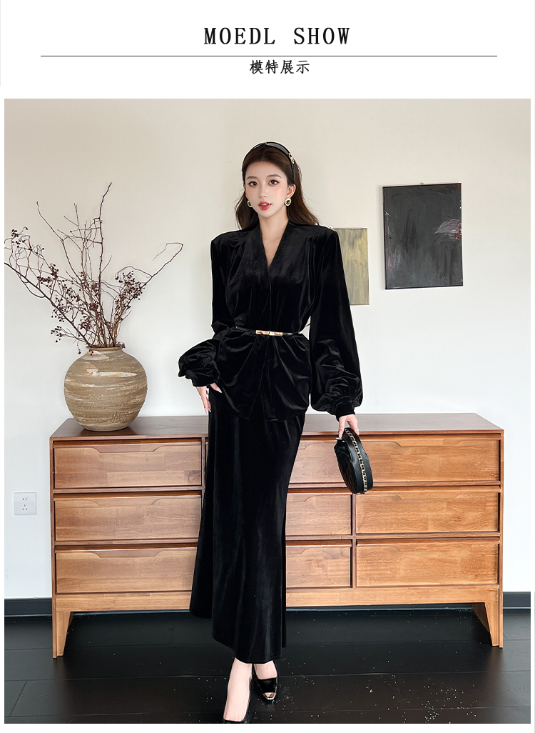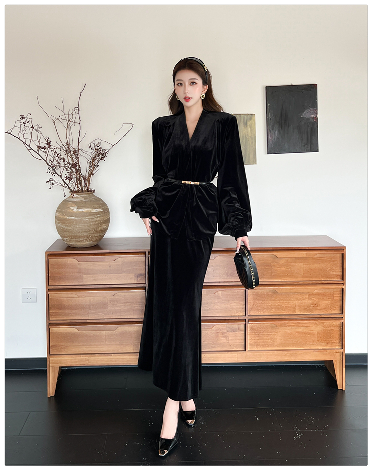 MY13748# 时尚气质优雅轻熟风v领丝绒上衣+半身裙时尚套装配腰带三件套女冬女裝貨源服裝批發