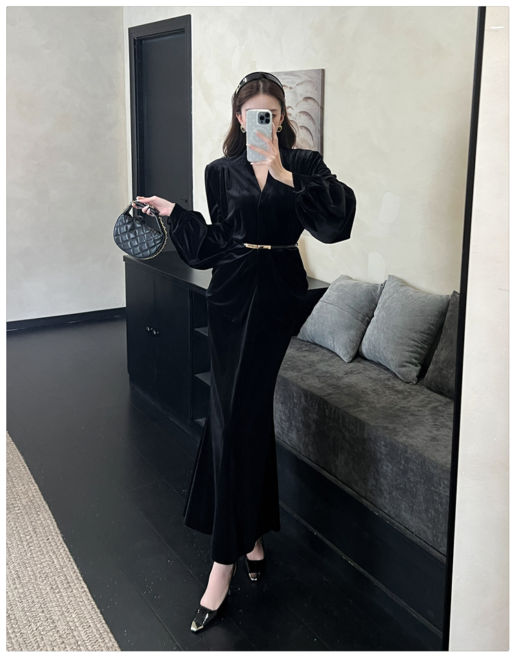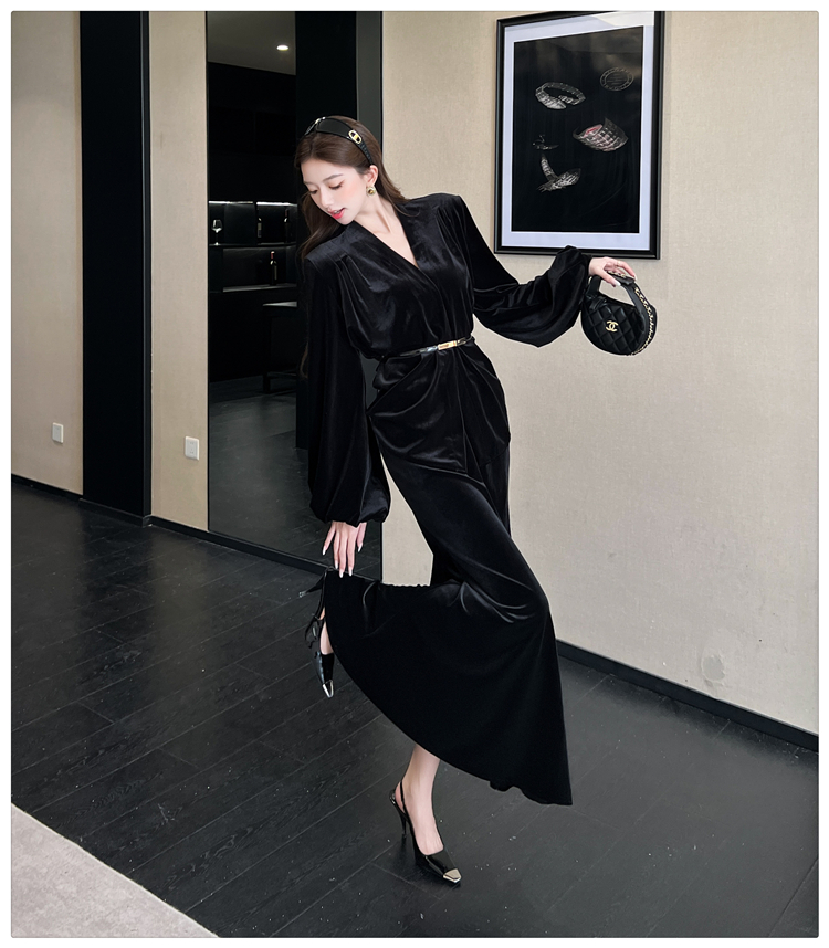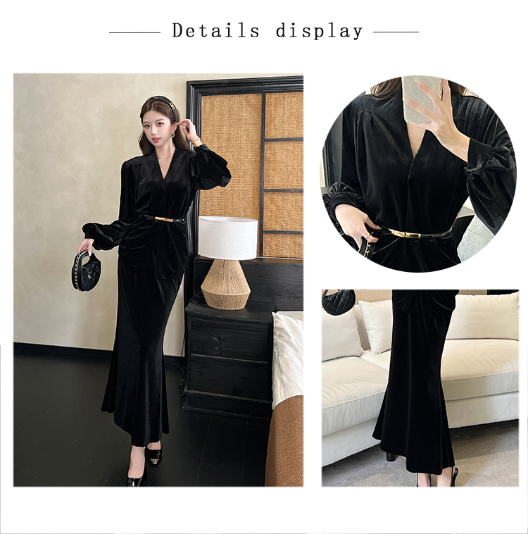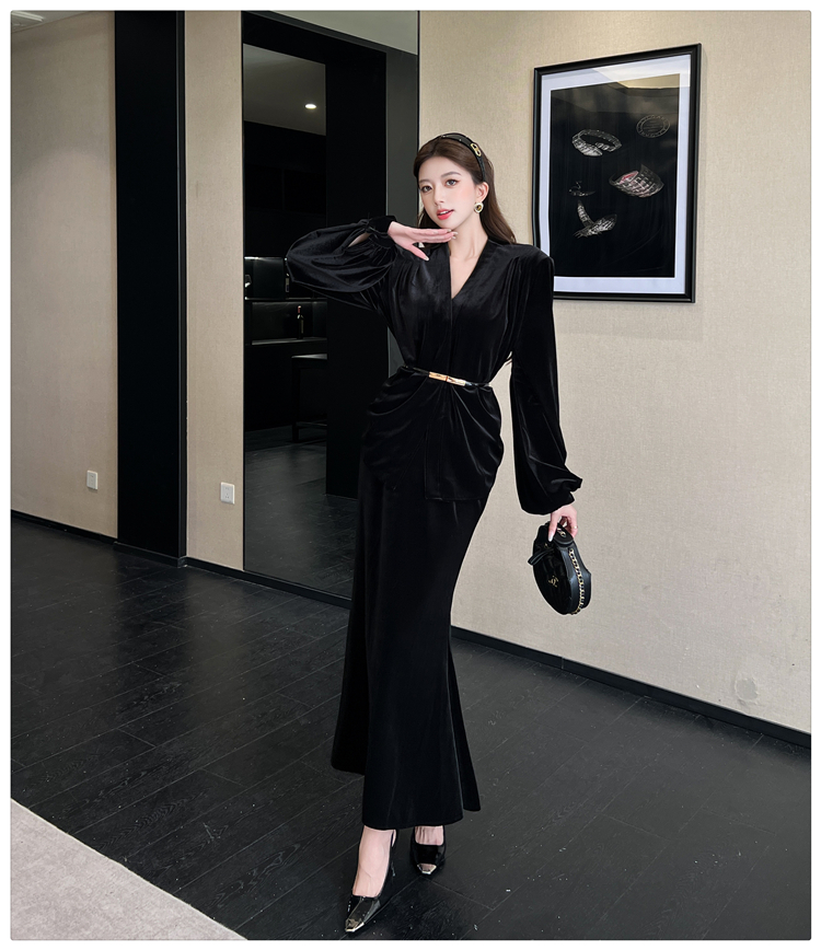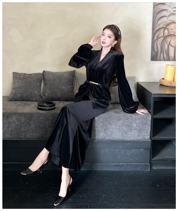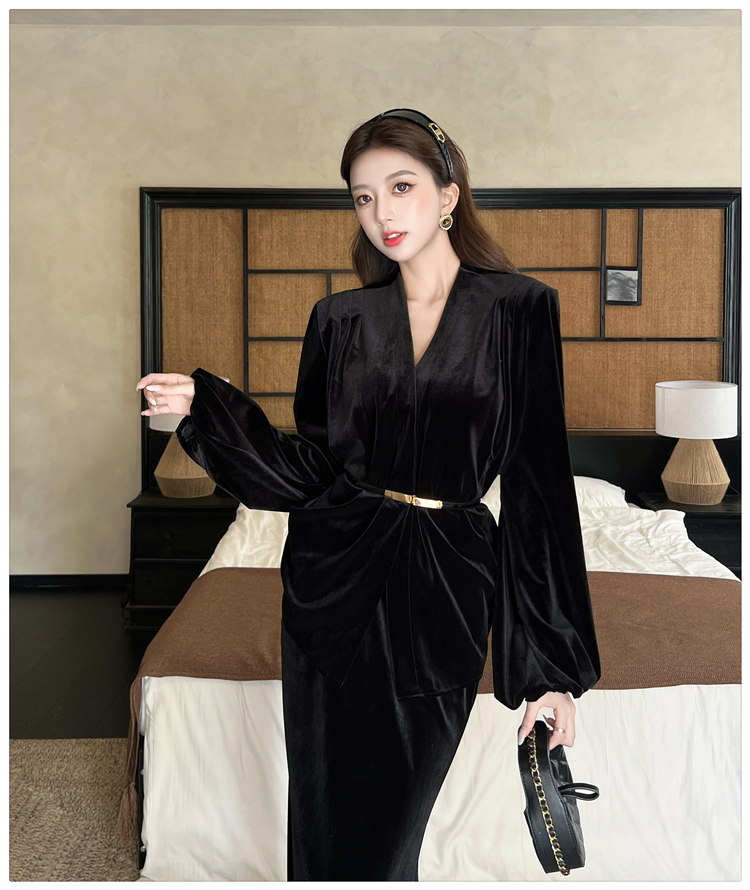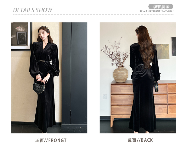 MY13748# 时尚气质优雅轻熟风v领丝绒上衣+半身裙时尚套装配腰带三件套女冬女裝貨源服裝批發