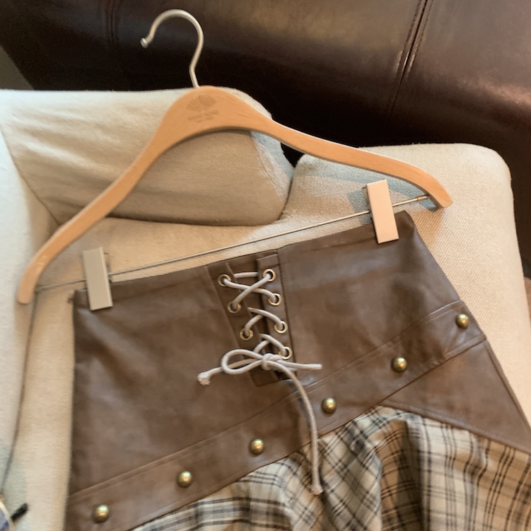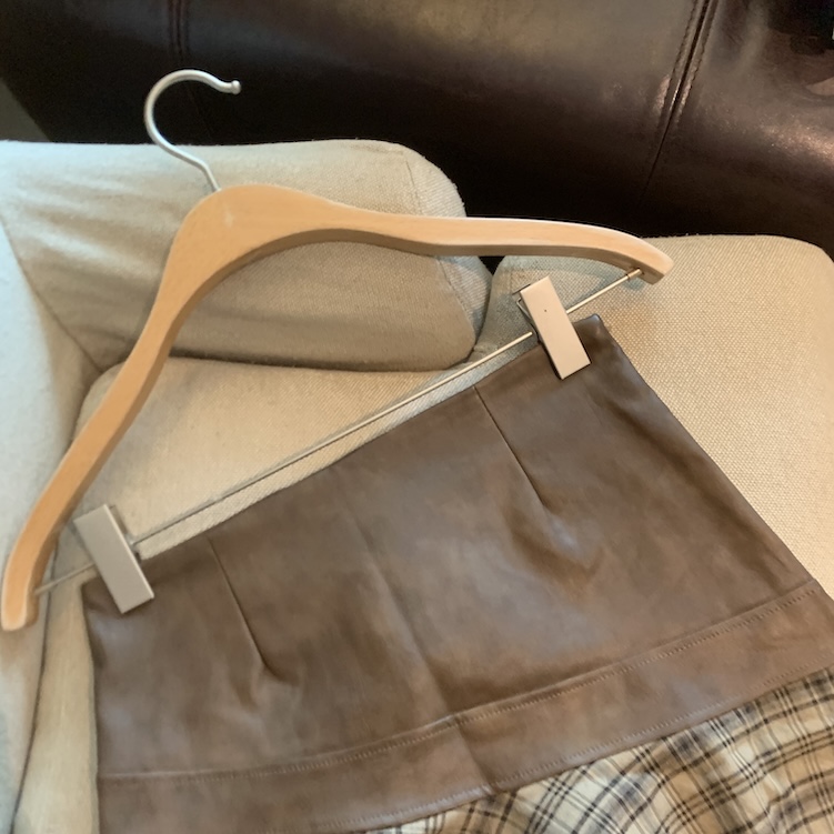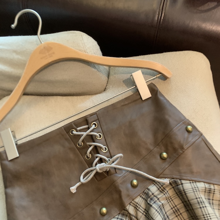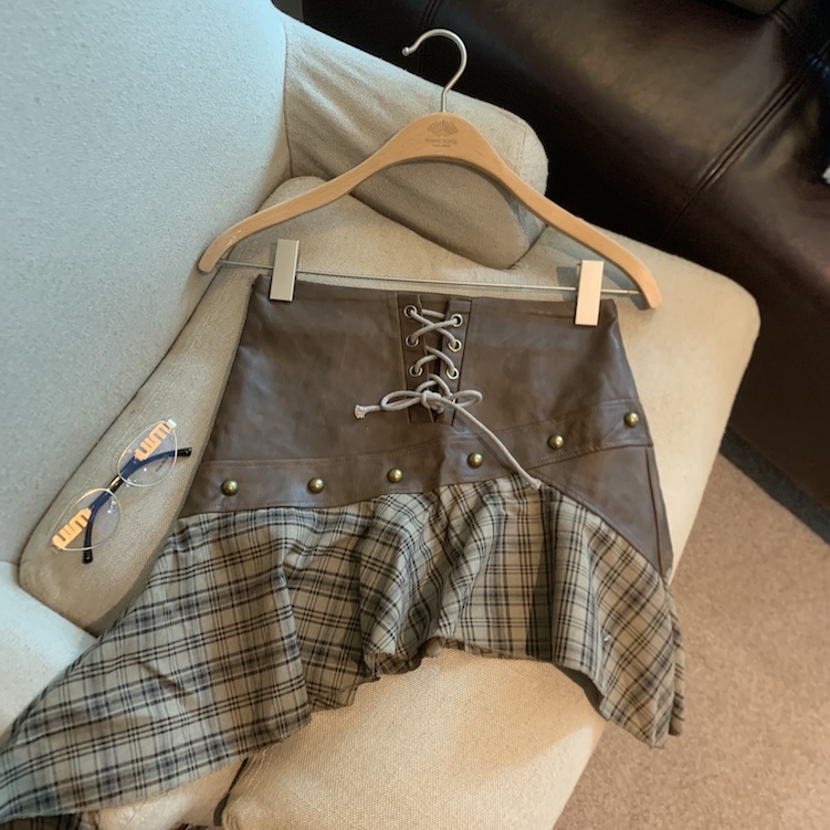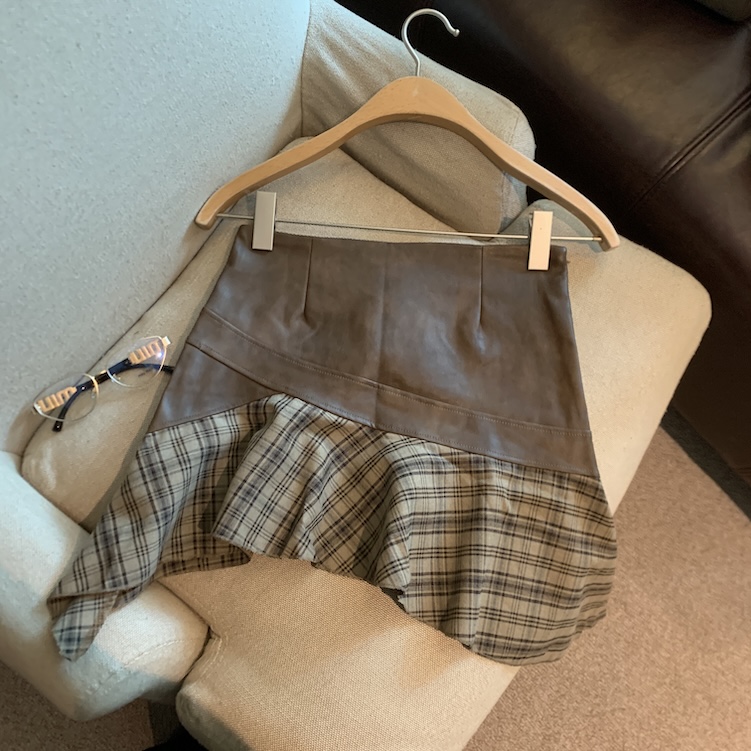 MY13752# 复古格子拼pu皮裙子女裝貨源服裝批發