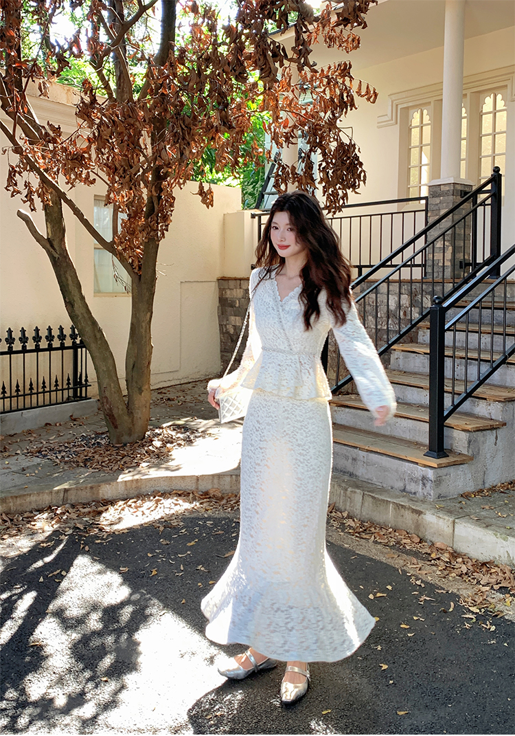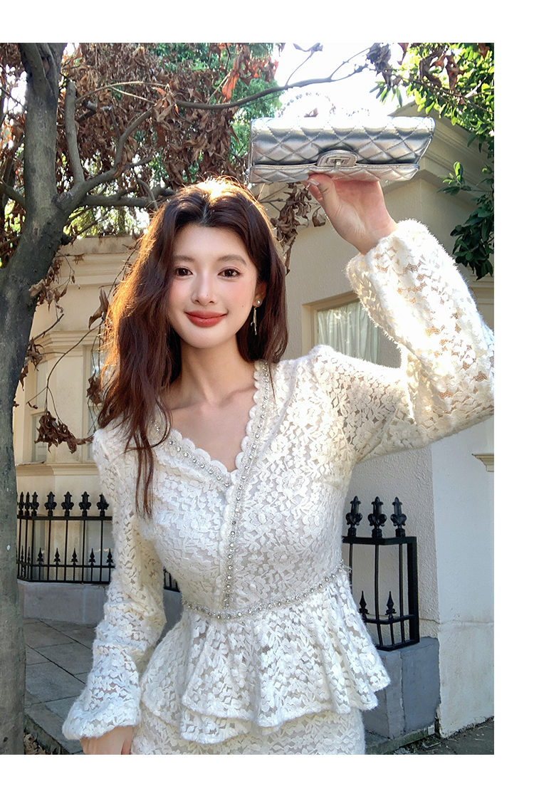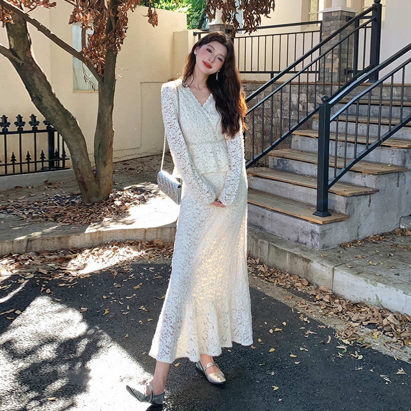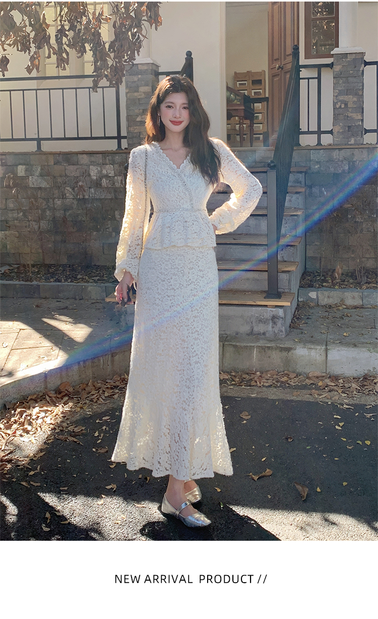 MY13837# 女裝貨源新款韩系温柔风V领镶钻蕾丝长袖上衣鱼尾裙套装女裝貨源服裝批發服裝批發