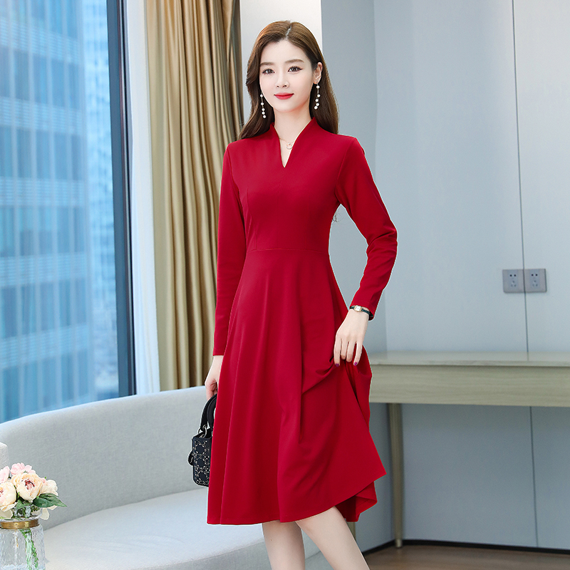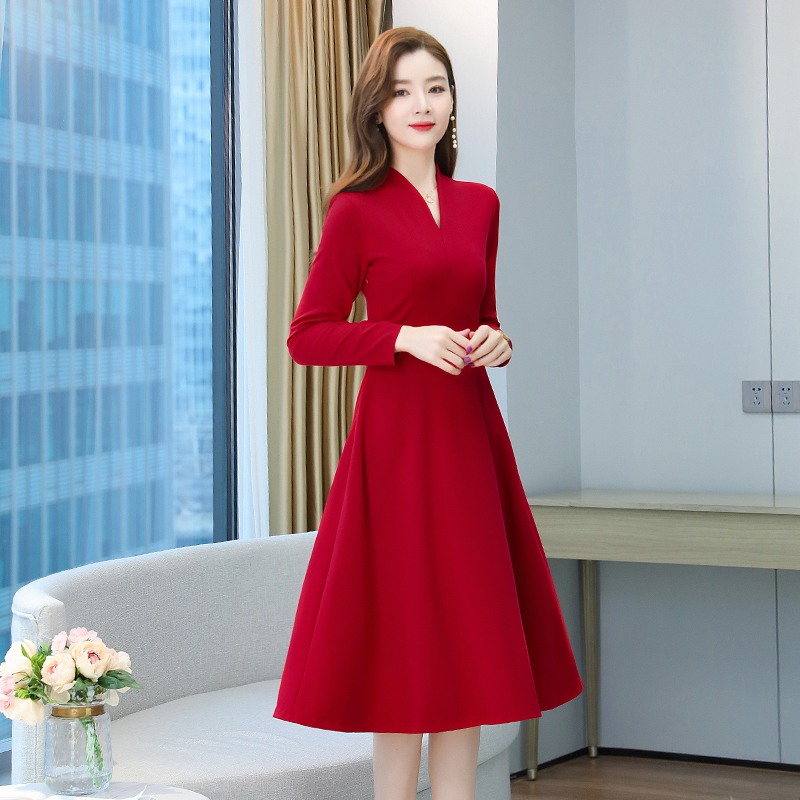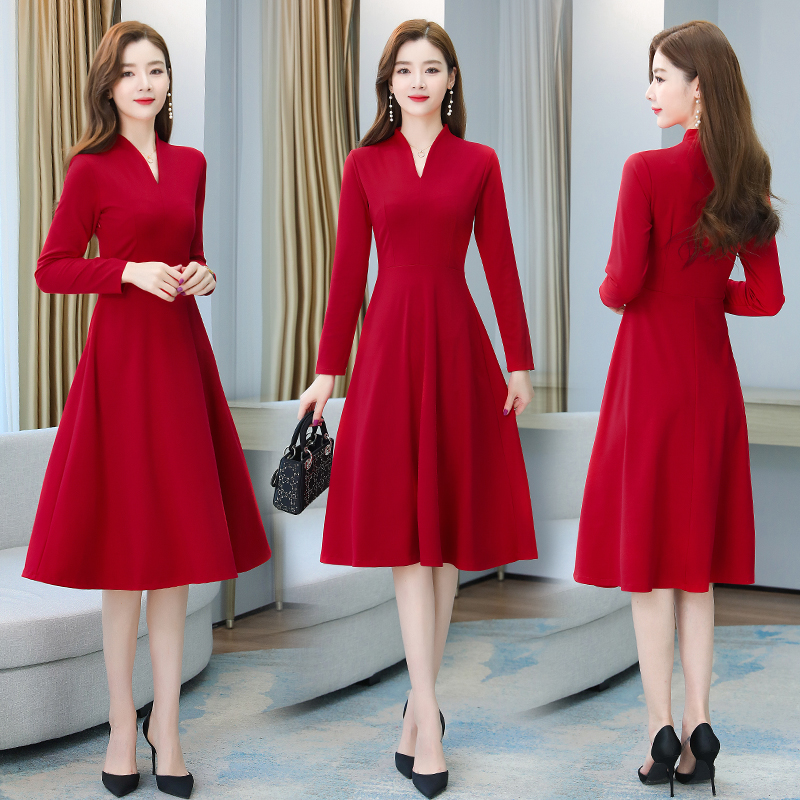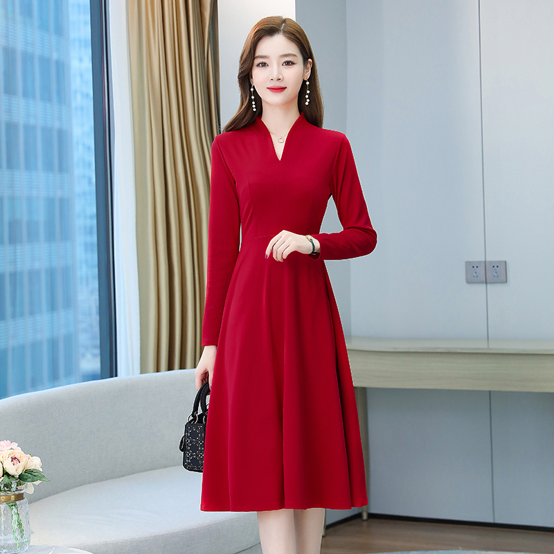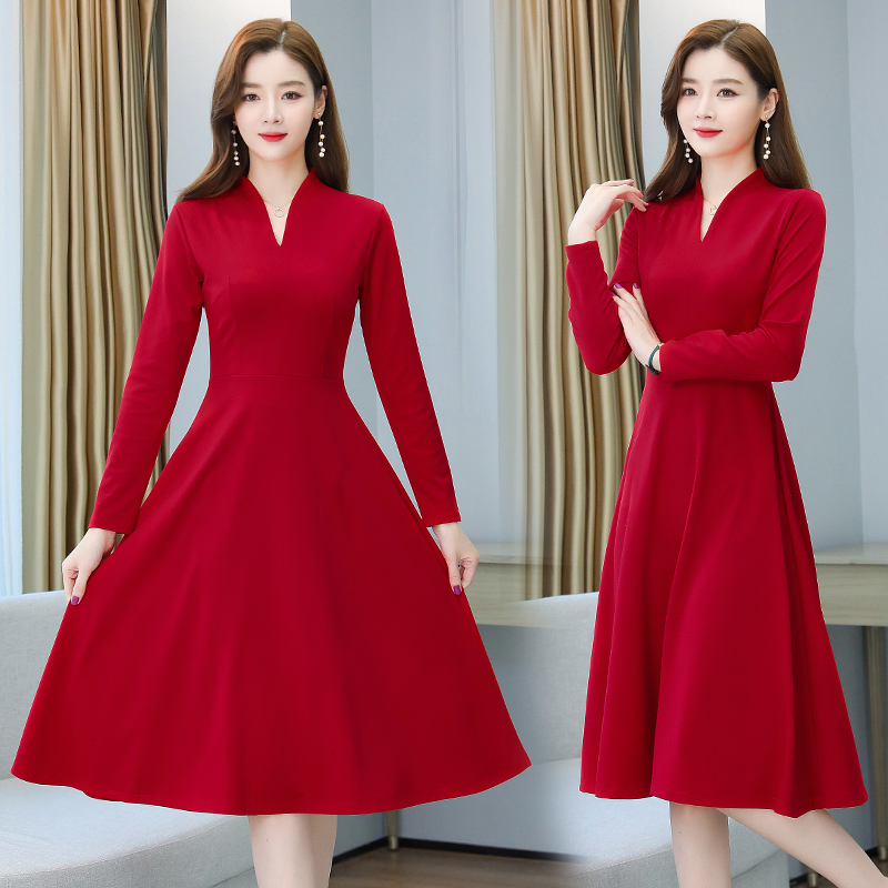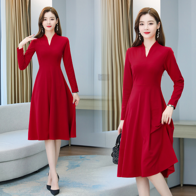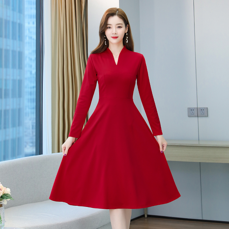 MY13913# 大码红色高级感法式v领裙子女胖mm显瘦收腰赫本风针织连衣裙女裝貨源服裝批發