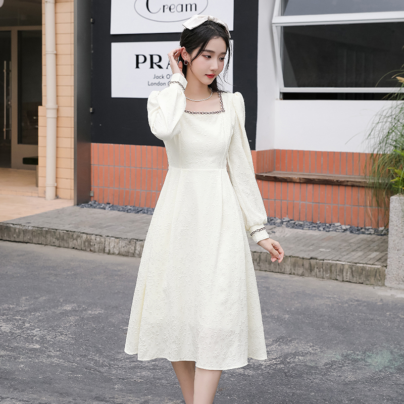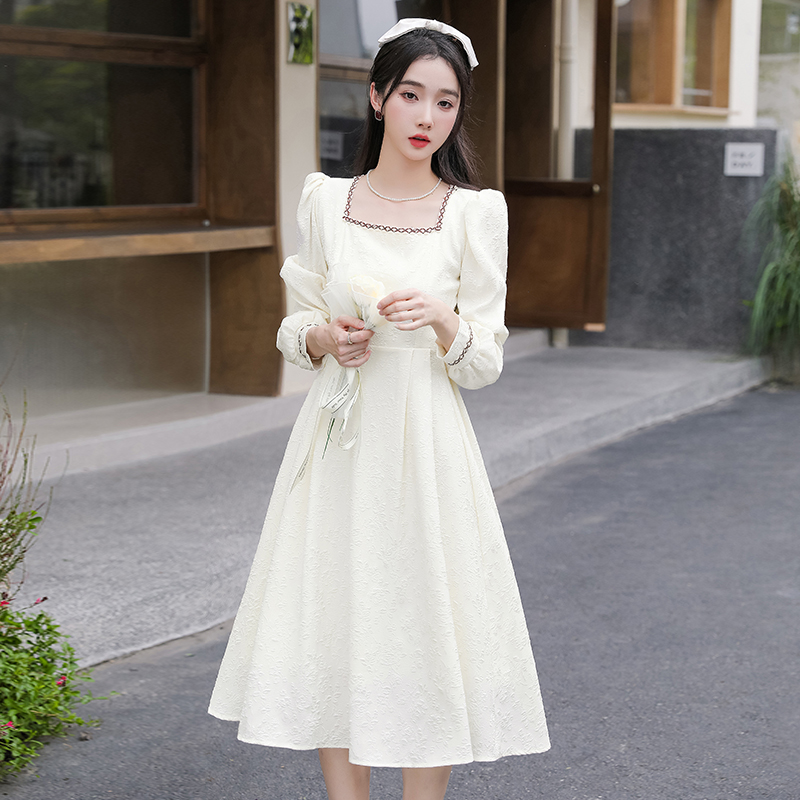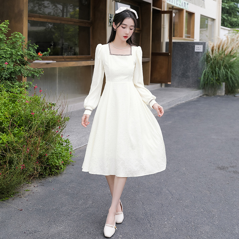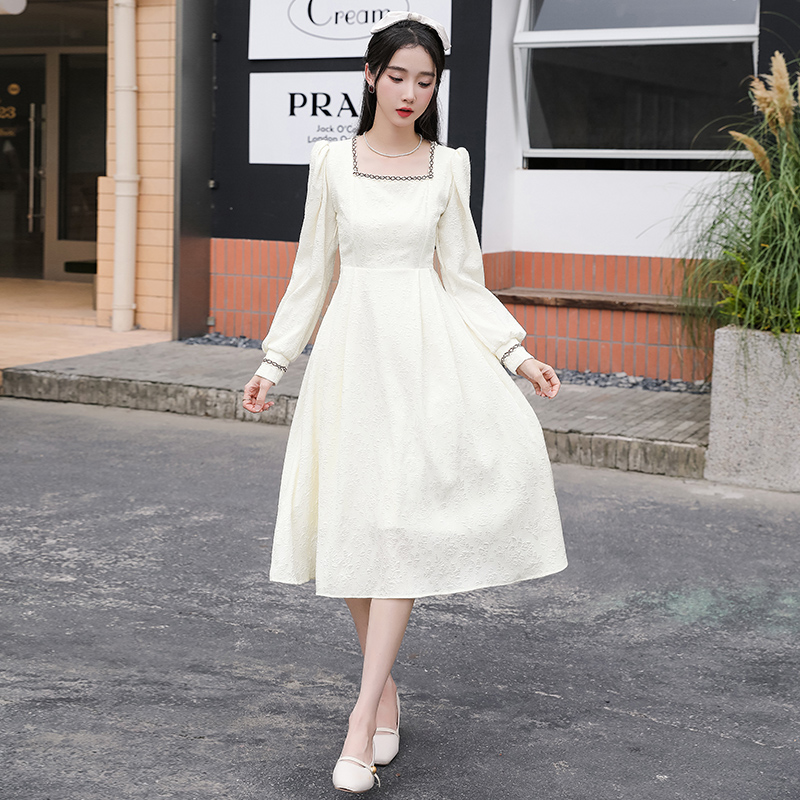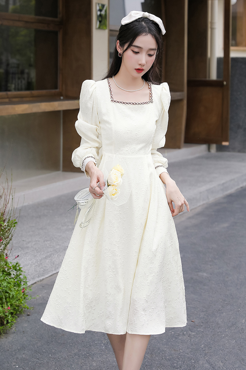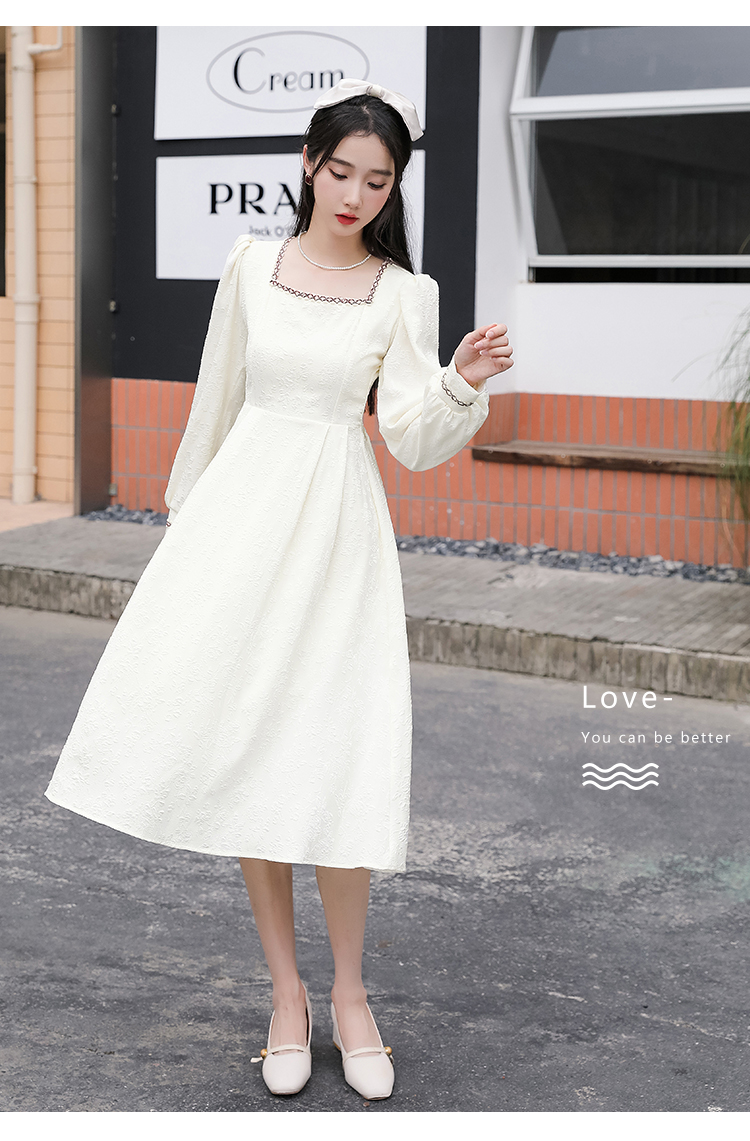 MY13914# 大码法式温柔风杏色方领花边连衣裙高级感收腰显瘦气质长裙女裝貨源服裝批發